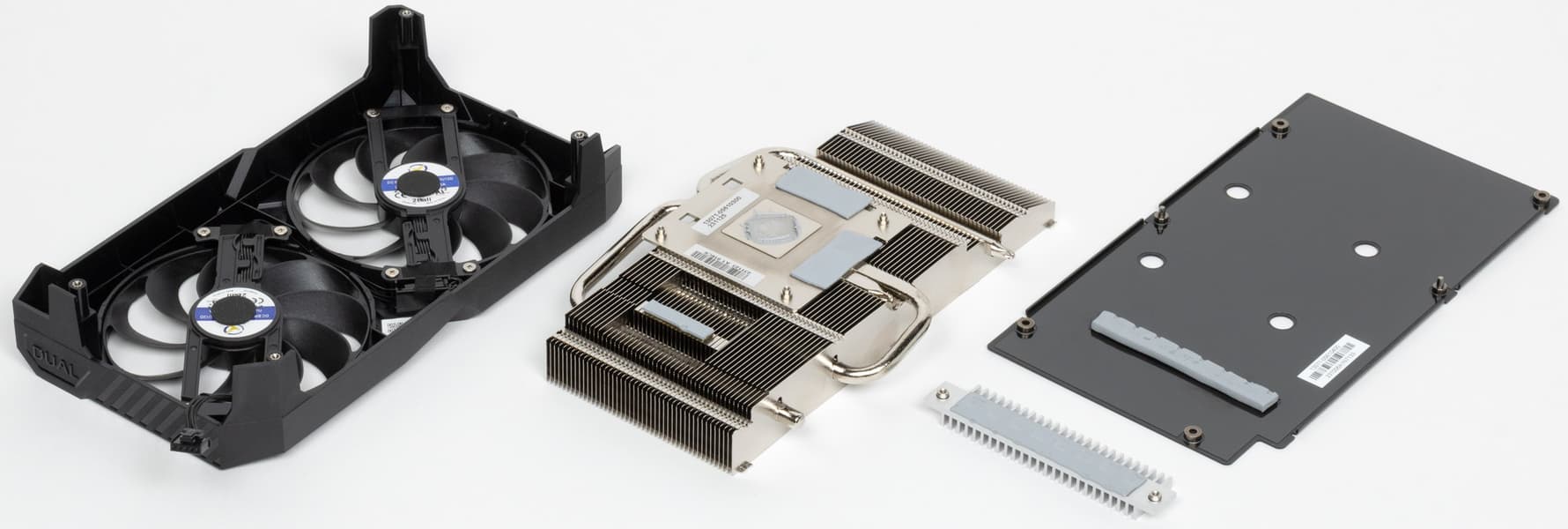Этот же радиатор служит охладителем и для микросхем памяти через термоинтерфейс. Охлаждаются и компоненты преобразователей питания VRM (через дополнительные мини-радиаторы).