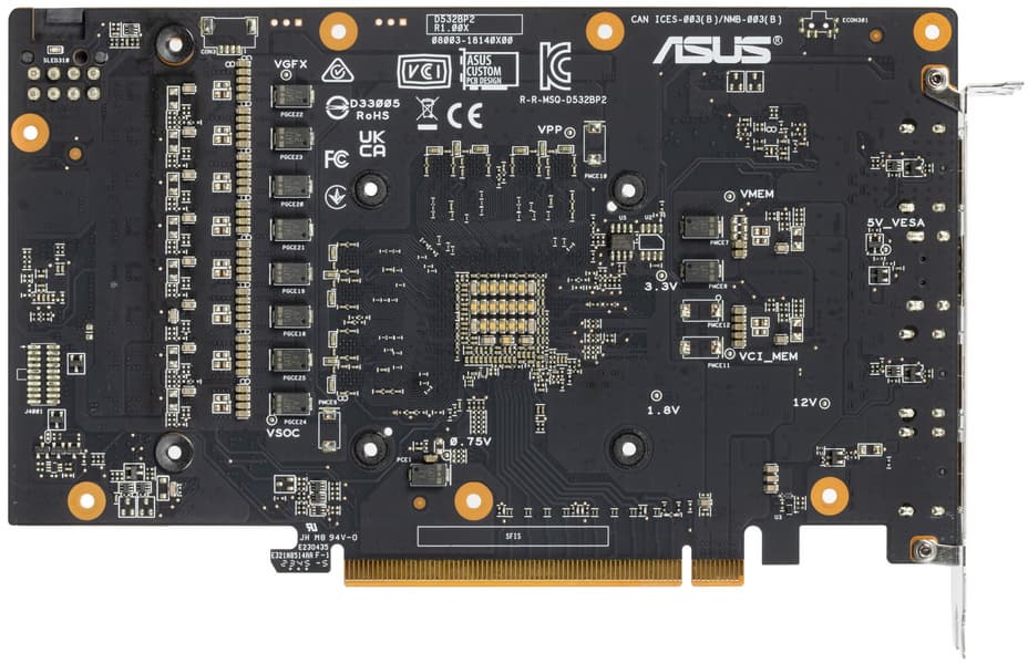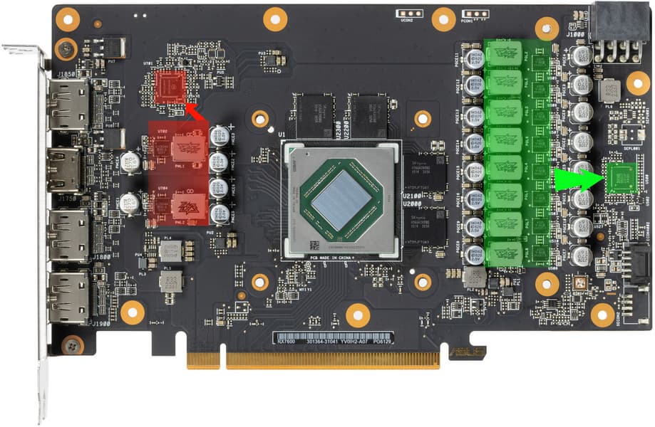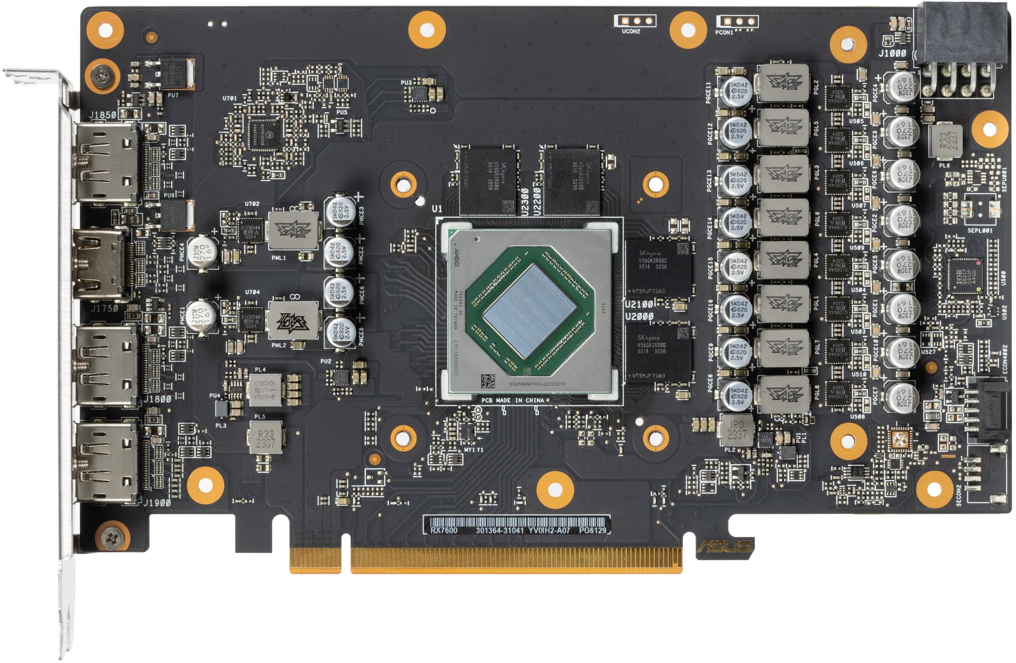 Мы сравниваем эту карту с аналогичной моделью иного производителя по простой причине: референс-карты AMD у нас нет, а первой картой на базе Radeon RX 7600 в нашей лаборатории была эта модель Gigabyte. Мы видим, что PCB в плане разводки схожи, однако у Asus плата заметно проще: она уже переделана именно под Radeon RX 7600, тогда как у Gigabyte это была практически PCB от Radeon RX 6600 XT/6650 XT.