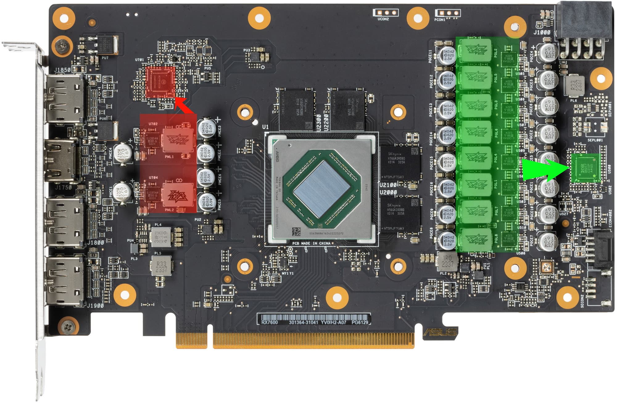 Зеленым цветом отмечена схема питания ядра, красным — памяти. Все ШИМ-контроллеры расположены на лицевой стороне PCB.