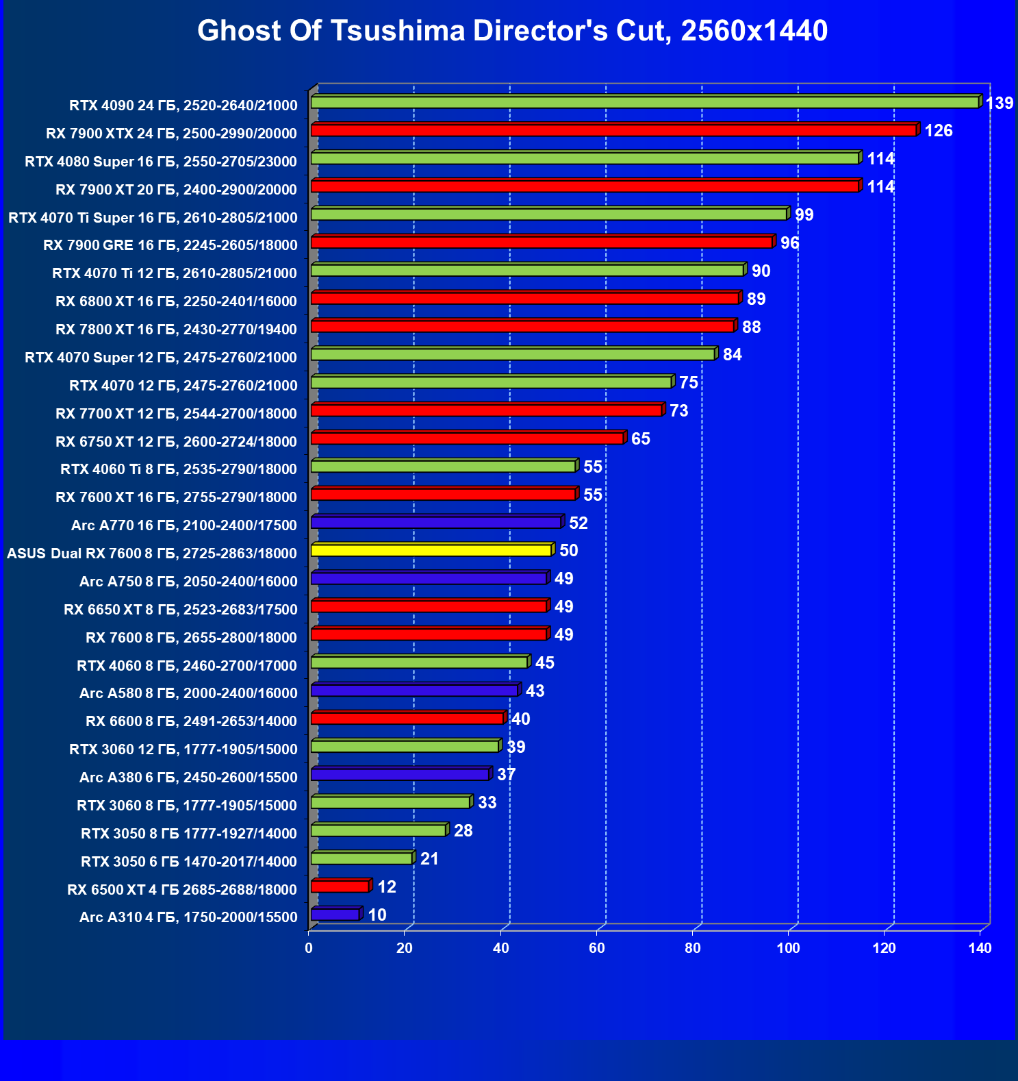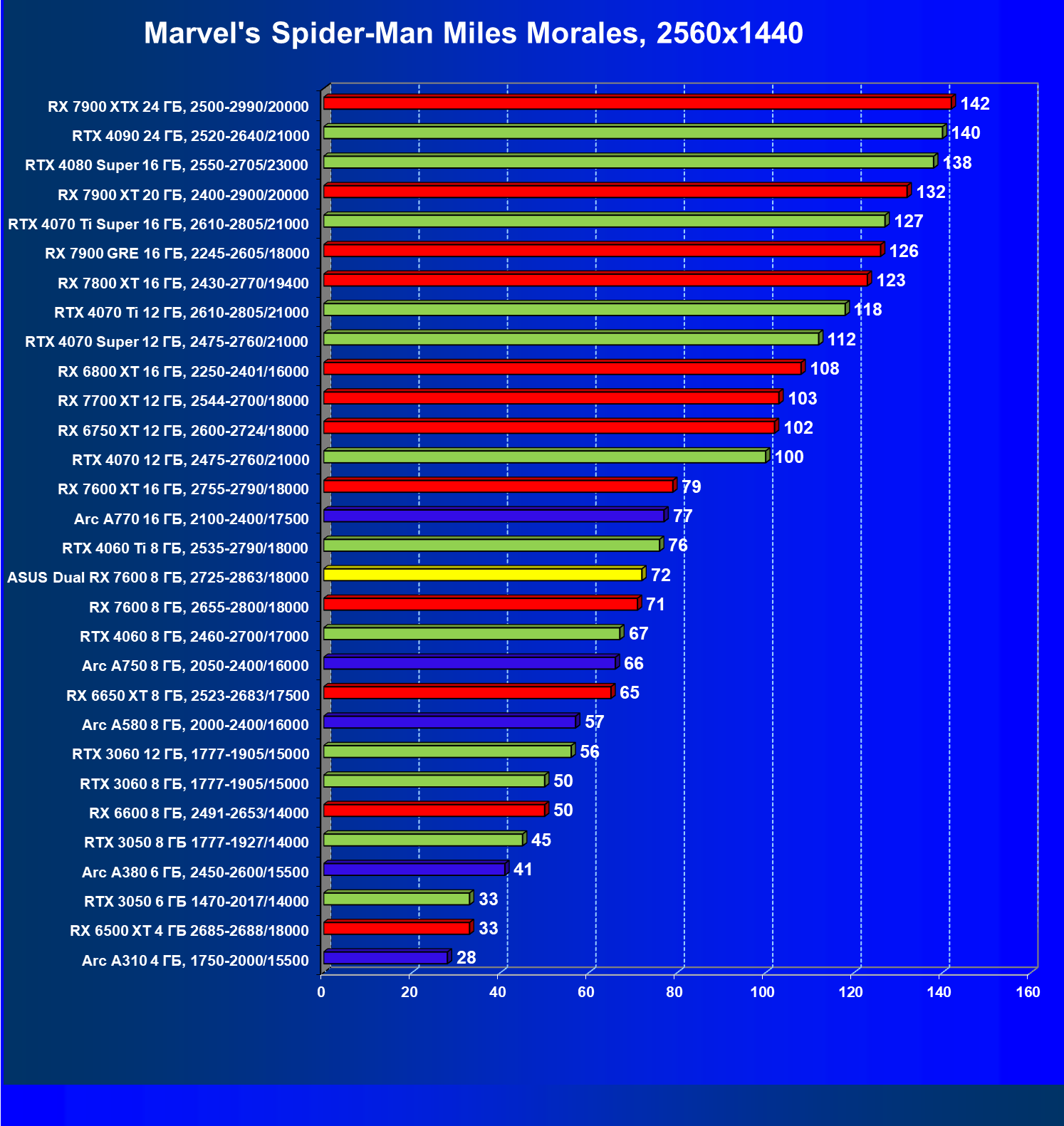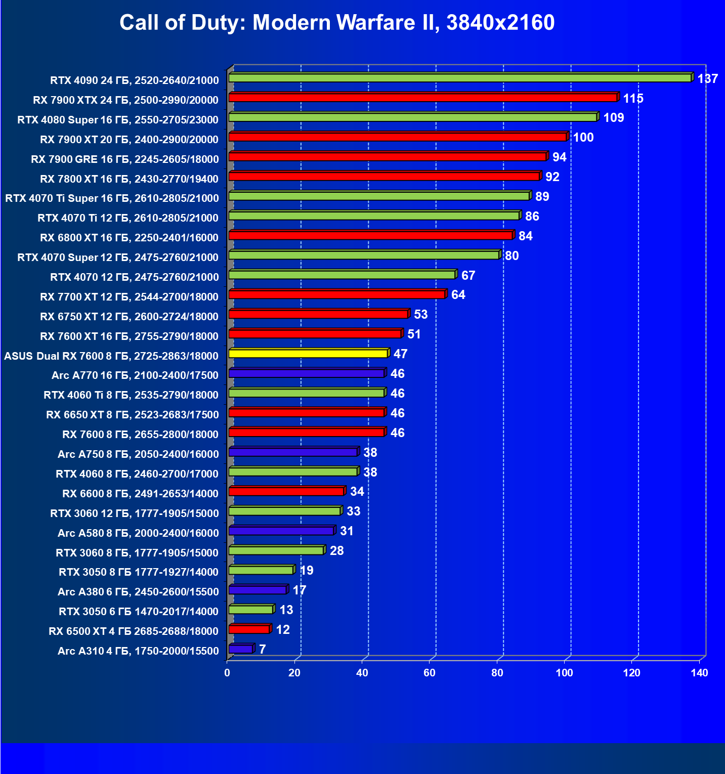 Референсный Radeon RX 7600 чуть-чуть проигрывает GeForce RTX 4060, а карта Asus логично находится чуть выше из-за фабрично поднятых частот работы. Мы видим, что Radeon RX 7600 в целом быстрее не только предшественника Radeon RX 6600, но и более высокого по позиционированию и пока еще более дорогого Radeon RX 6650 XT. Однако этот рейтинг отражает производительность только в классических играх без трассировки лучей и технологий масштабирования.