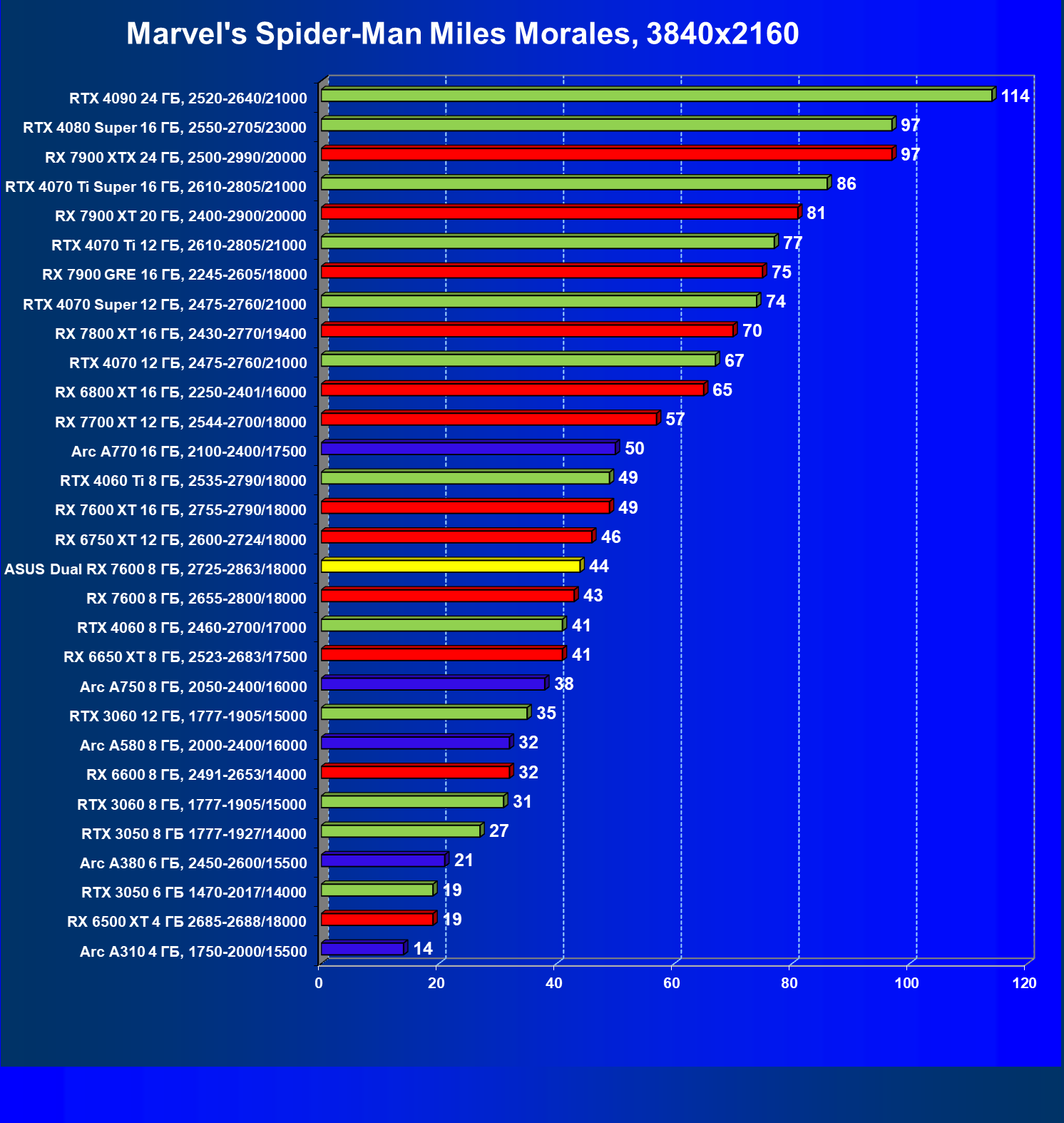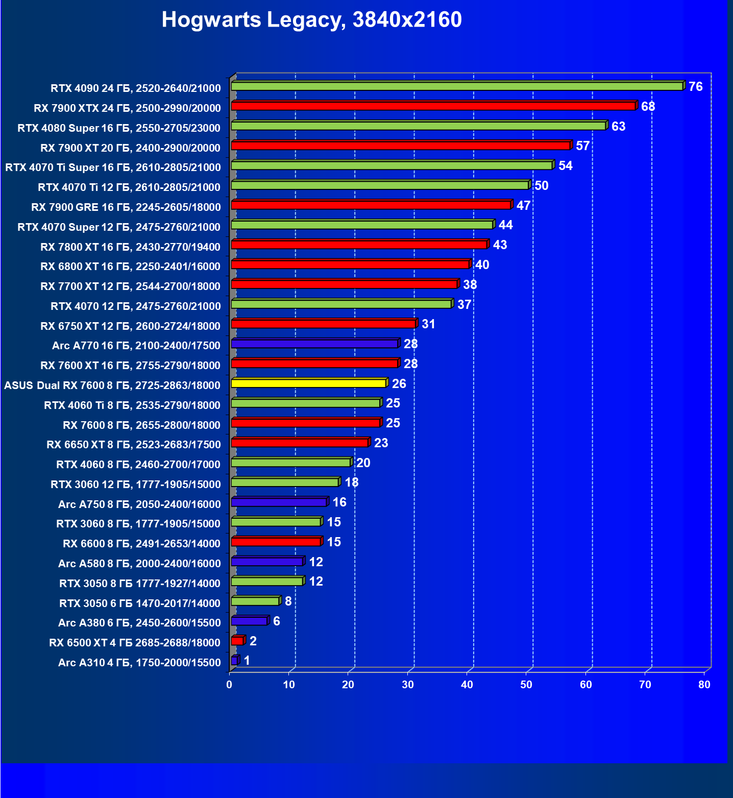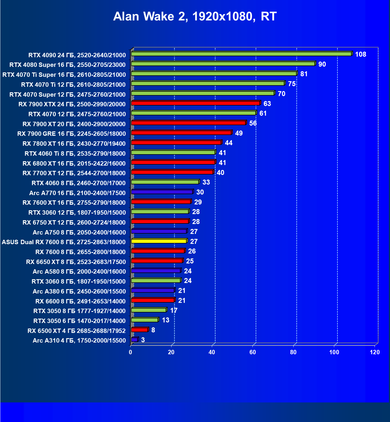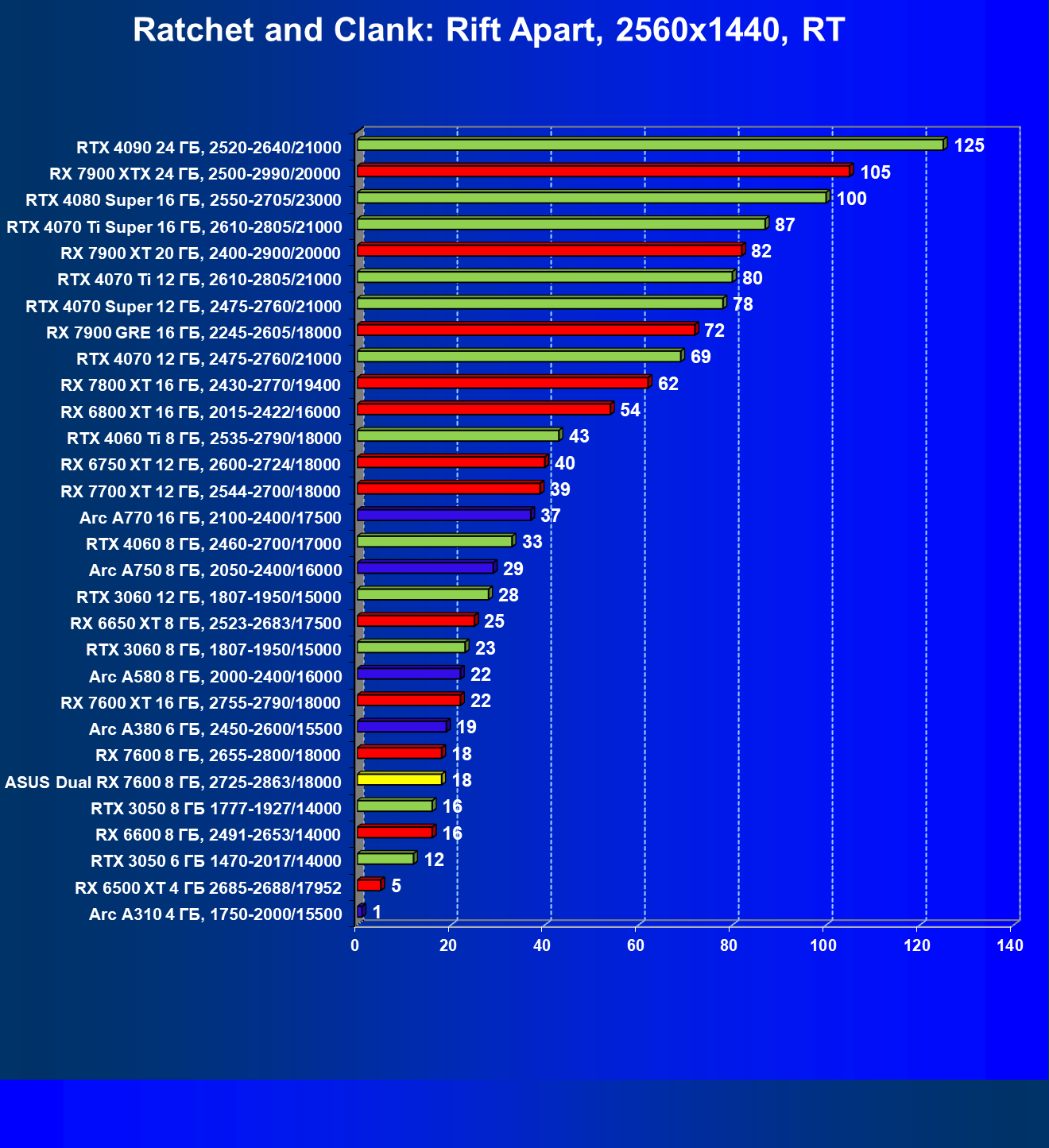 Производительность Radeon RX 7600 находится между GeForce RTX 4060 и GeForce RTX 3060, примерно на уровне Radeon RX 6650 XT и немного выше, чем Arc A750. Эта карта будет обеспечивать отменный комфорт во всех играх на максимальных настройках качества при отключенных трассировке лучей и технологиях масштабирования в разрешении 1080p, приемлемый уровень FPS возможен и в разрешении 2.5K, но для сохранения хорошего комфорта в некоторых играх придется понижать настройки графики. Что касается разрешения 4K, то для него такая карта не подходит, кроме совсем простых в плане графики игр (например, сетевых — но тогда зачем разрешение 4K?).