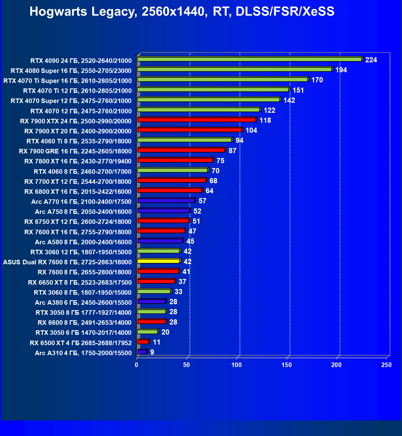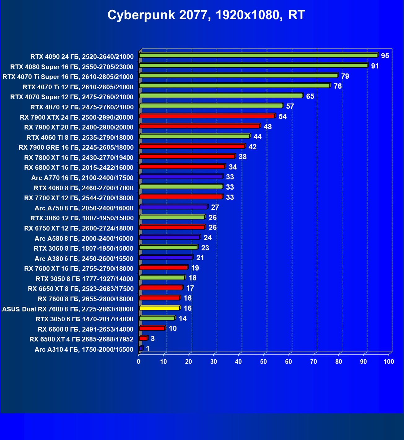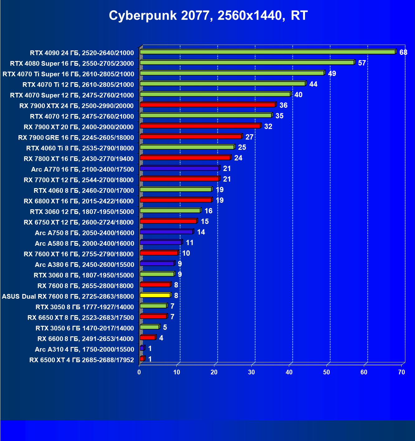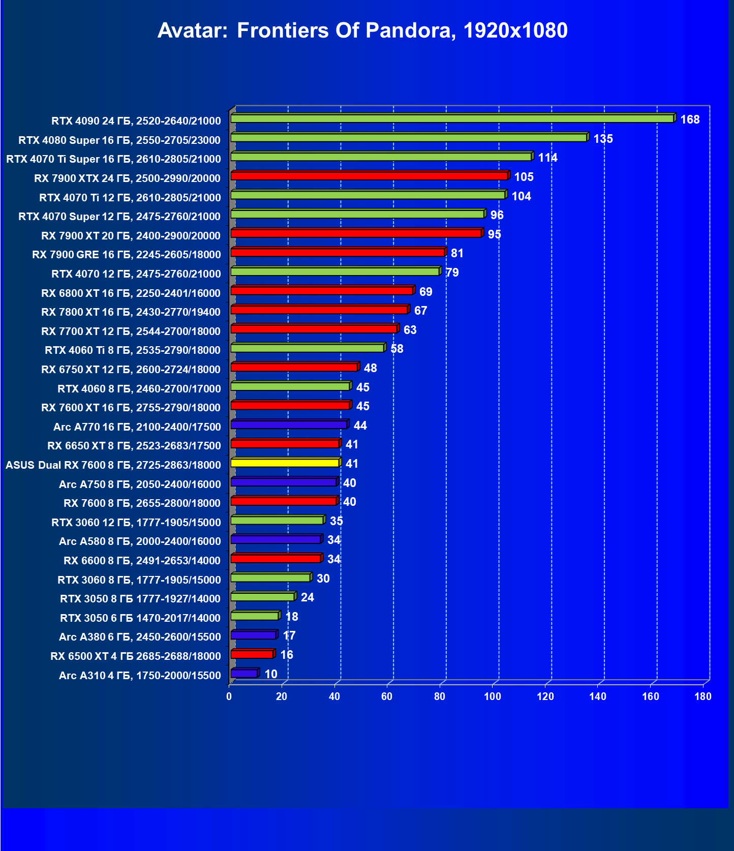 | 17 | Asus Dual RX 7600 8 ГБ, 2725—2863/18000 | 604 | 201 | 30 000 |