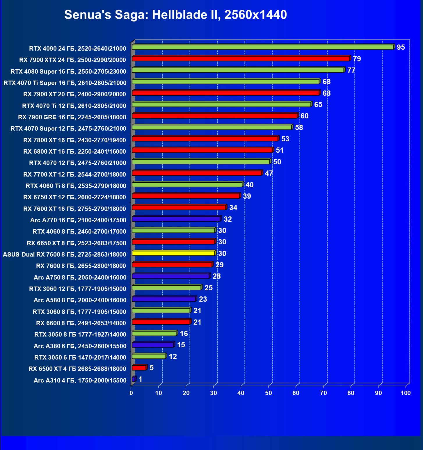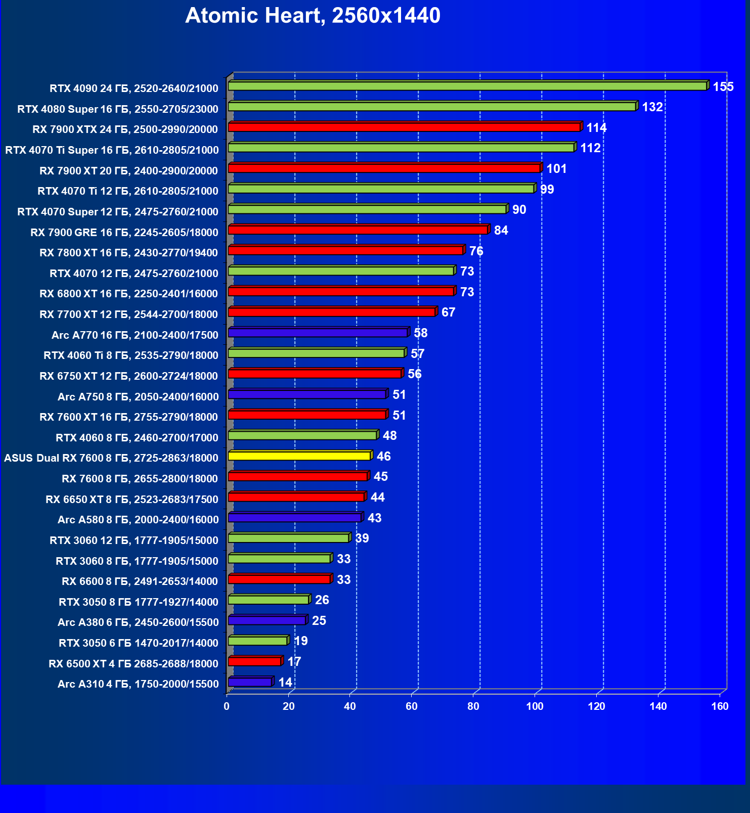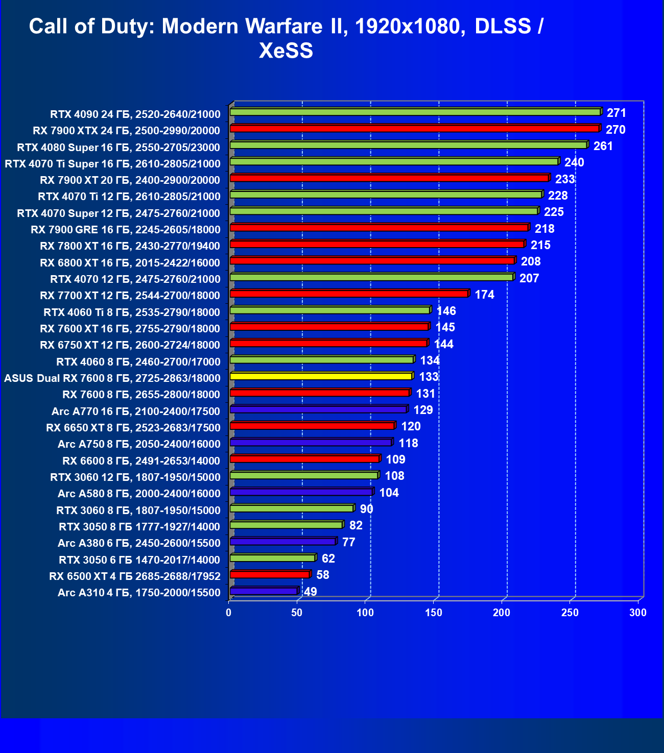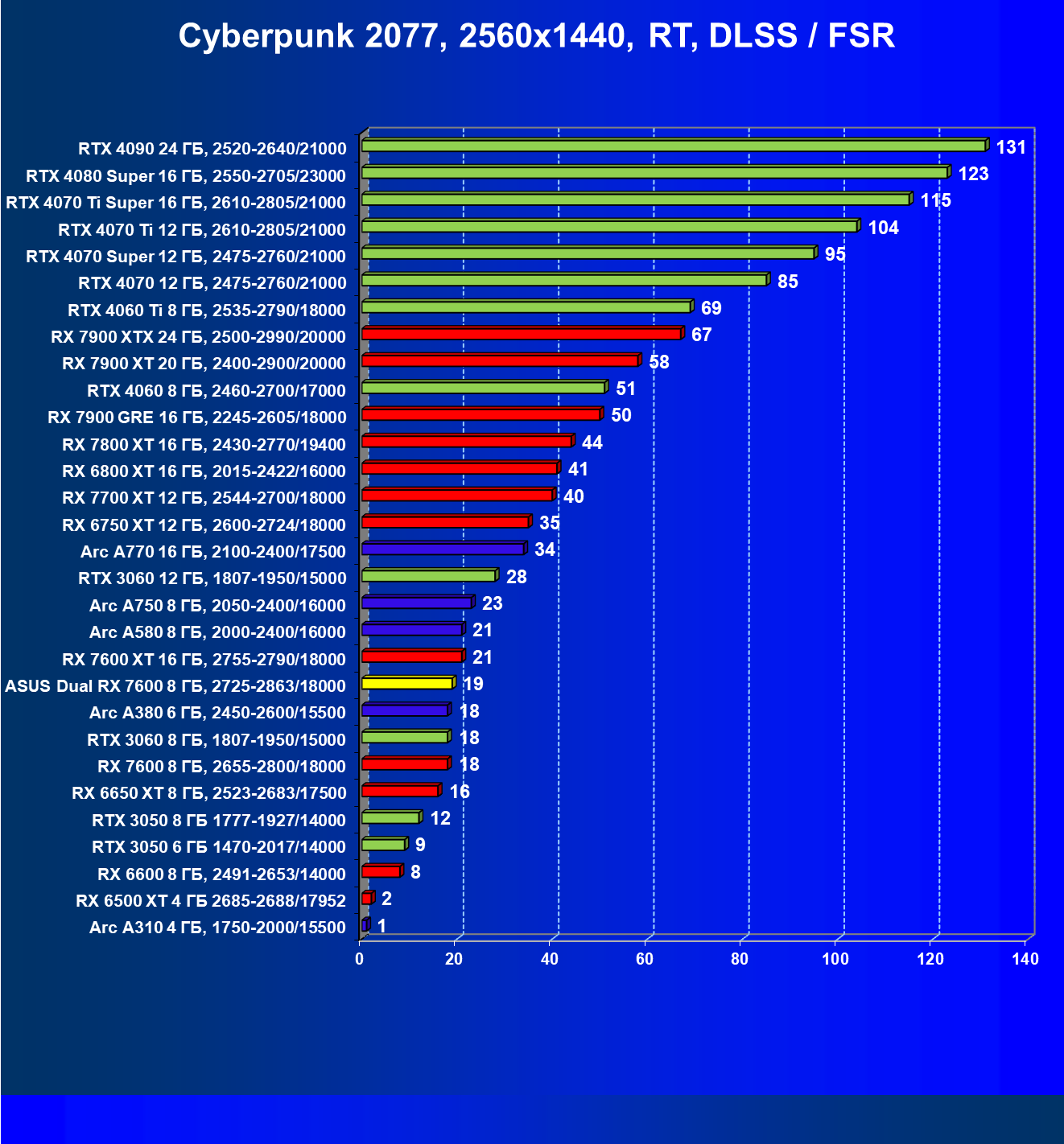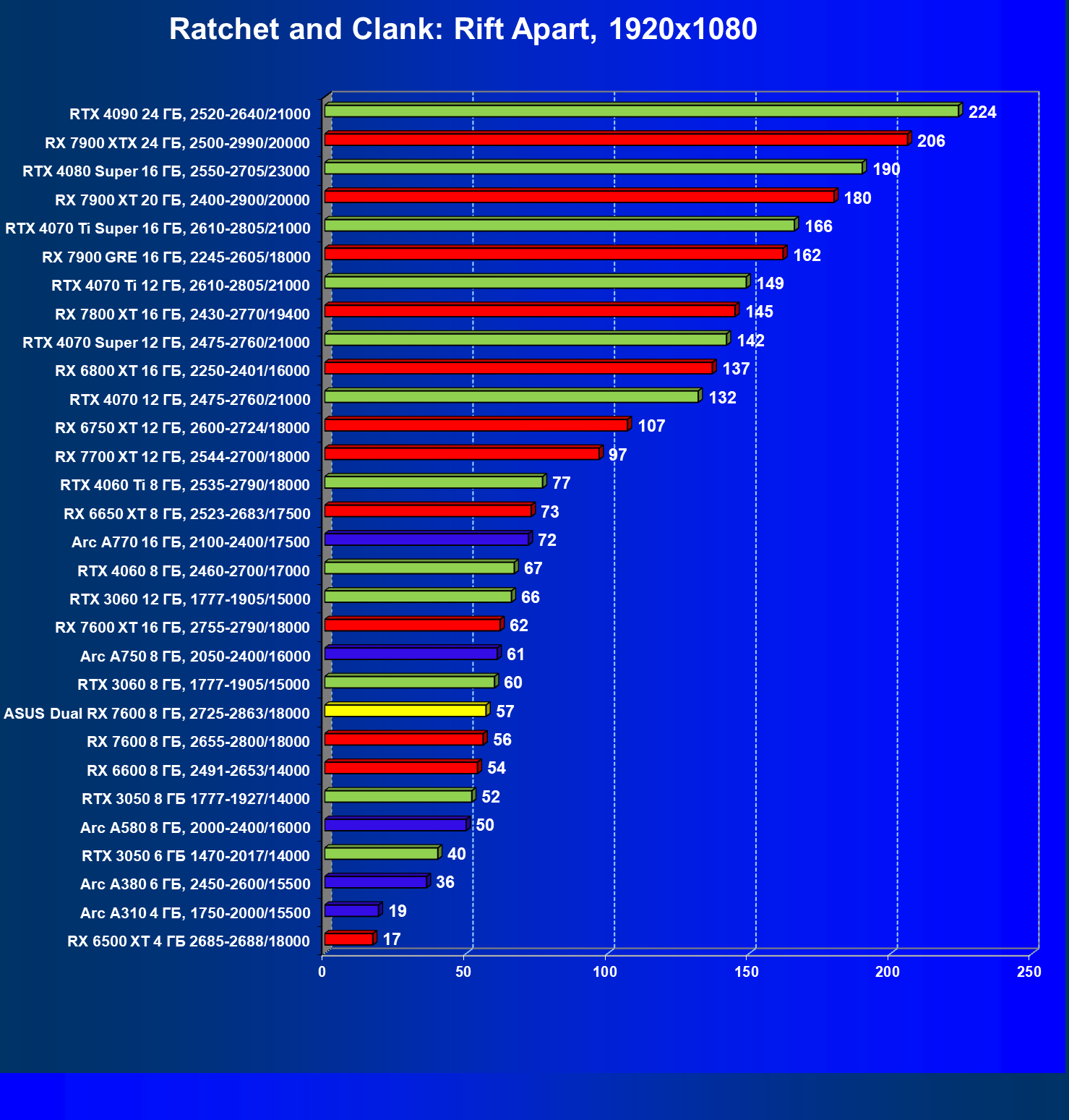 | 16 | Asus Dual RX 7600 8 ГБ, 2725—2863/18000 | 262 | 785 | 30 000 |