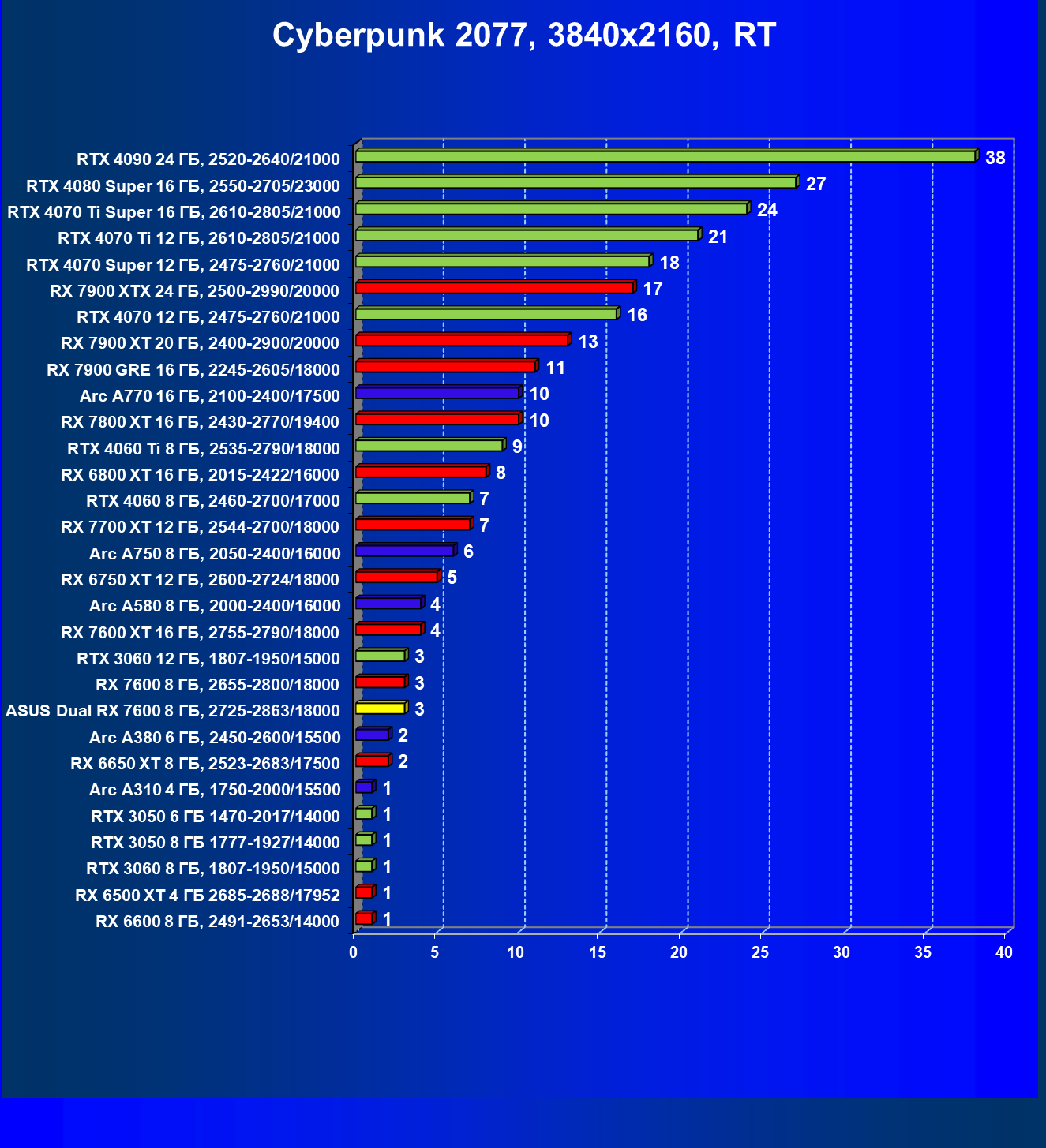 | 20 | Asus Dual RX 7600 8 ГБ, 2725—2863/18000 | 785 | 262 | 30 000 |
