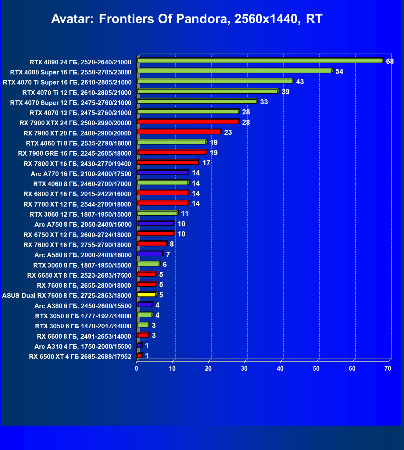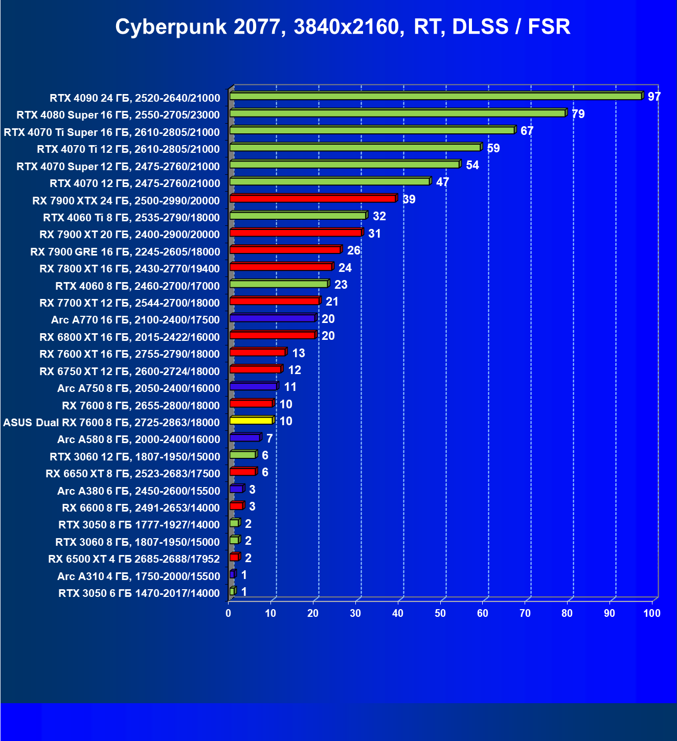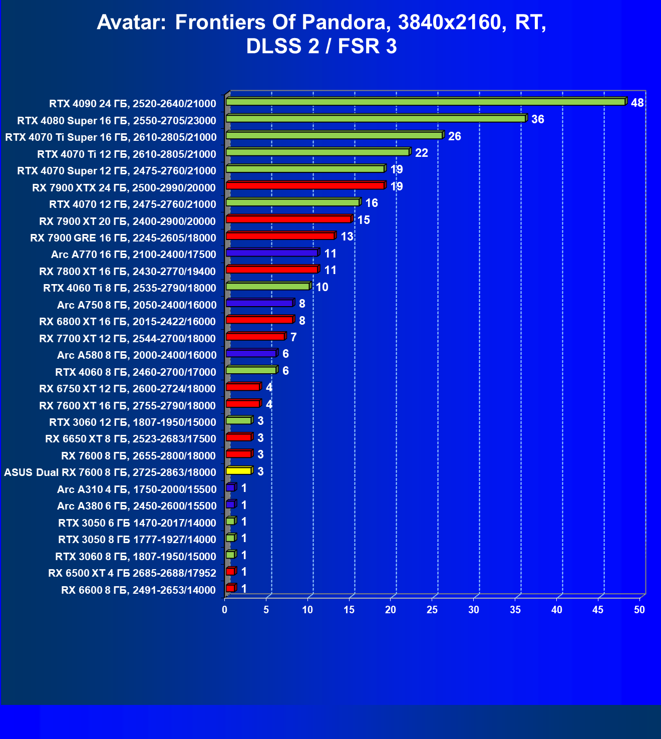 В этом рейтинг вперед вышла не только GeForce RTX 4060, но и GeForce RTX 3060 с 12 ГБ, поскольку семейство Radeon в целом с RT справляется хуже, нежели семейство GeForce, и подчас даже технологии FSR/XeSS мало помогают. Кроме того, не стоит забывать, что такие карты, как Radeon RX 7600, смогут обеспечить приемлемый комфорт в играх с RT только в разрешении Full HD.