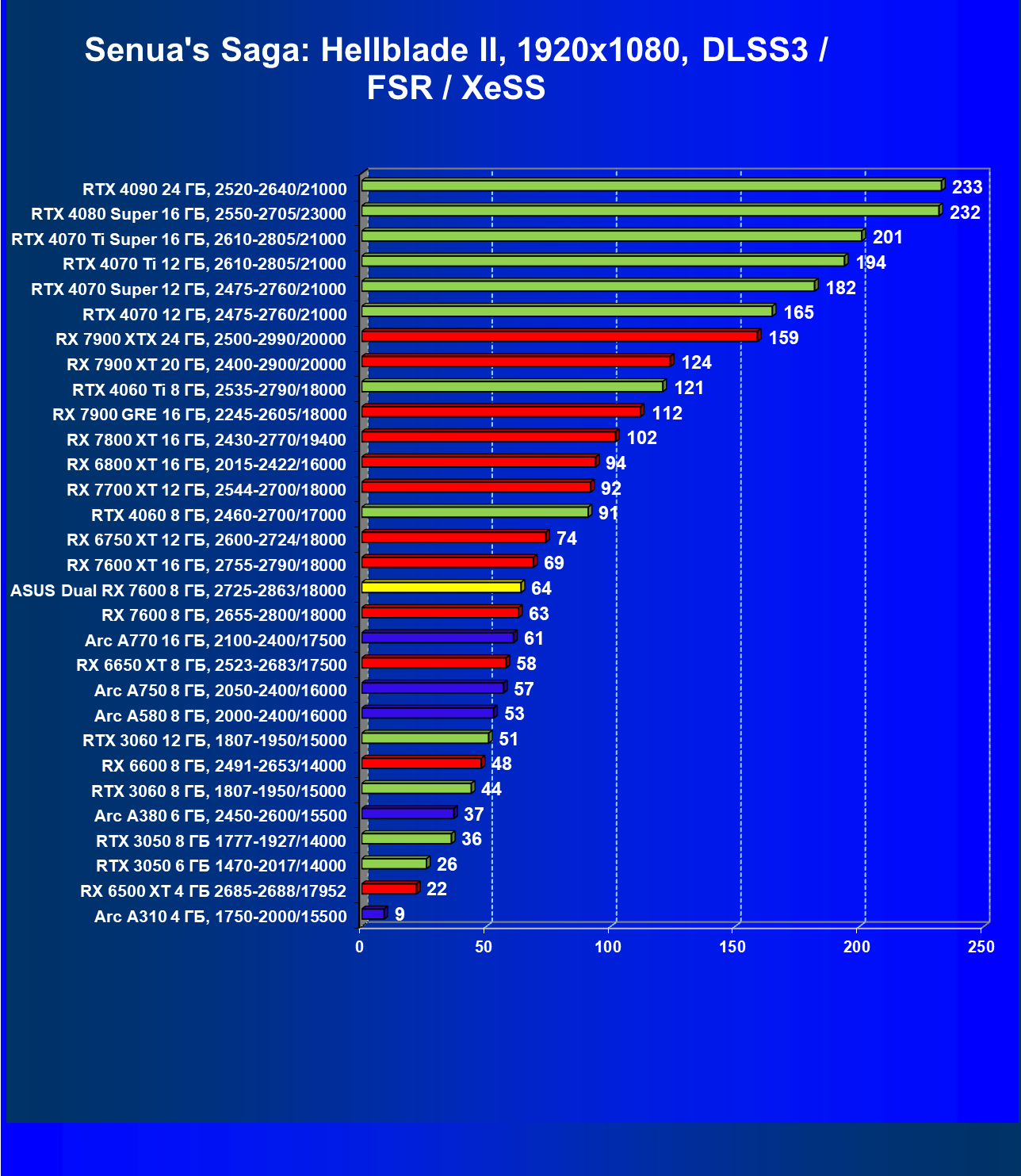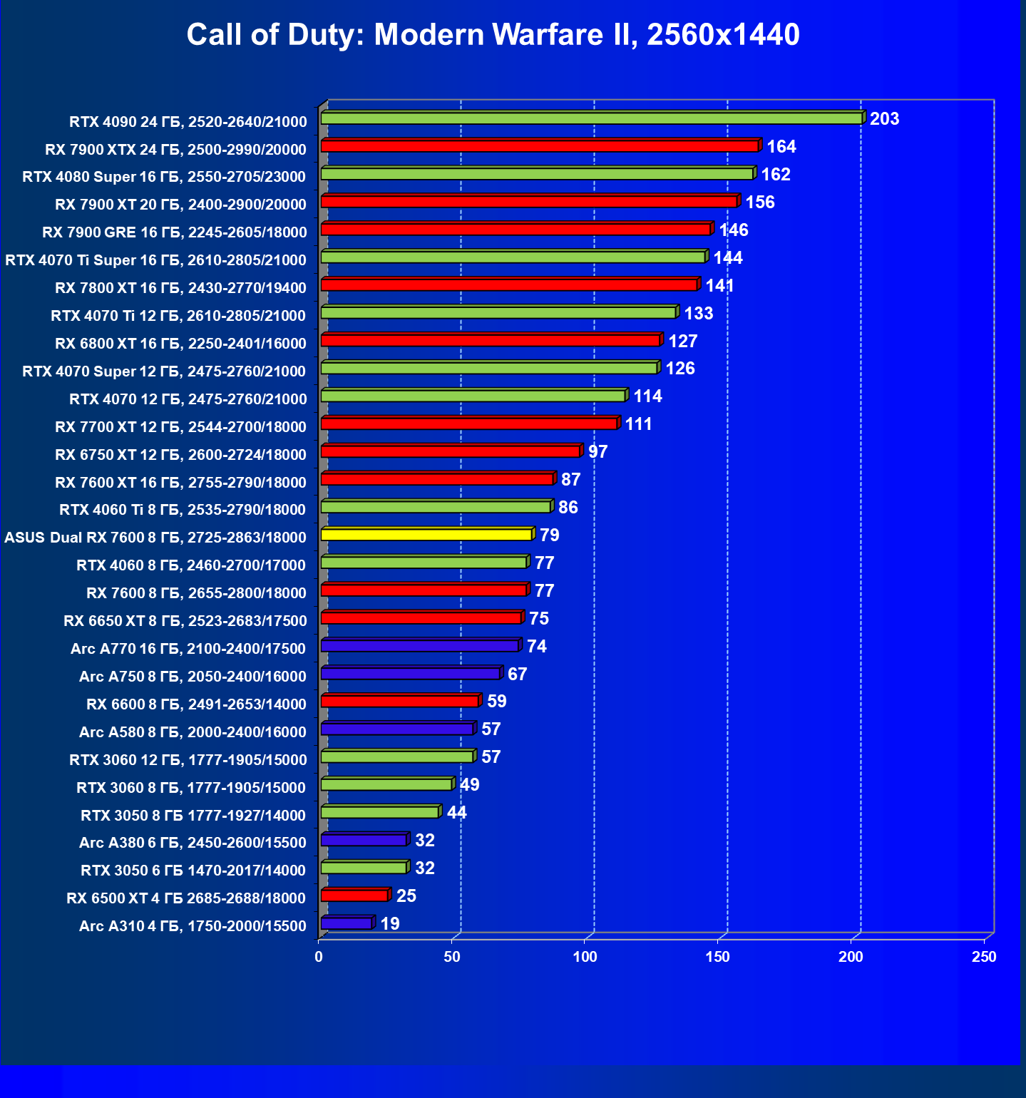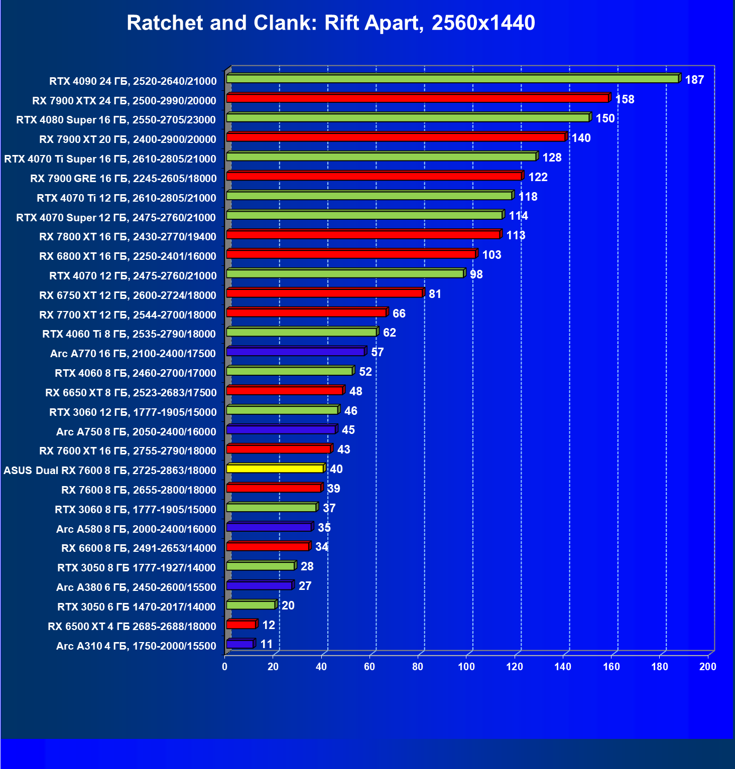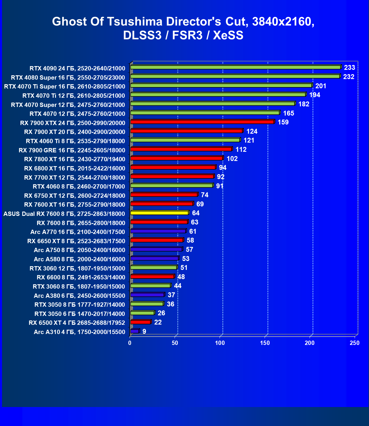 | 05 | Asus Dual RX 7600 8 ГБ, 2725—2863/18000 | 201 | 604 | 30 000 |