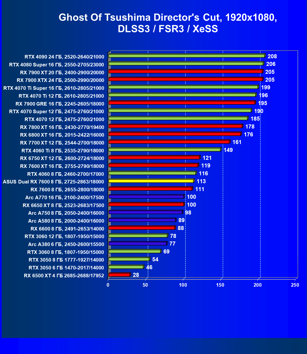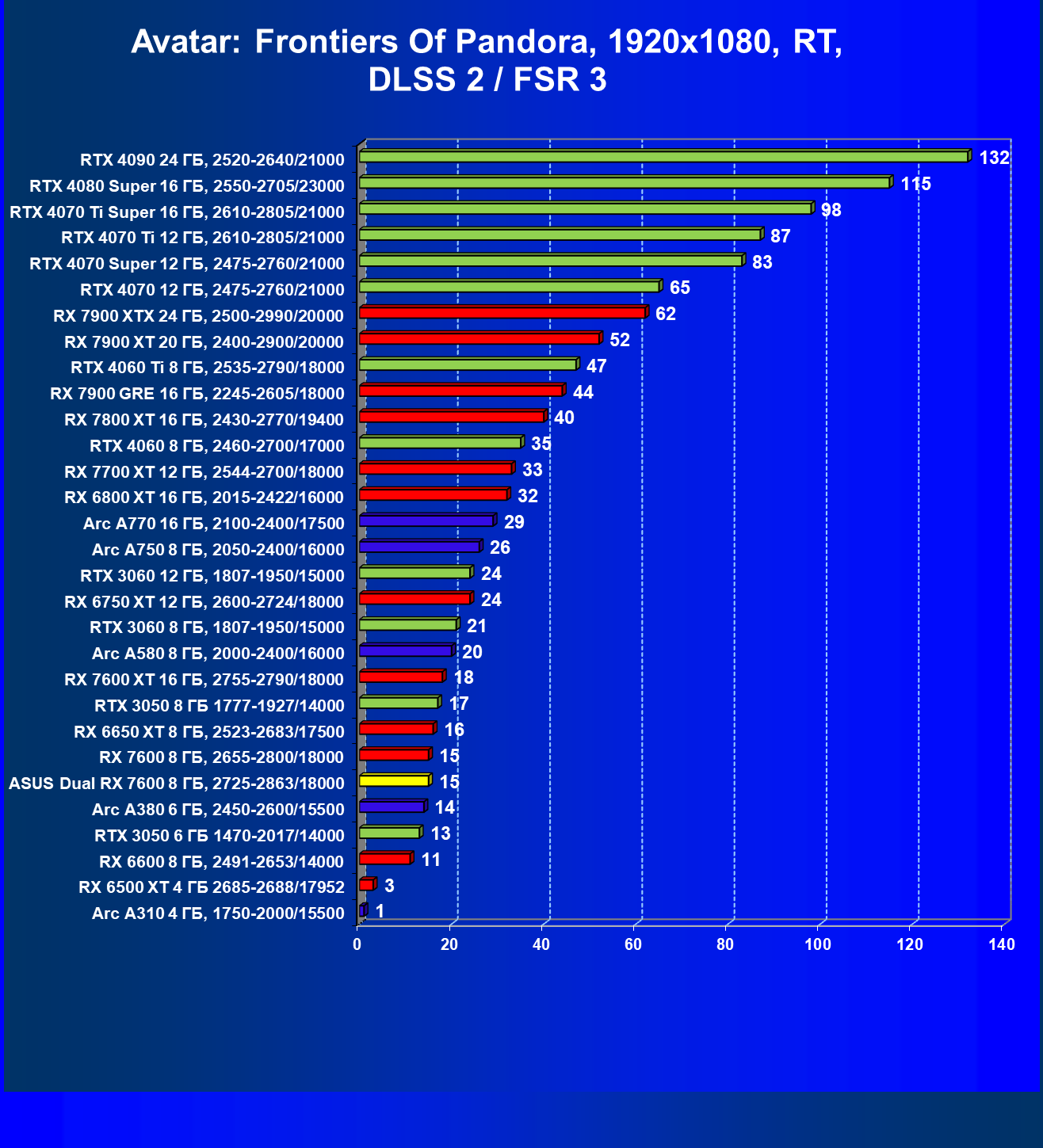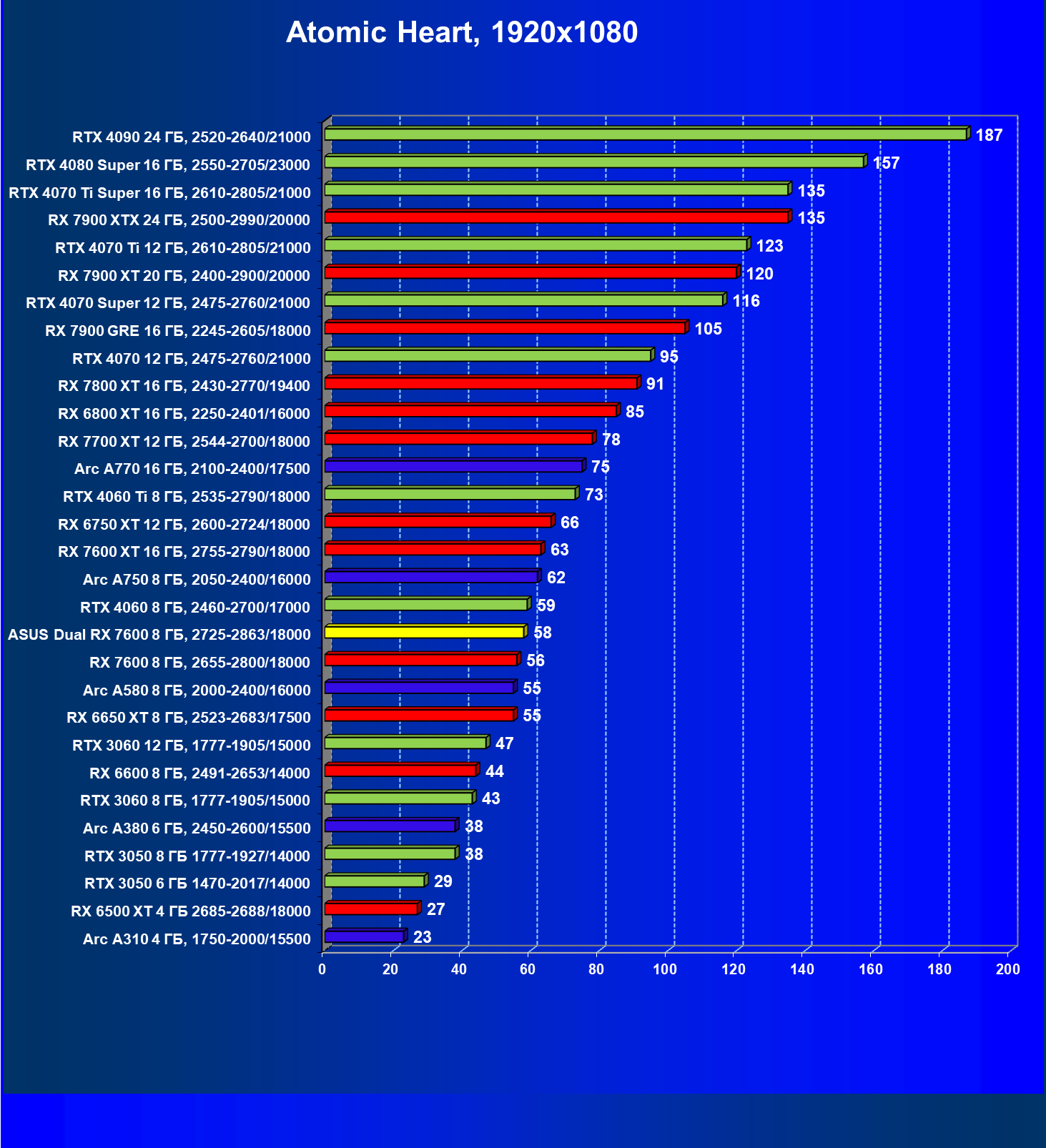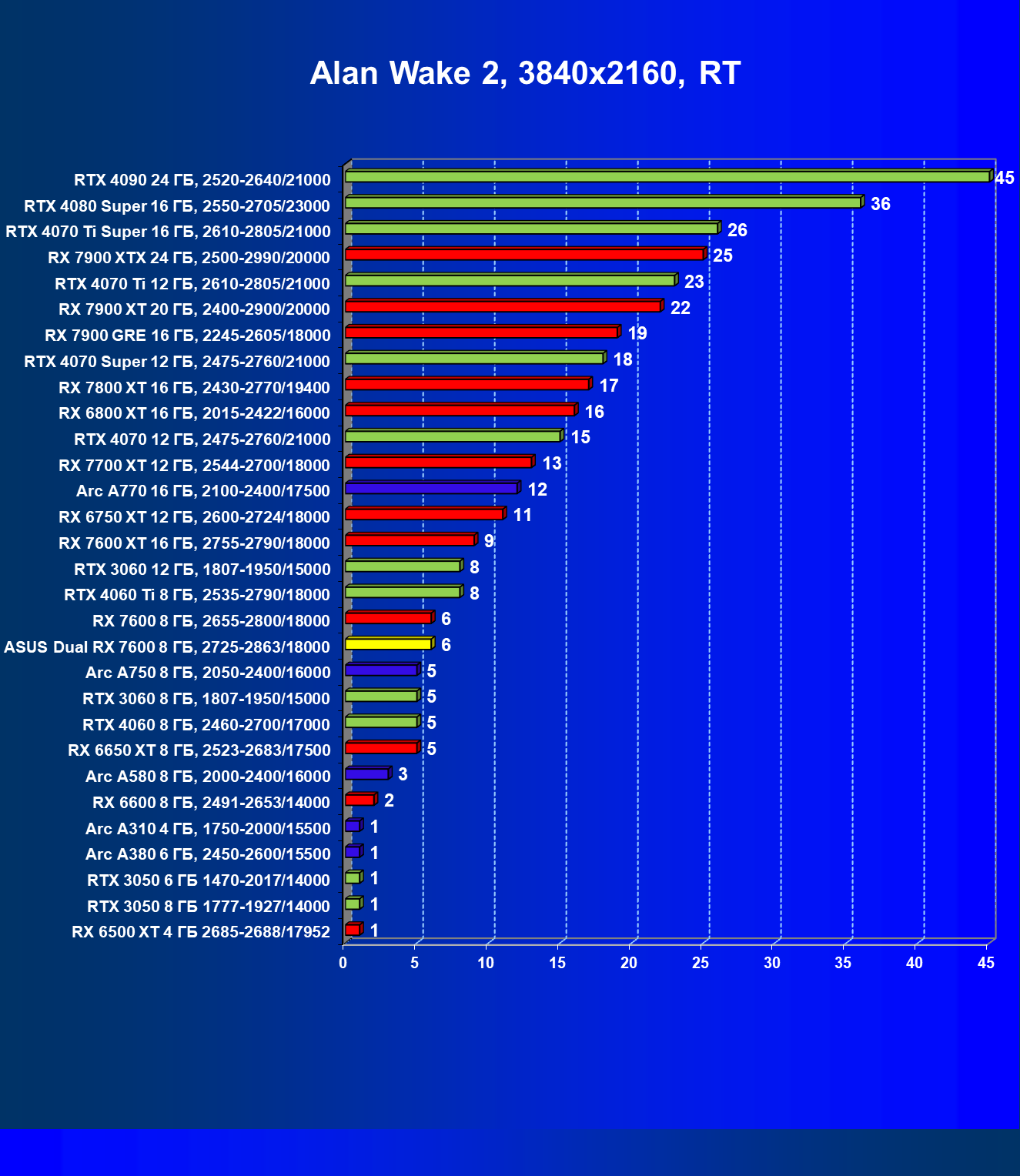 | 05 | Asus Dual RX 7600 8 ГБ, 2725—2863/18000 | 201 | 604 | 30 000 |