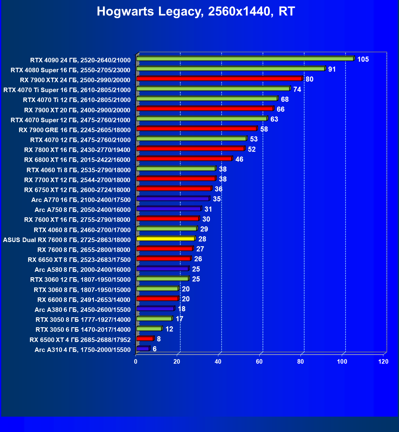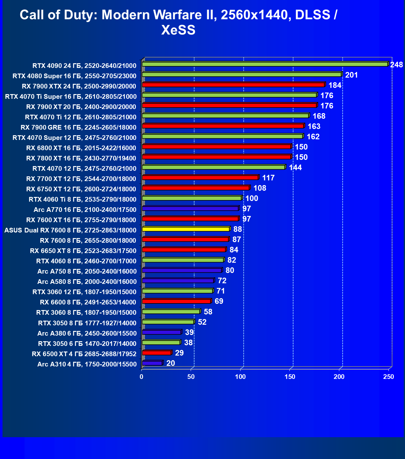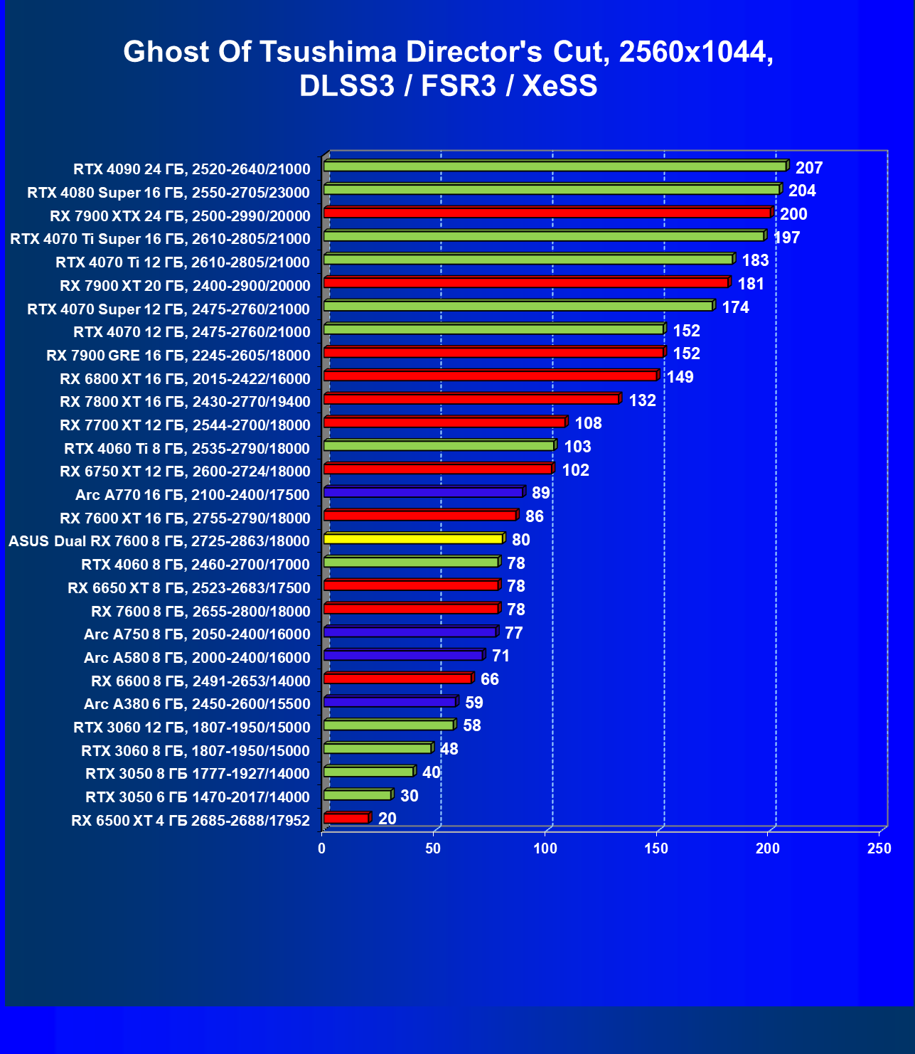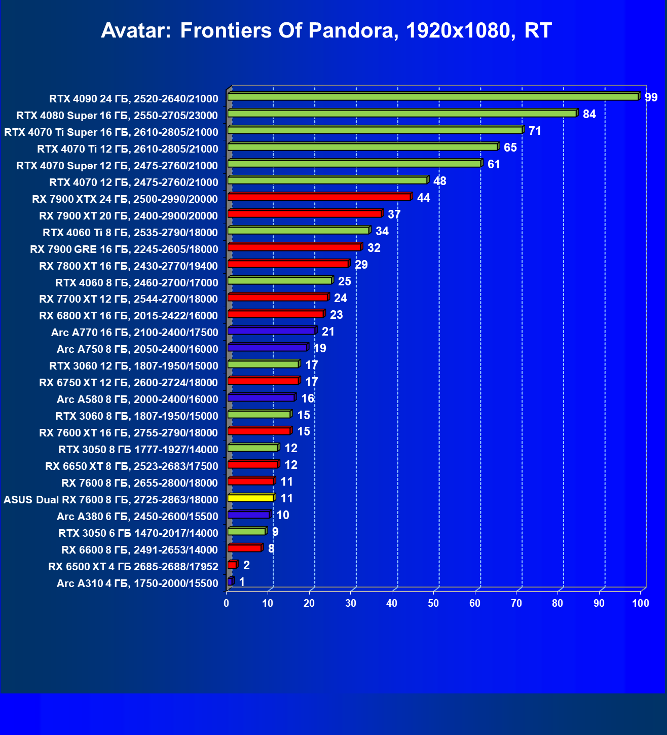 | 05 | Asus Dual RX 7600 8 ГБ, 2725—2863/18000 | 201 | 604 | 30 000 |