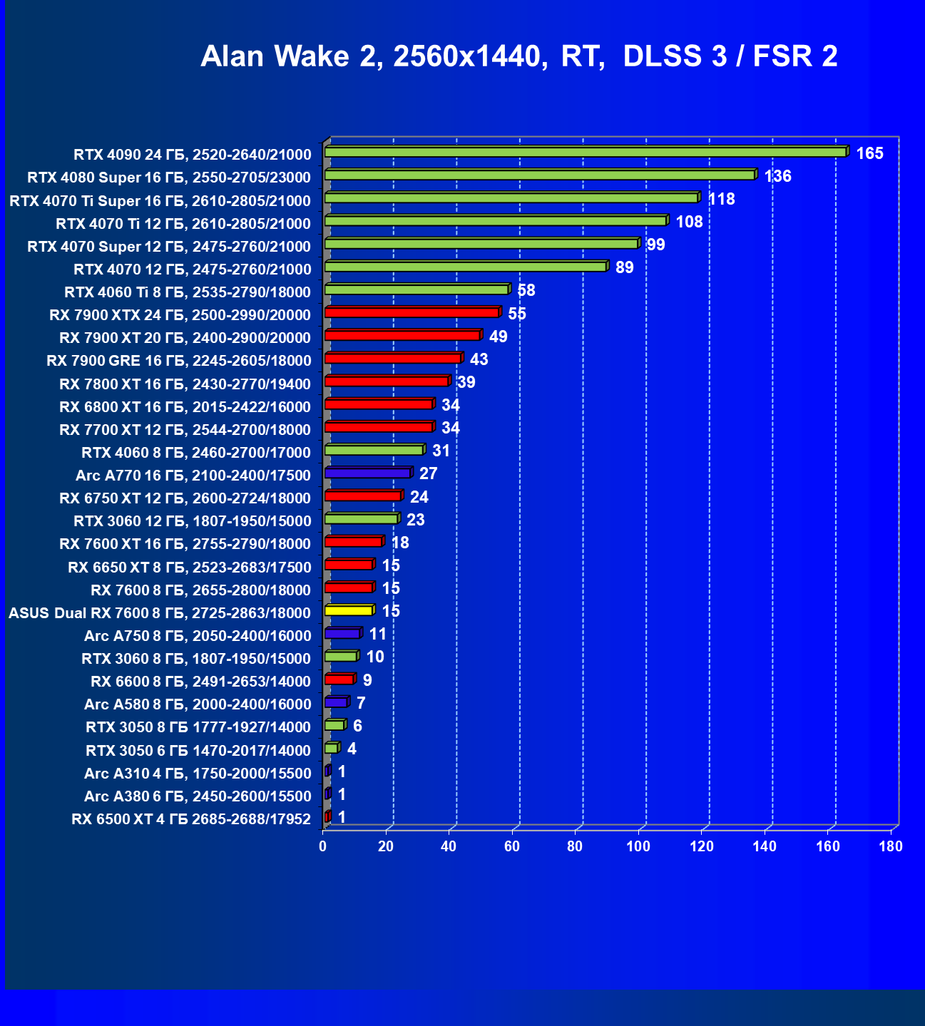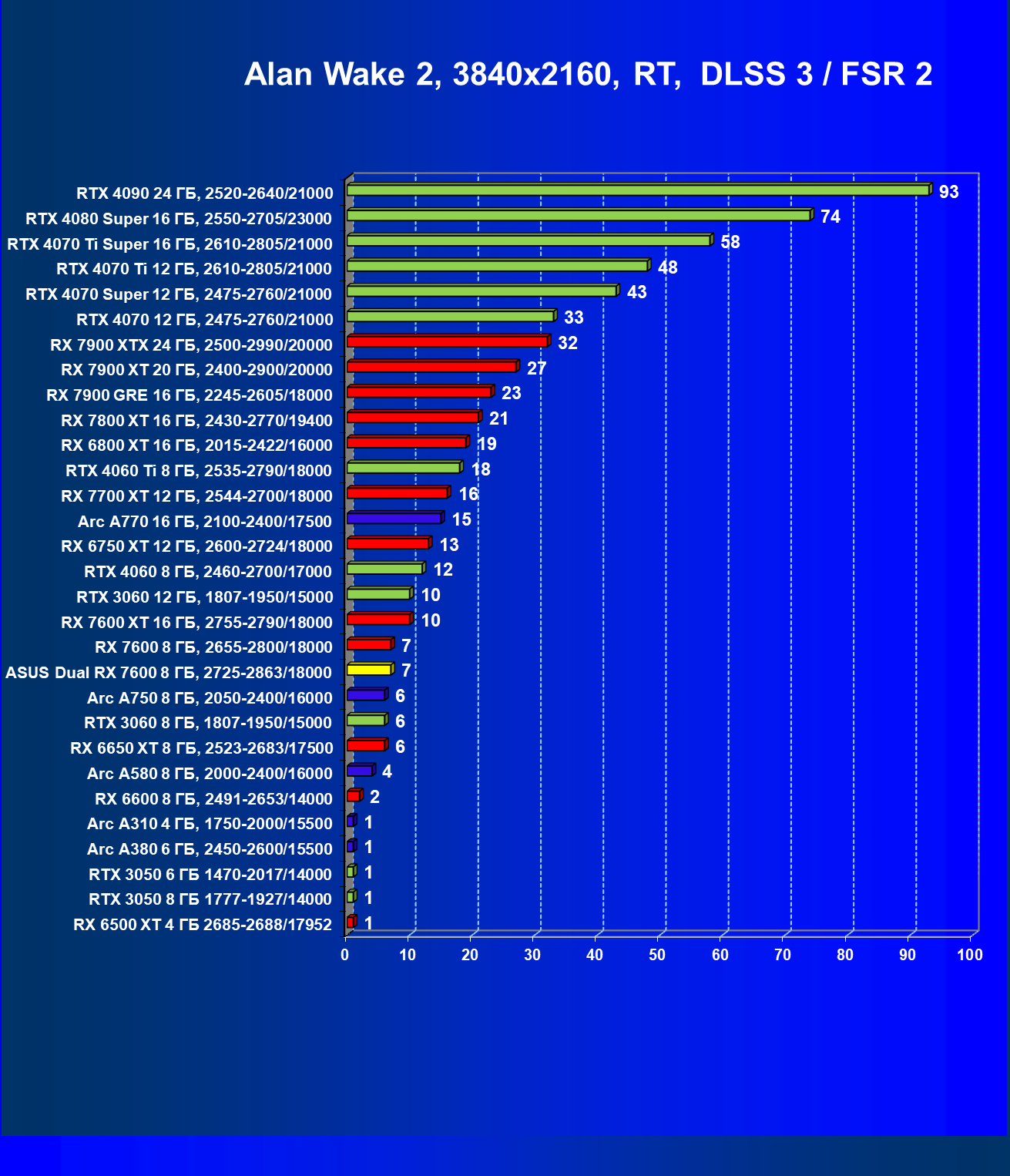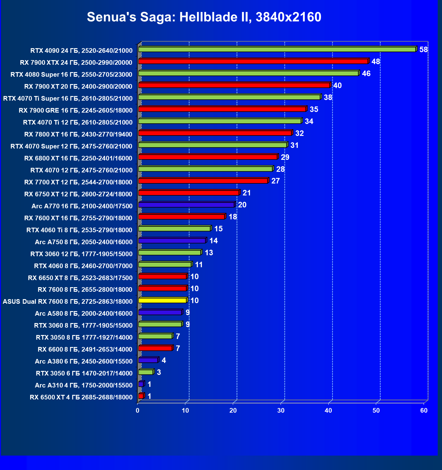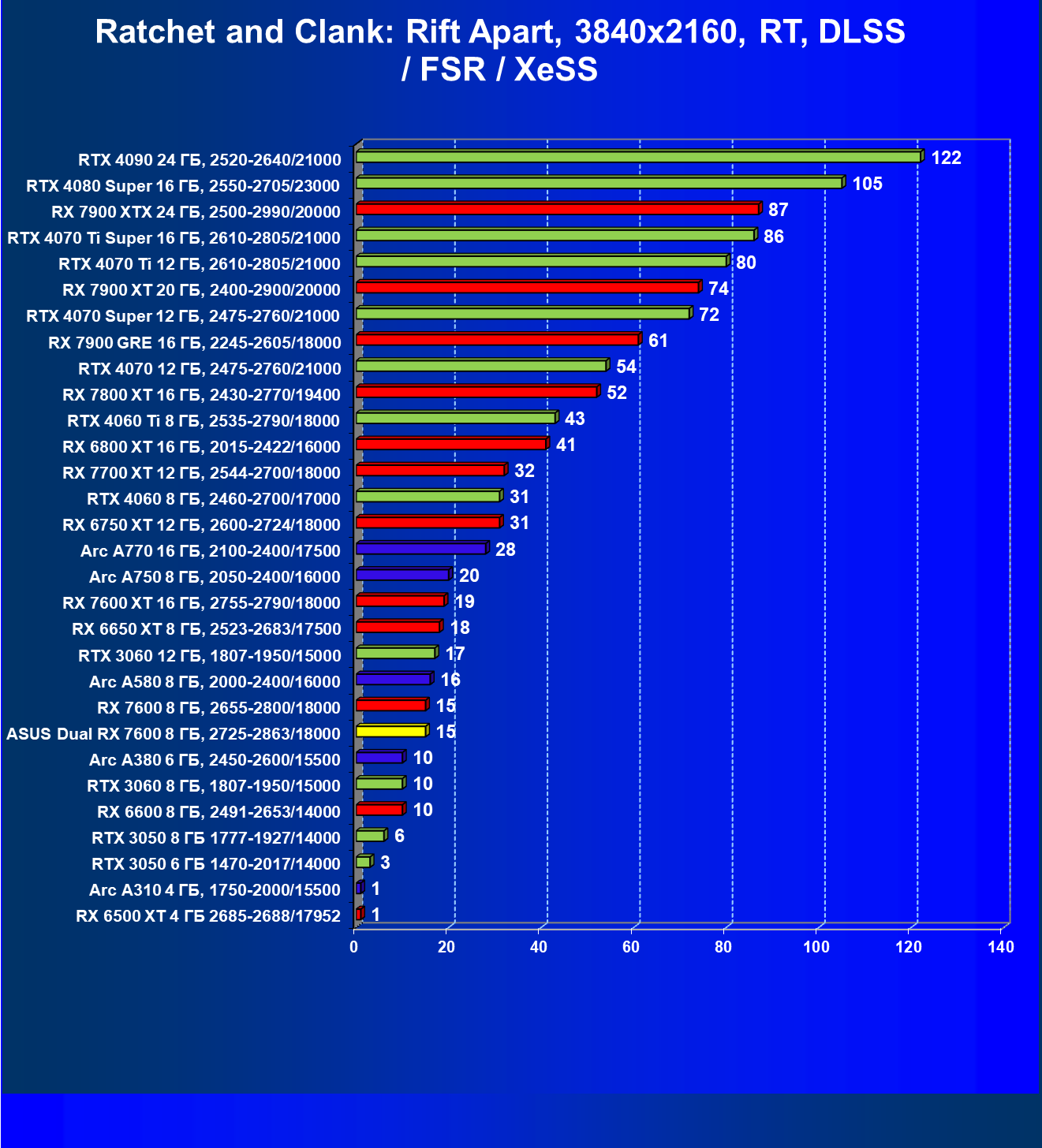 Безусловно, как и следовало ожидать, в играх с трассировкой лучей (и технологиями масштабирования) всё же выигрывает GeForce RTX 4060. Arc A770 тоже обходит Radeon RX 7600.