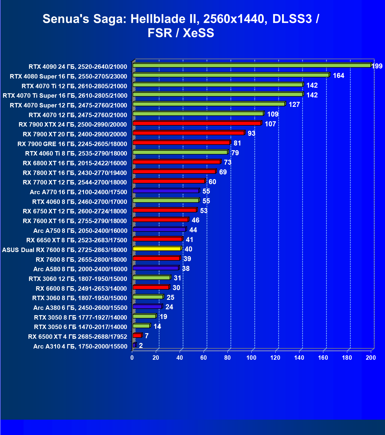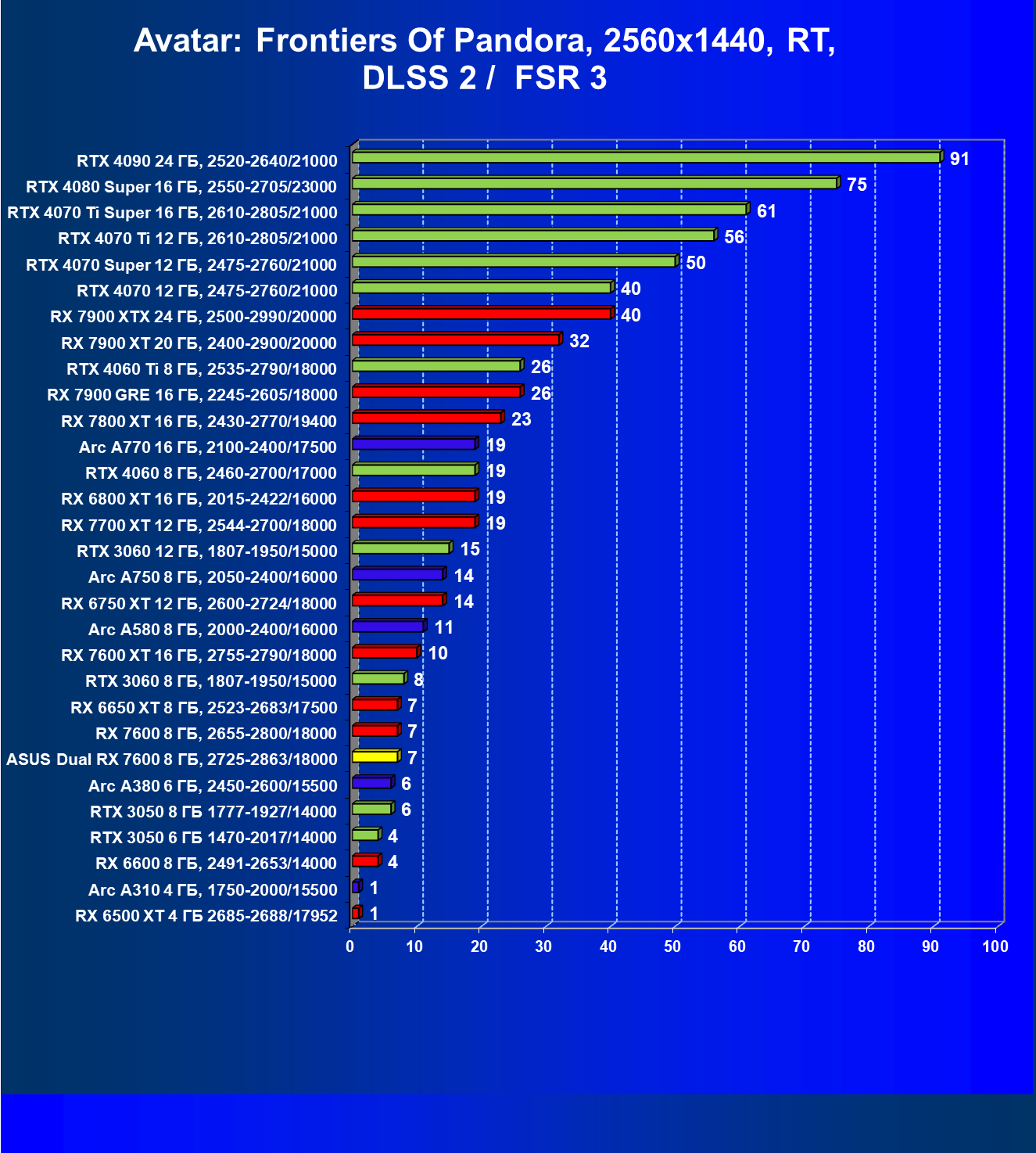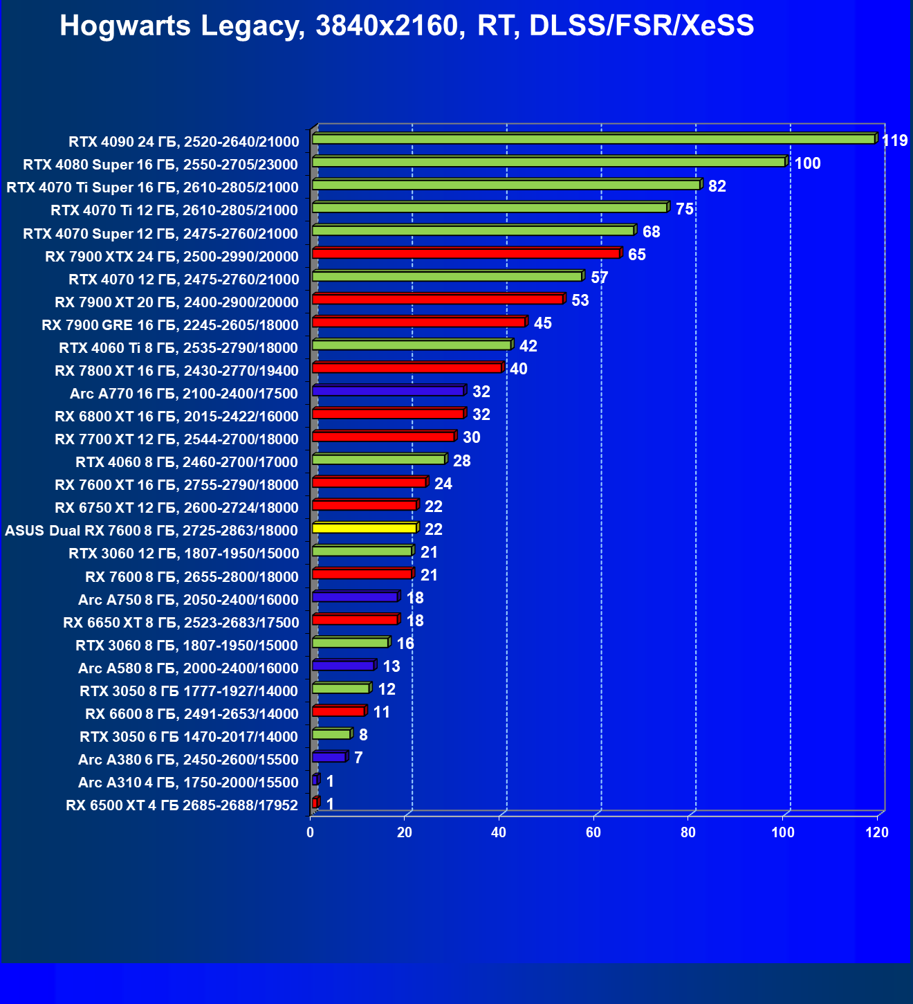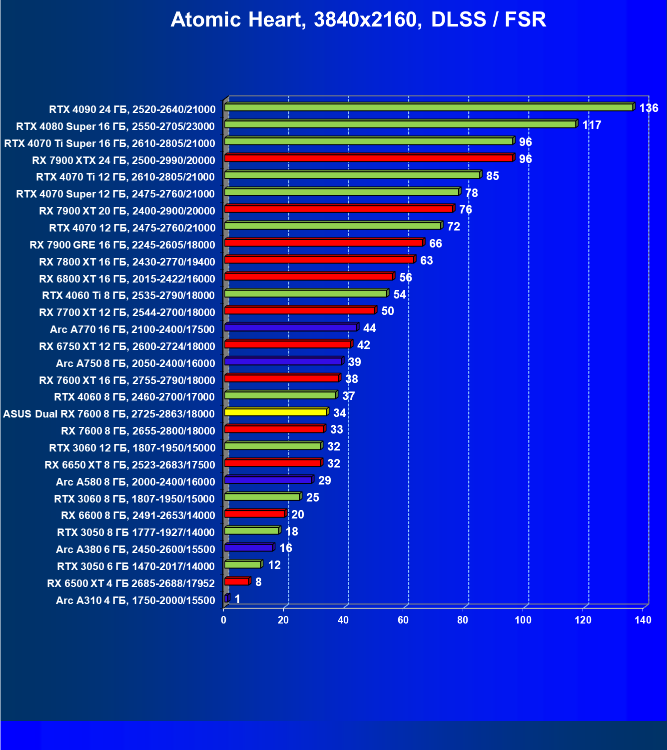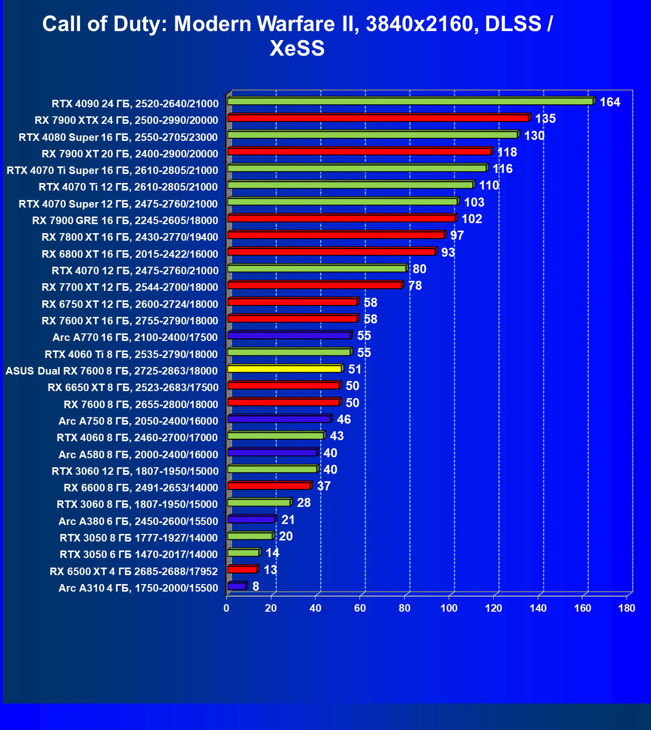 Безусловно, как и следовало ожидать, в играх с трассировкой лучей (и технологиями масштабирования) всё же выигрывает GeForce RTX 4060. Arc A770 тоже обходит Radeon RX 7600.