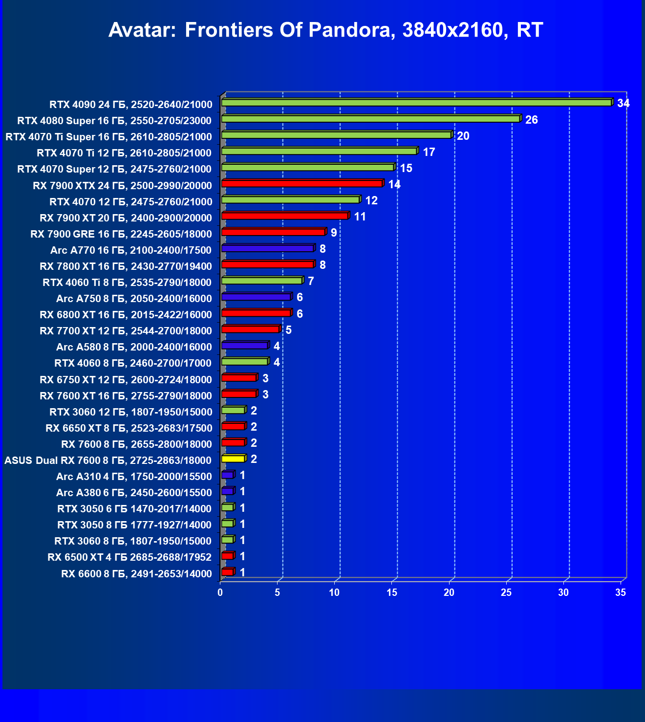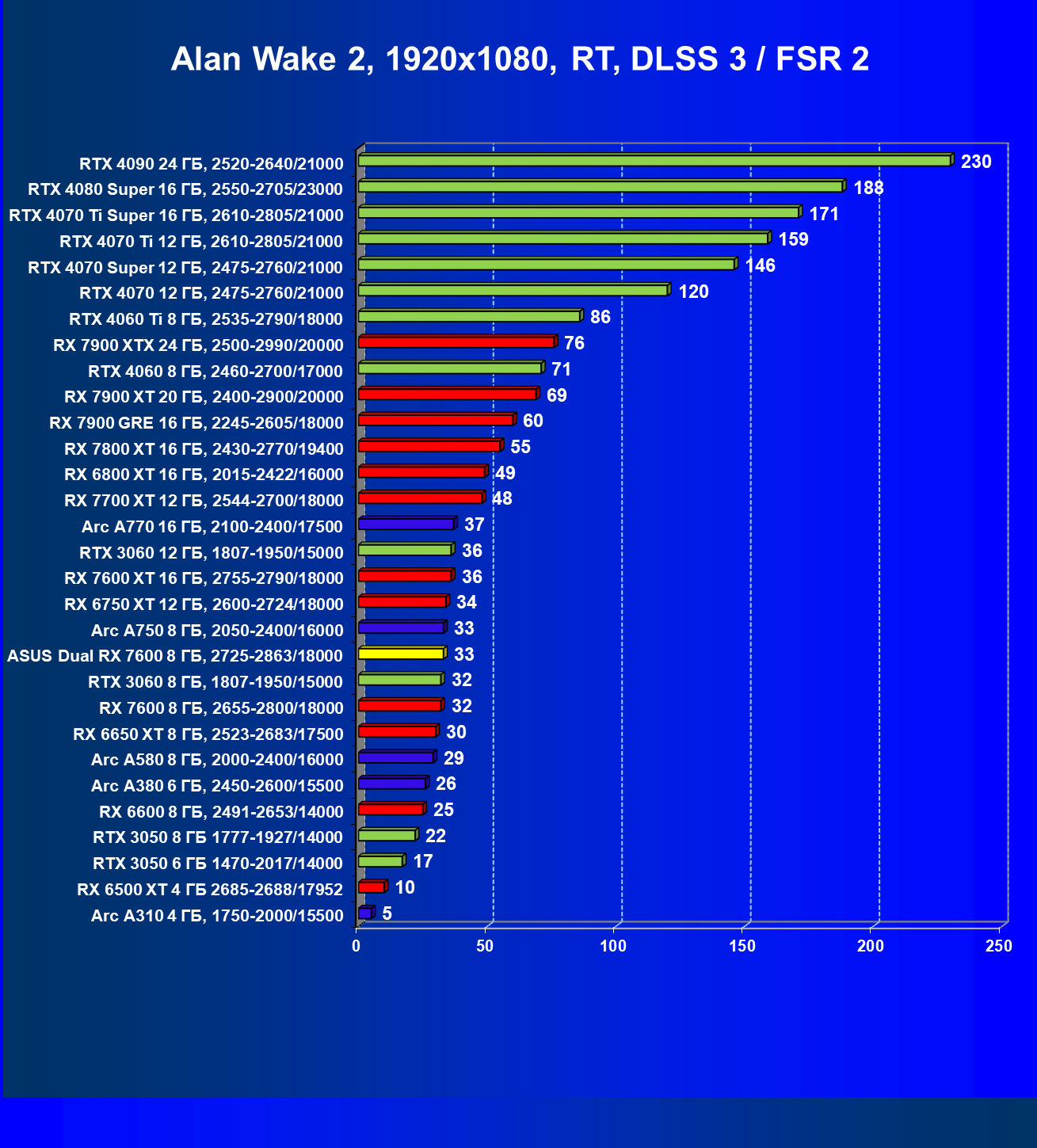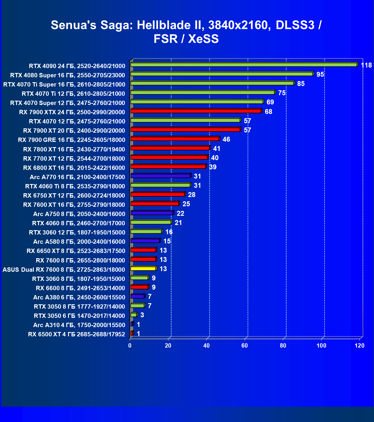 | 08 | Arc A770 16 ГБ, 2100—2400/17500 | 198 | 673 | 34 000 |