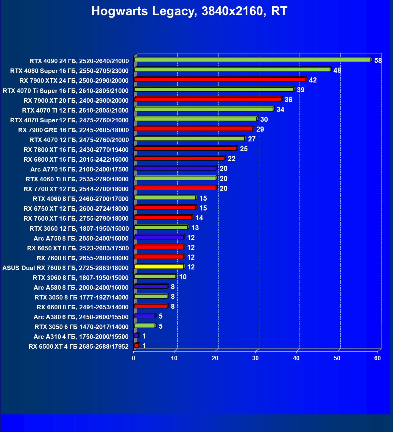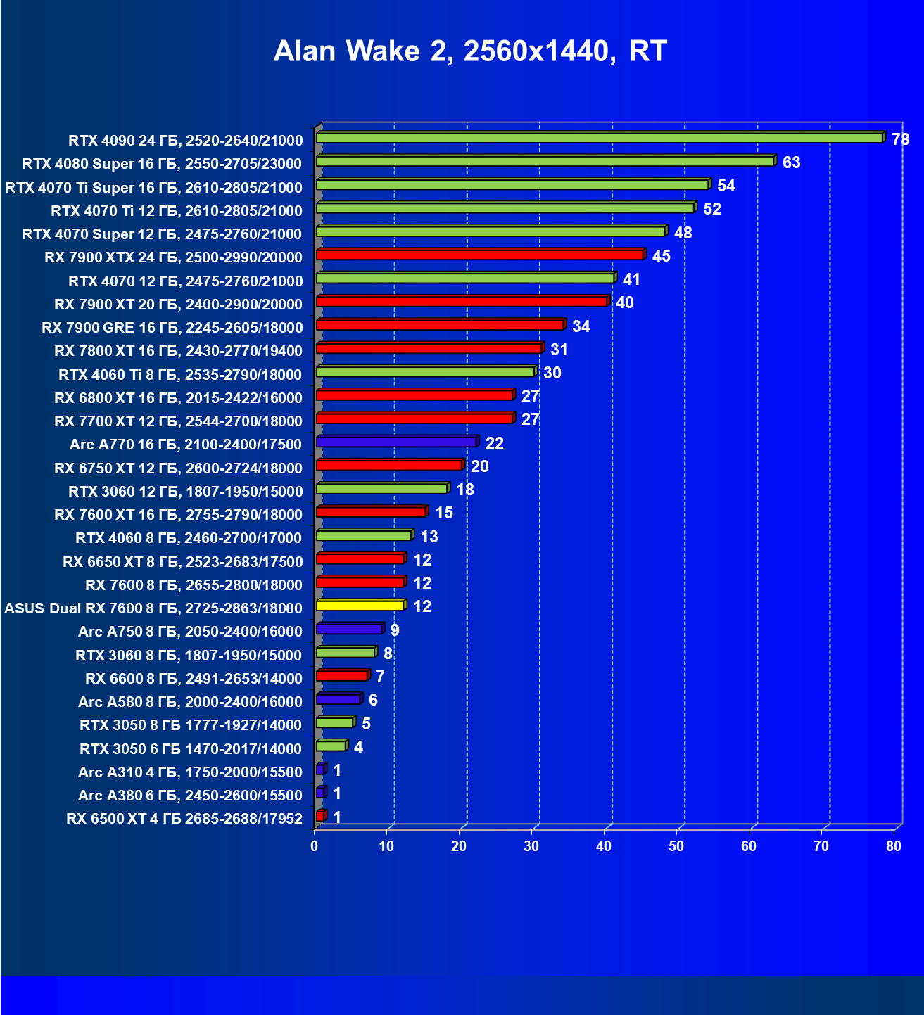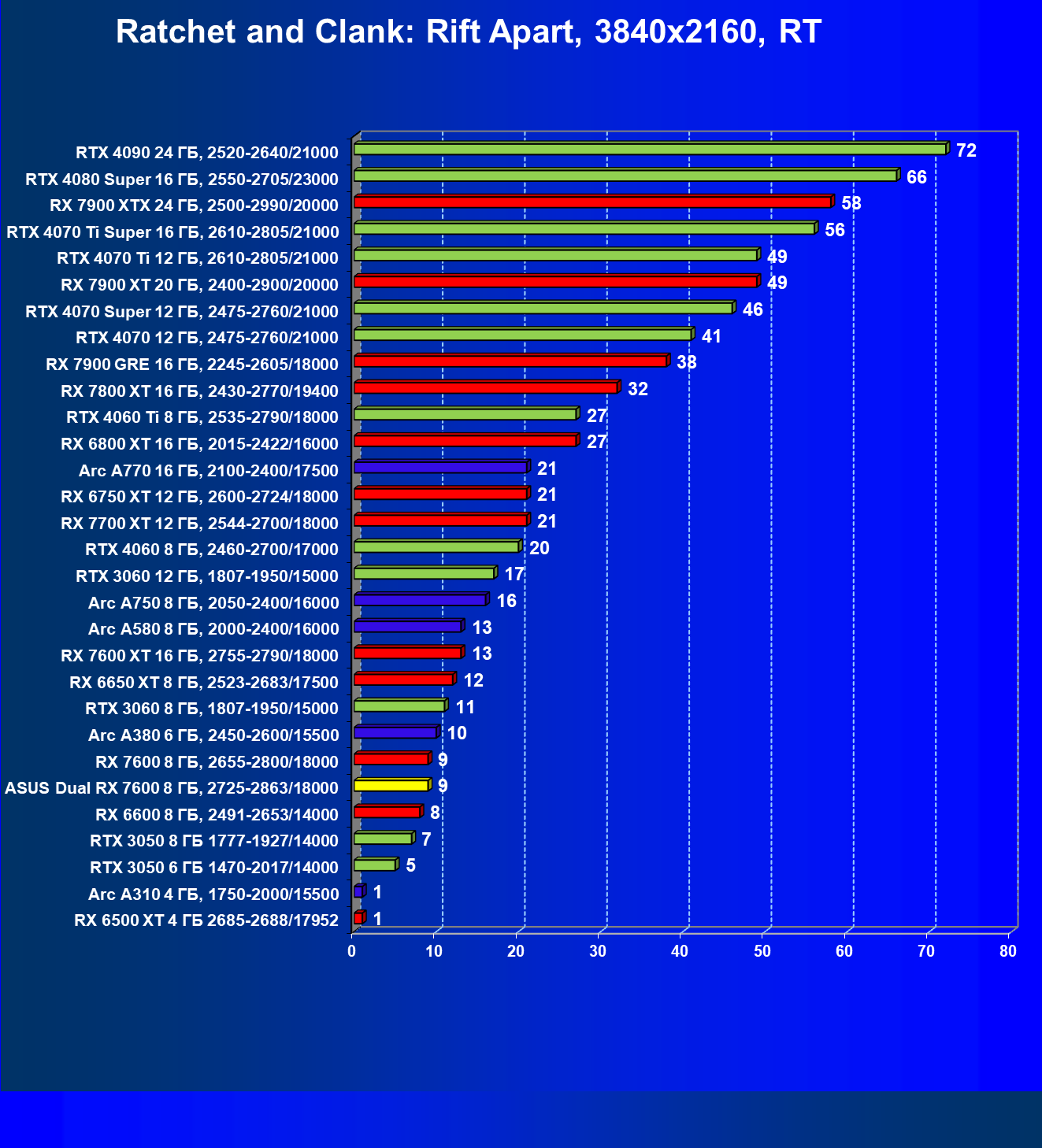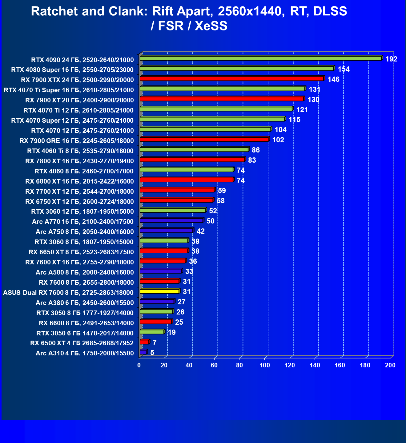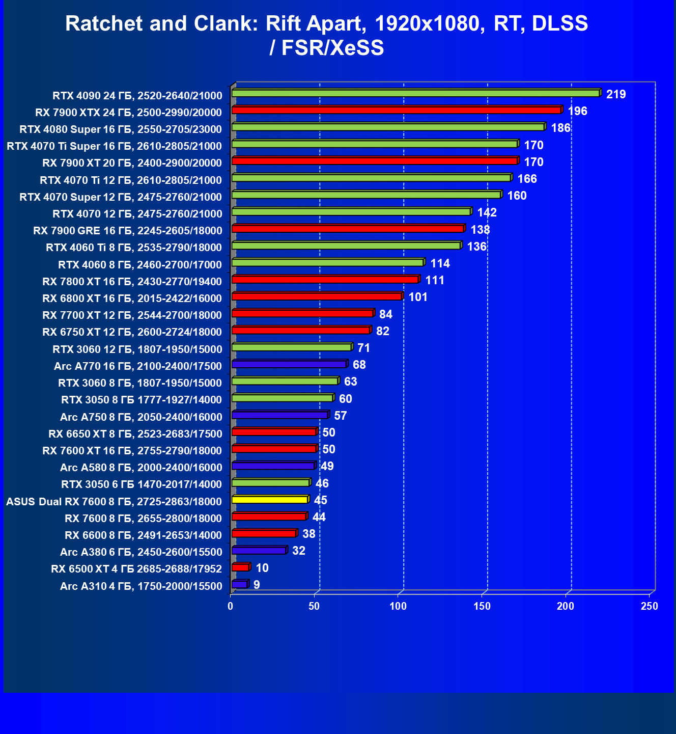 В играх с RT и технологиями динамического масштабирования Radeon RX 7600 уже чуть отстает от GeForce RTX 3060, находясь на уровне Arc A750, а GeForce RTX 4060 значительно быстрее. С такими играми ускоритель AMD может справиться только в разрешении 1080p (Full HD), да и там потребуется обязательное включение FSR/XeSS, если хочется использовать максимальное качество графики.