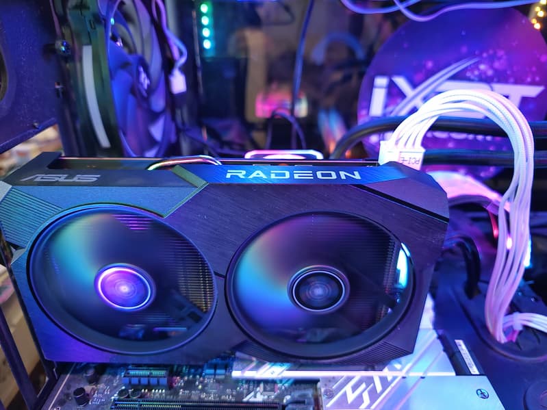 Asus Dual Radeon RX 7600 OC (8 ГБ) — представитель бюджетного сегмента дискретных видеокарт. Это неплохое решение для нетребовательных геймеров, которым достаточно разрешения Full HD и которые не собираются включать трассировку лучей, а также равнодушны к внешнему виду карточки. Видеокарта относительно компактная (24×13 см), но толстая, занимает три слота в системном блоке. Она может потреблять до 170 Вт и имеет стандартный 8-контактный разъем питания. Использованный кулер весьма тихий и эффективный. Карта не имеет подсветки.