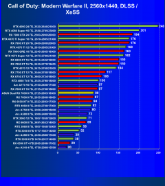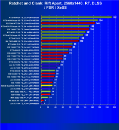 Рейтинг составлен по 9 тестам, в которых используется технология трассировки лучей и одновременно технология Nvidia DLSS, AMD FSR или Intel XeSS. Этот рейтинг нормирован по самому слабому ускорителю в данной группе — Arc A310 (то есть сочетание скорости и функций Arc A310 приняты за 100%).