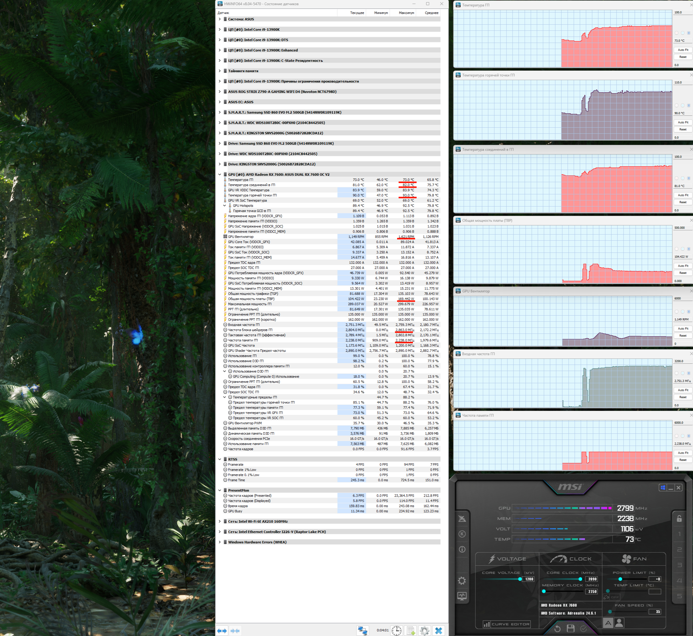После 2-часового прогона под нагрузкой максимальная температура ядра не превысила 73 градусов, самой горячей точки (hot spot) — 93, а микросхем памяти — 84 °C, что является удовлетворительным результатом для видеокарт такого уровня. Энергопотребление карты доходило до 169 Вт. Напомним, что максимум нагрева hot spot — 110 °C (этот показатель используется драйверами AMD как крайняя точка для определения нужды в снижении частот работы GPU).