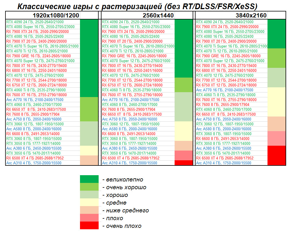 Очевидно, что в классических играх с растеризацией (без RT) соперники в лицах GeForce RTX 4060, Arc A770 и Radeon RX 7600 демонстрируют примерно равную привлекательность по соотношению возможностей и цены. Тем, кто не собирается включать трассировку лучей (в том числе из-за уверенности, что подобные карты просто не потянут современные игры с RT даже с учетом DLSS/FSR/XeSS), следует в таком случае выбирать по иным особенностям конкретных моделей — размерам, шуму кулера и пр.