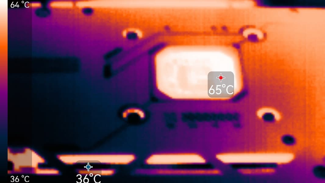 После 2-часового прогона под нагрузкой в режиме Performance максимальная температура ядра не превысила 61 градус, а памяти — 82 °C, что является отличным результатом для видеокарт высокого уровня. Энергопотребление карты доходило до 266 Вт, а вентиляторы работали на скорости 1711 об/мин. Температура нагрева самой горячей точки ГП (hot spot) составляла 83 °C.