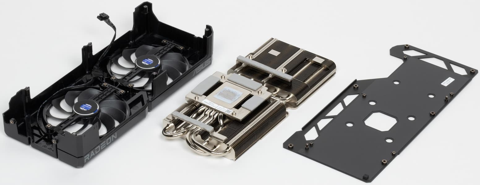 Трубки припаяны к большой медной никелированной пластине, которая охлаждает как ядро, так и микросхемы памяти (через термопрокладки). А для охлаждения преобразователей питания VRM имеются свои теплосъемники на радиаторе.