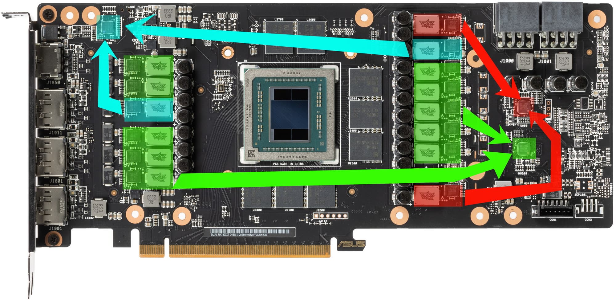 Зеленым цветом отмечена схема питания ядра, красным — памяти, голубым — питания SoC. Все ШИМ-контроллеры расположены на лицевой стороне PCB.