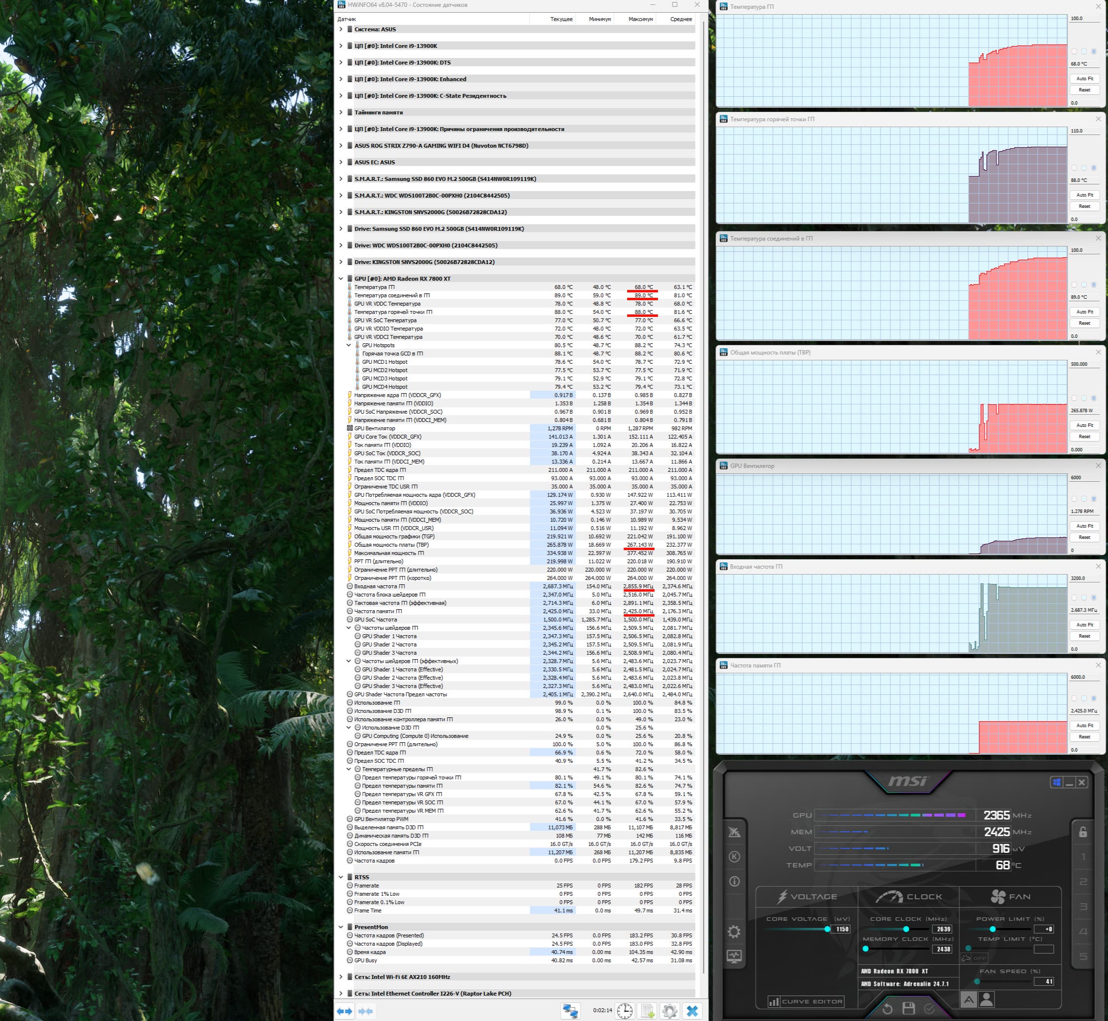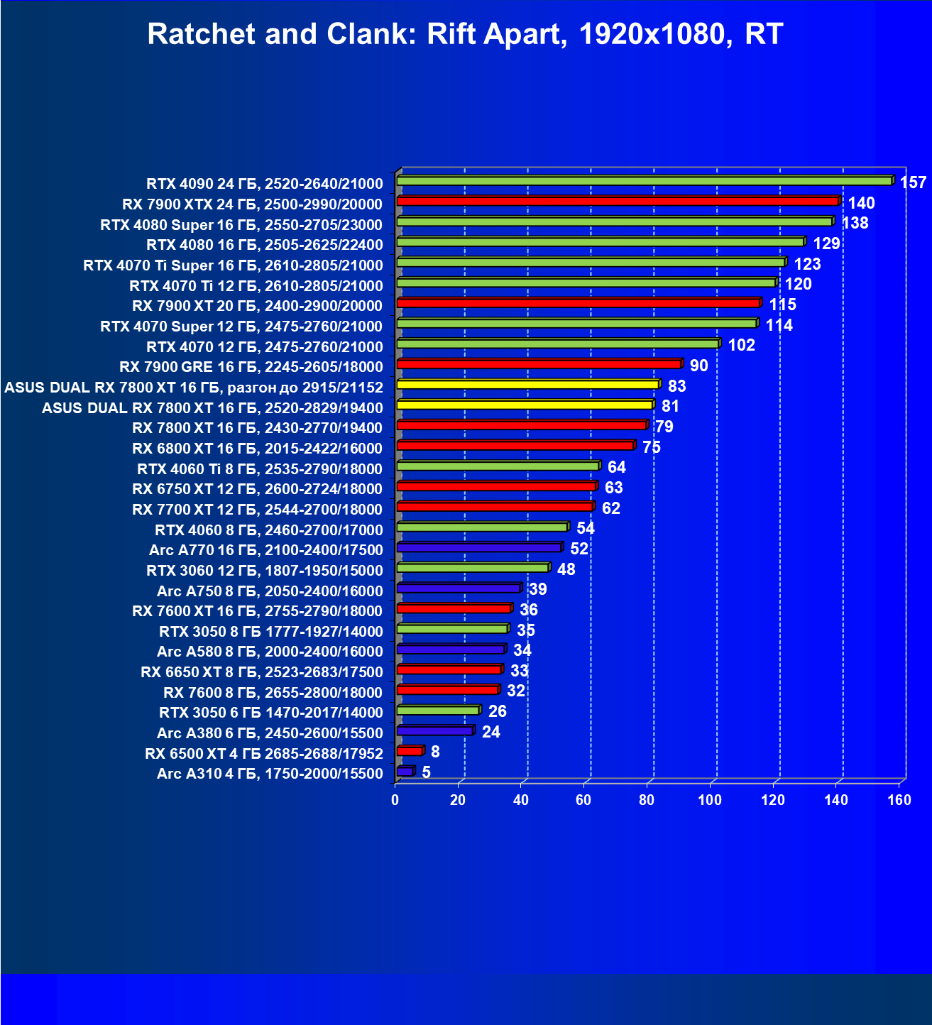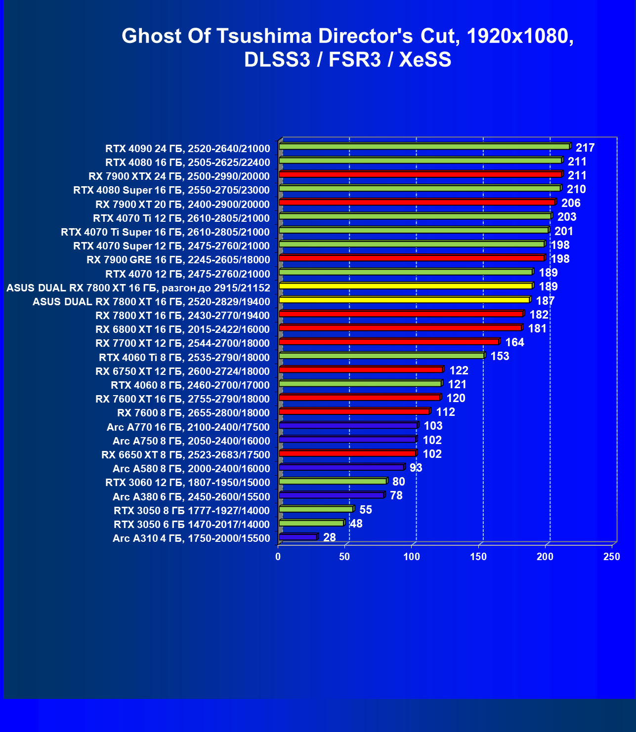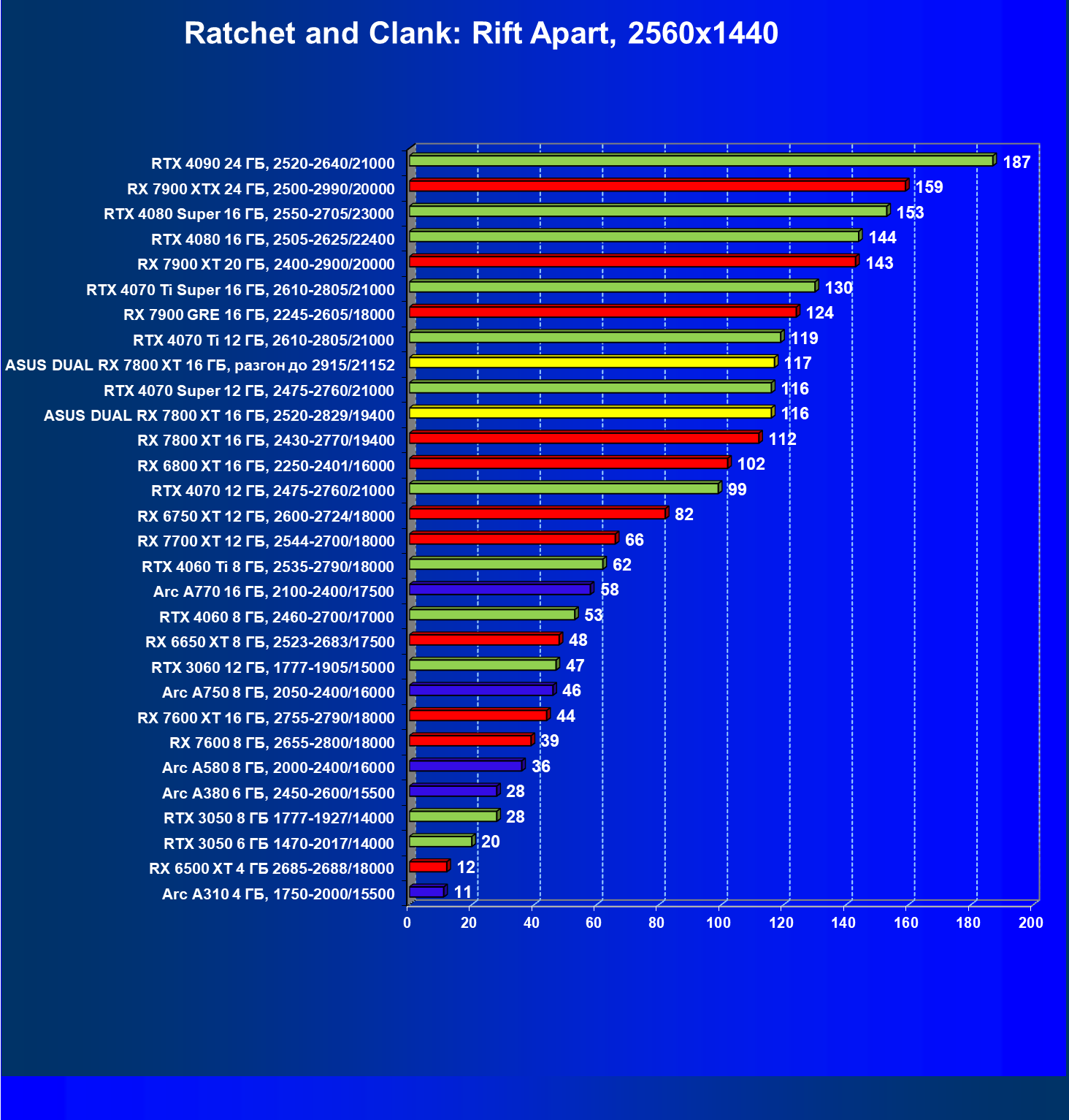 | 01 | Asus Dual RX 7800 XT 16 ГБ, разгон до 2915/21152 | 203 | 1156 | 57 000 |