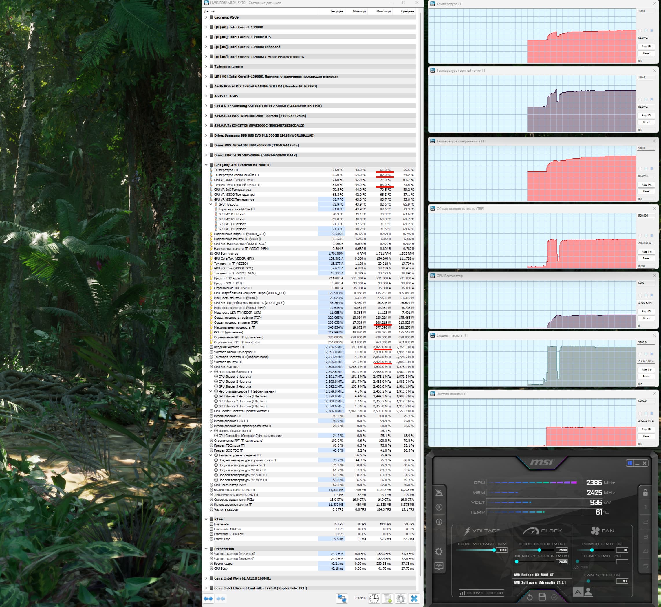 При ручном разгоне параметры нагрева и шума менялись мало (62/88 °С), но максимальное потребление выросло до 304 Вт, прибавилось 4% производительности, при этом температура самой горячей точки ГП (hot spot) составляла 89 °C.