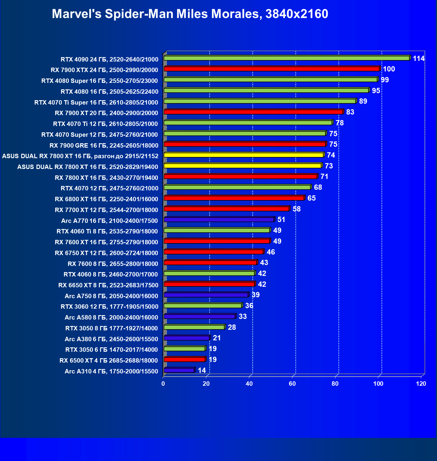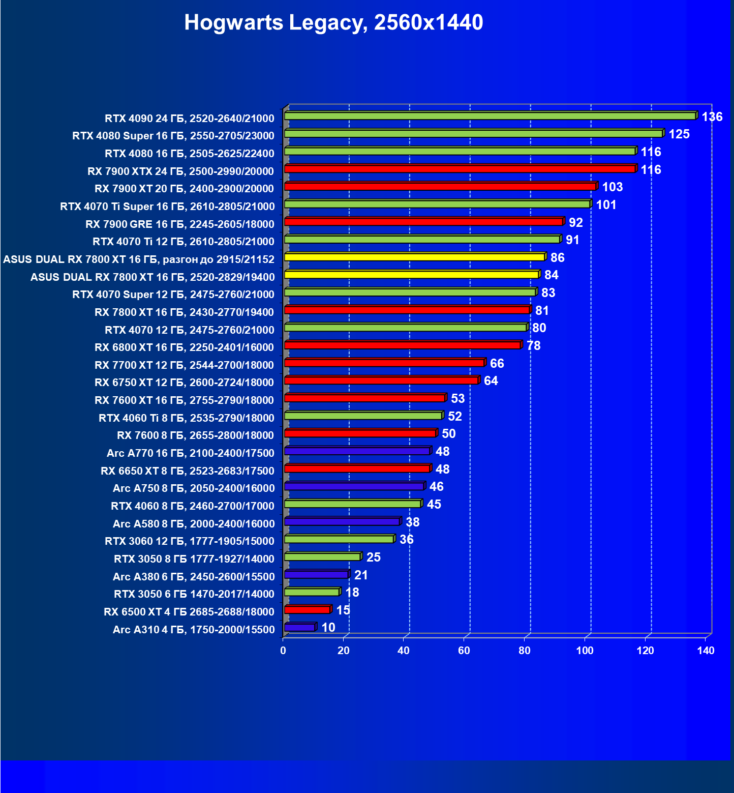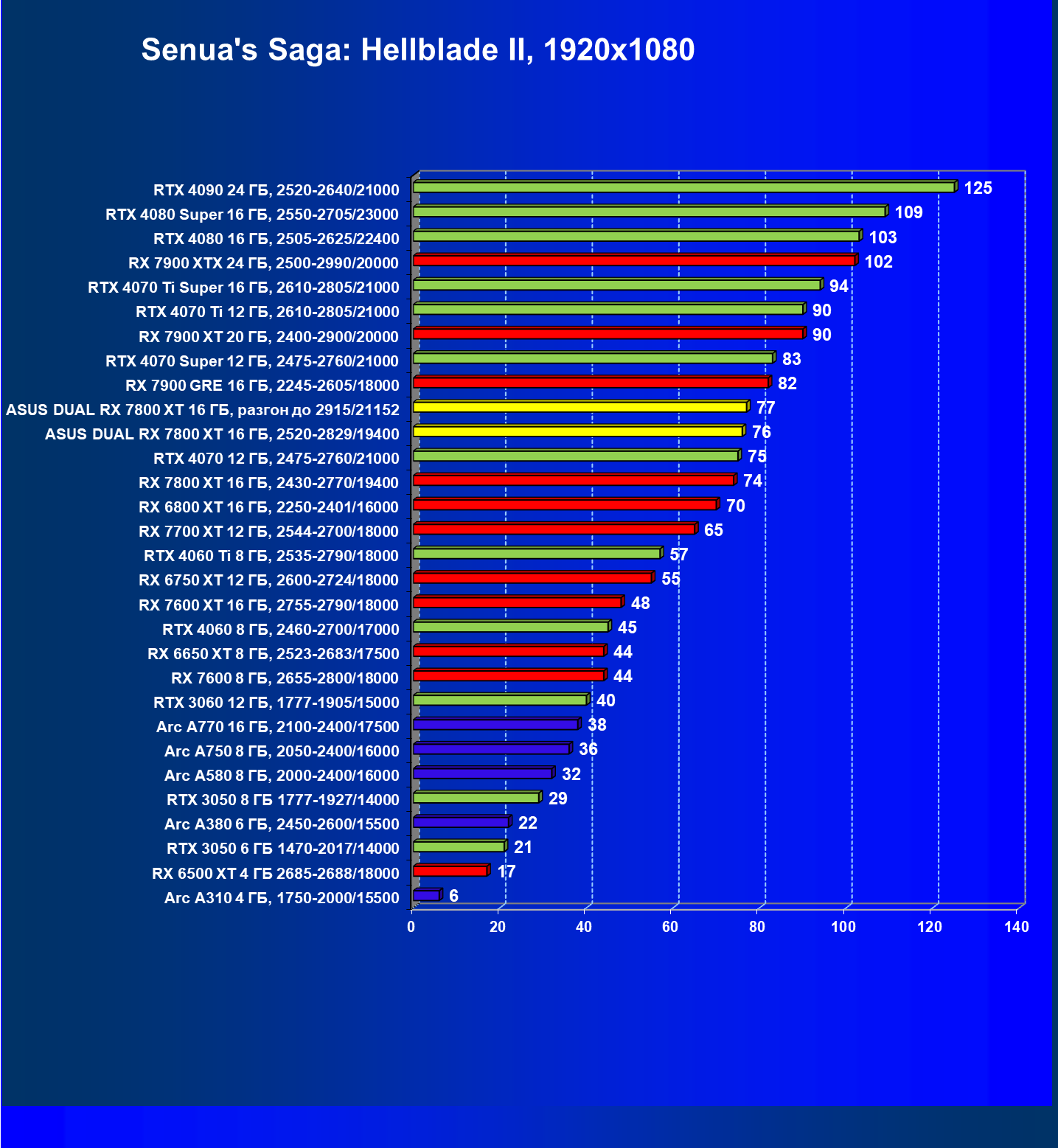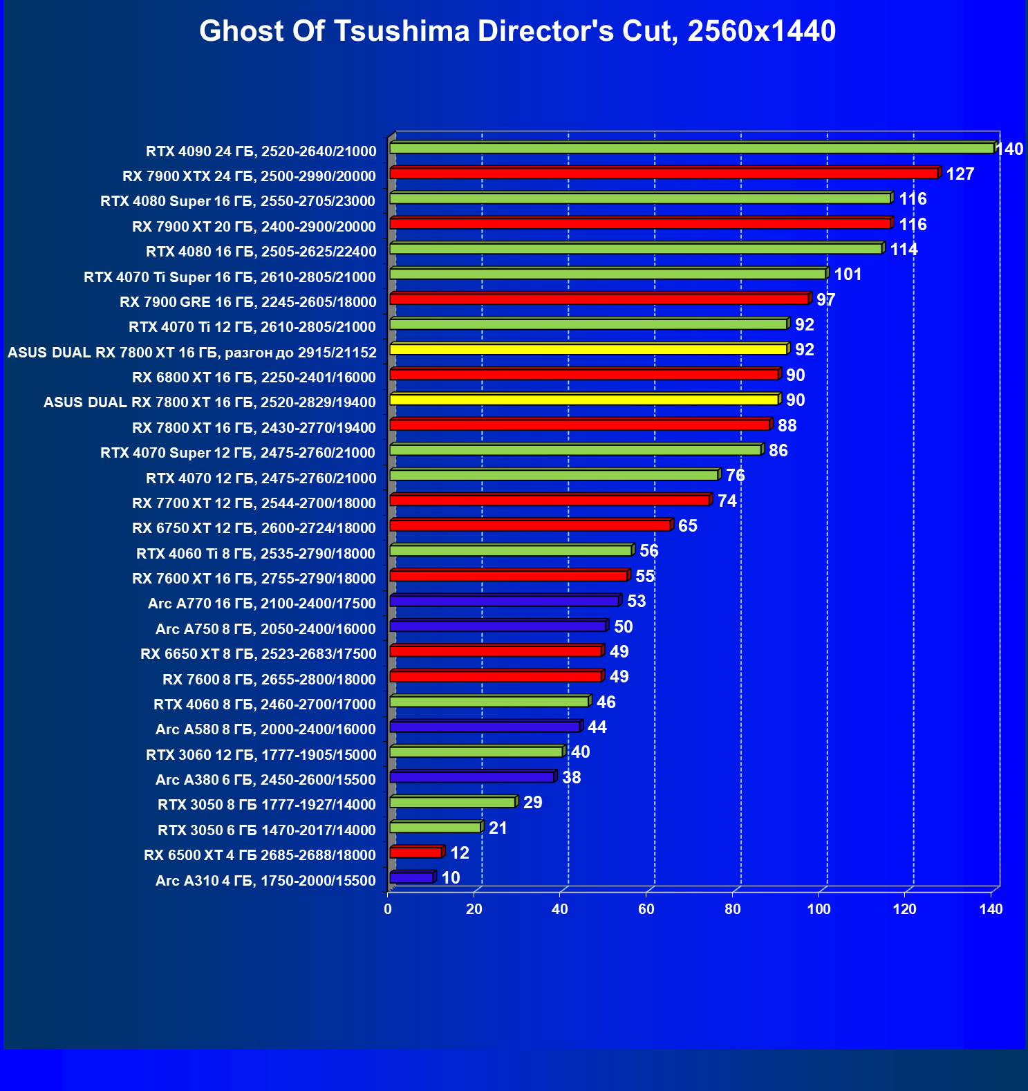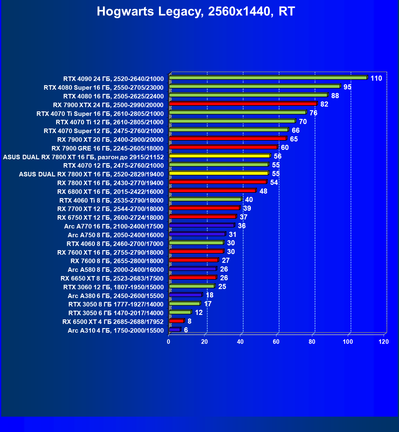 | 14 | RX 7800 XT 16 ГБ, 2430—2770/19400 | 1684 | 295 | 57 000 |