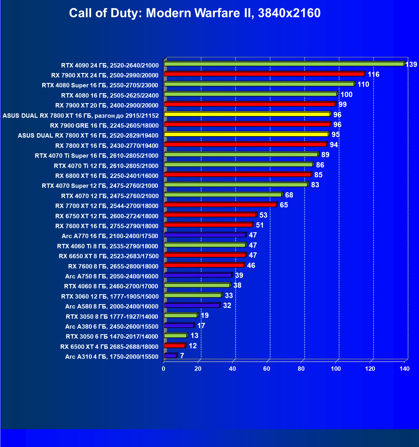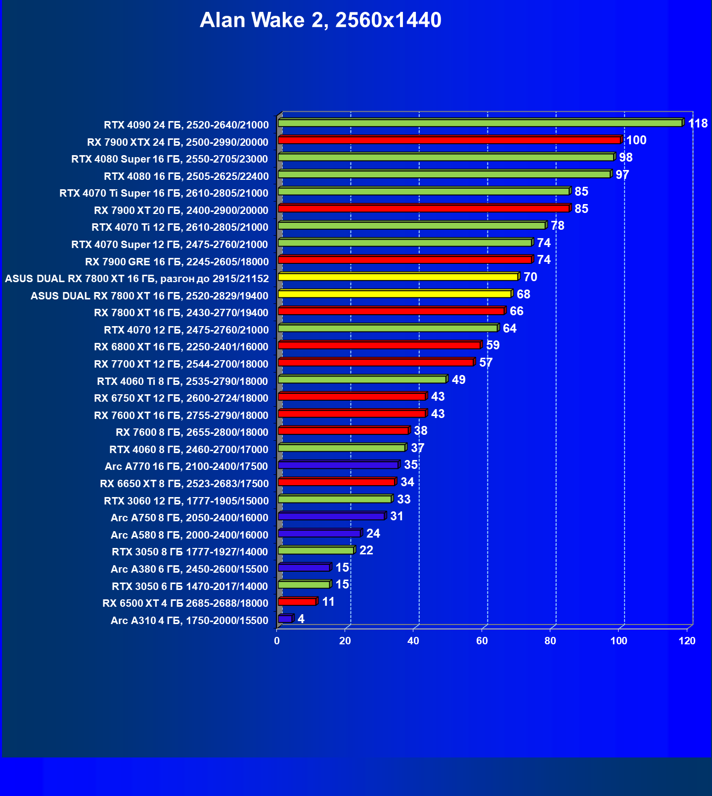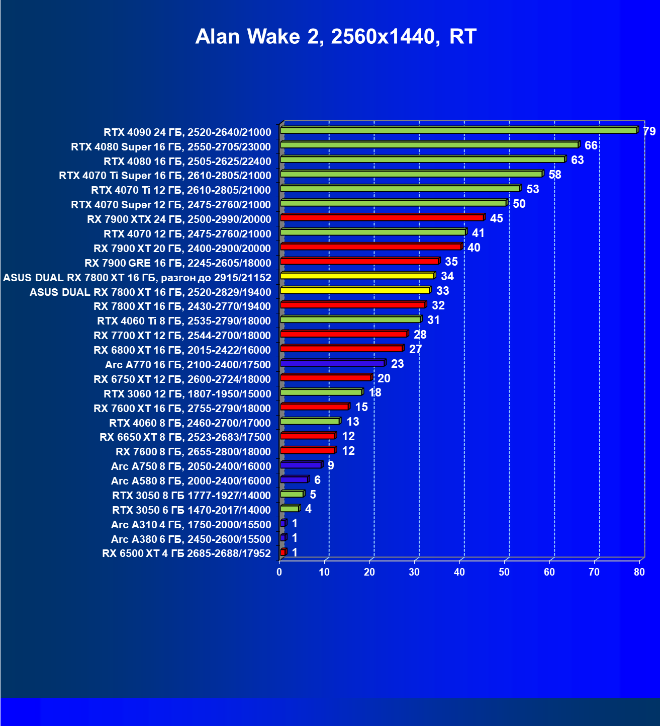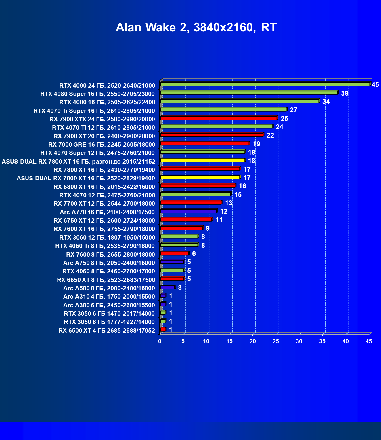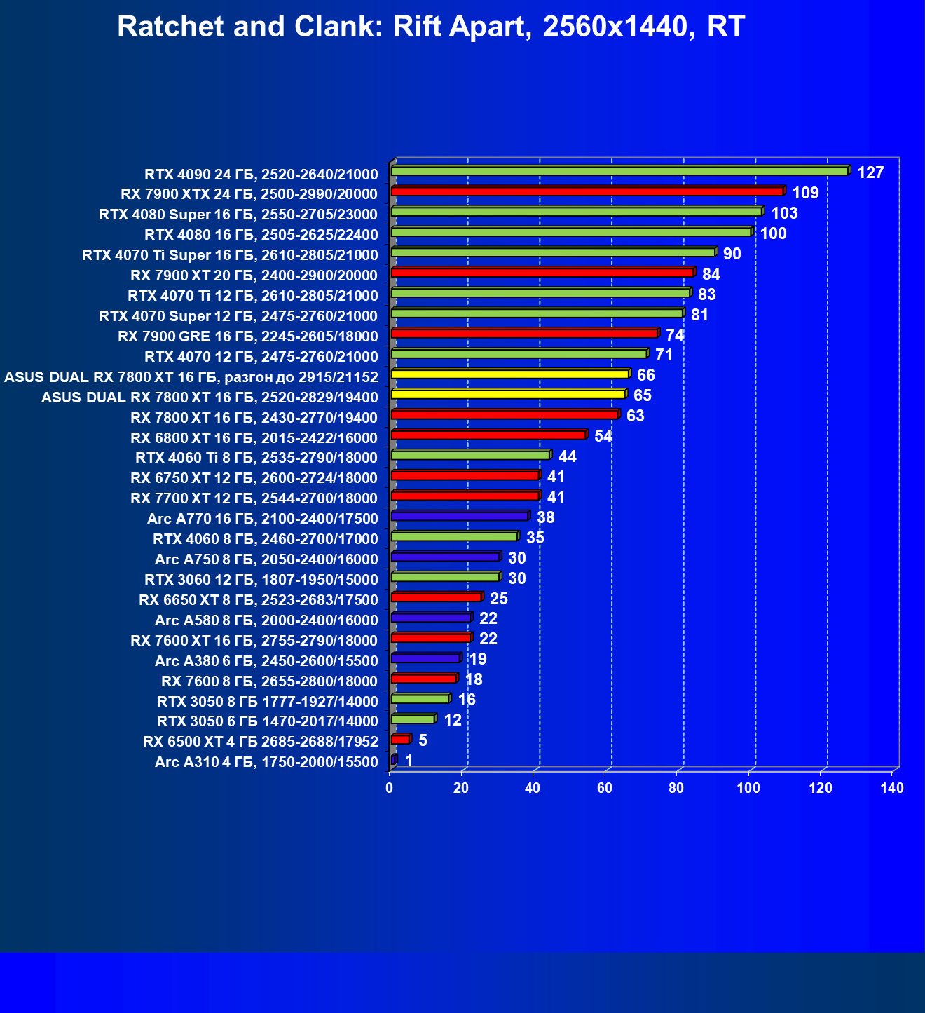 | 14 | RX 7800 XT 16 ГБ, 2430—2770/19400 | 1684 | 295 | 57 000 |
