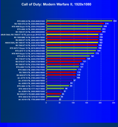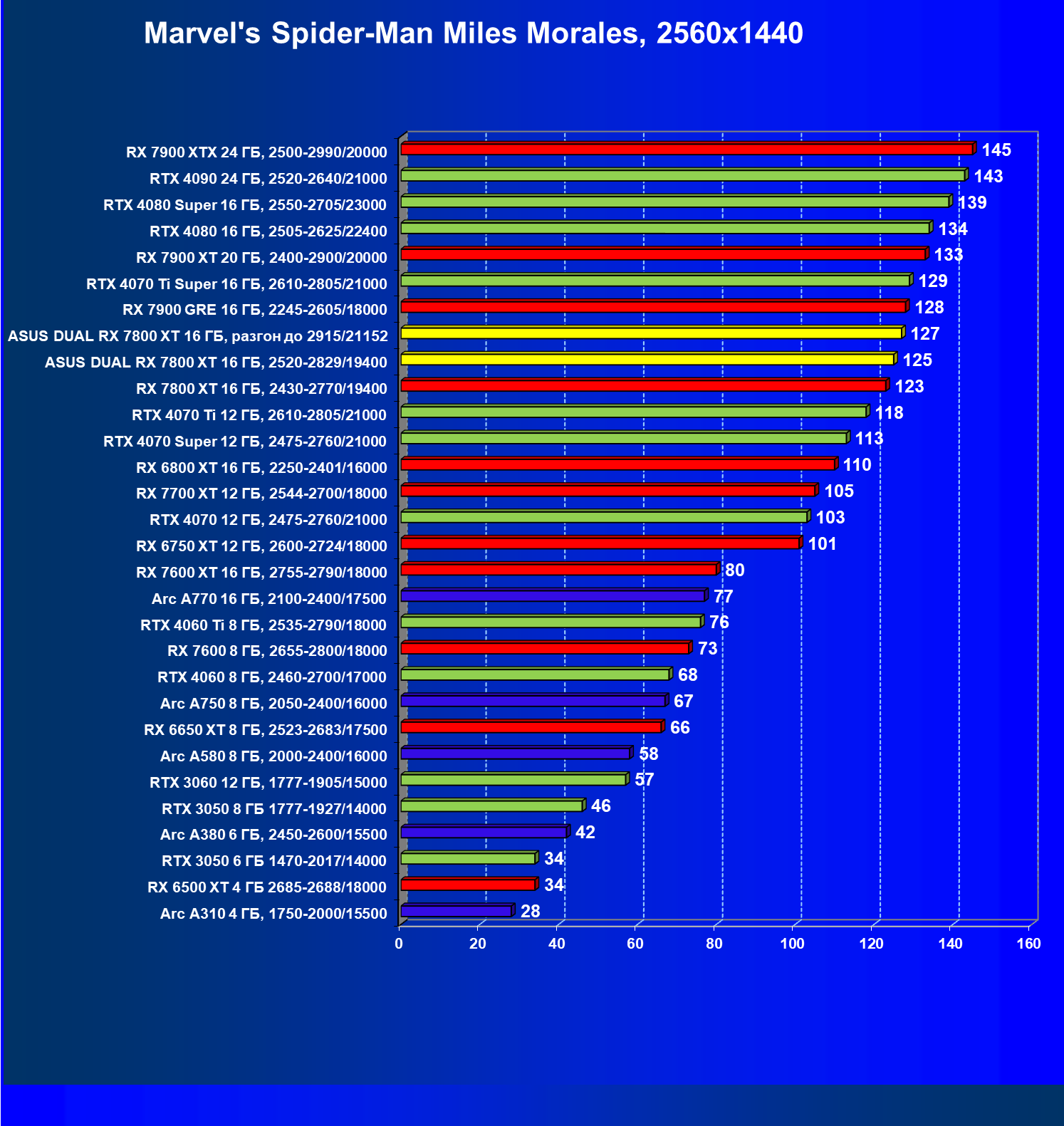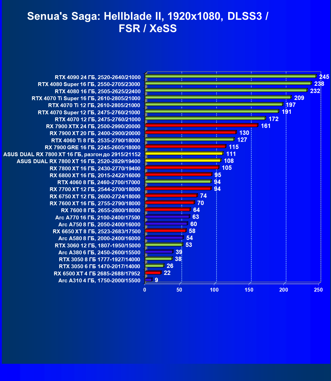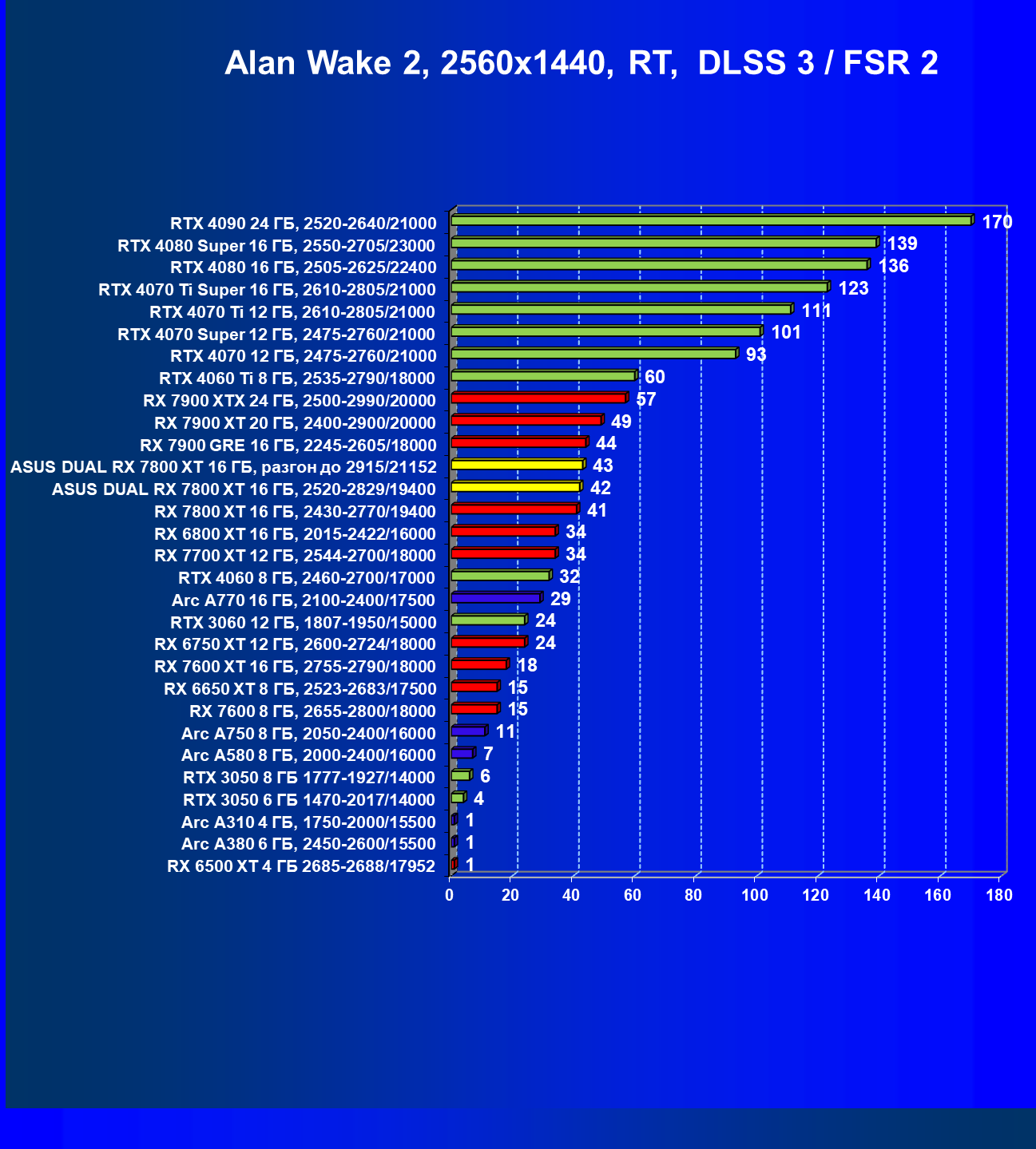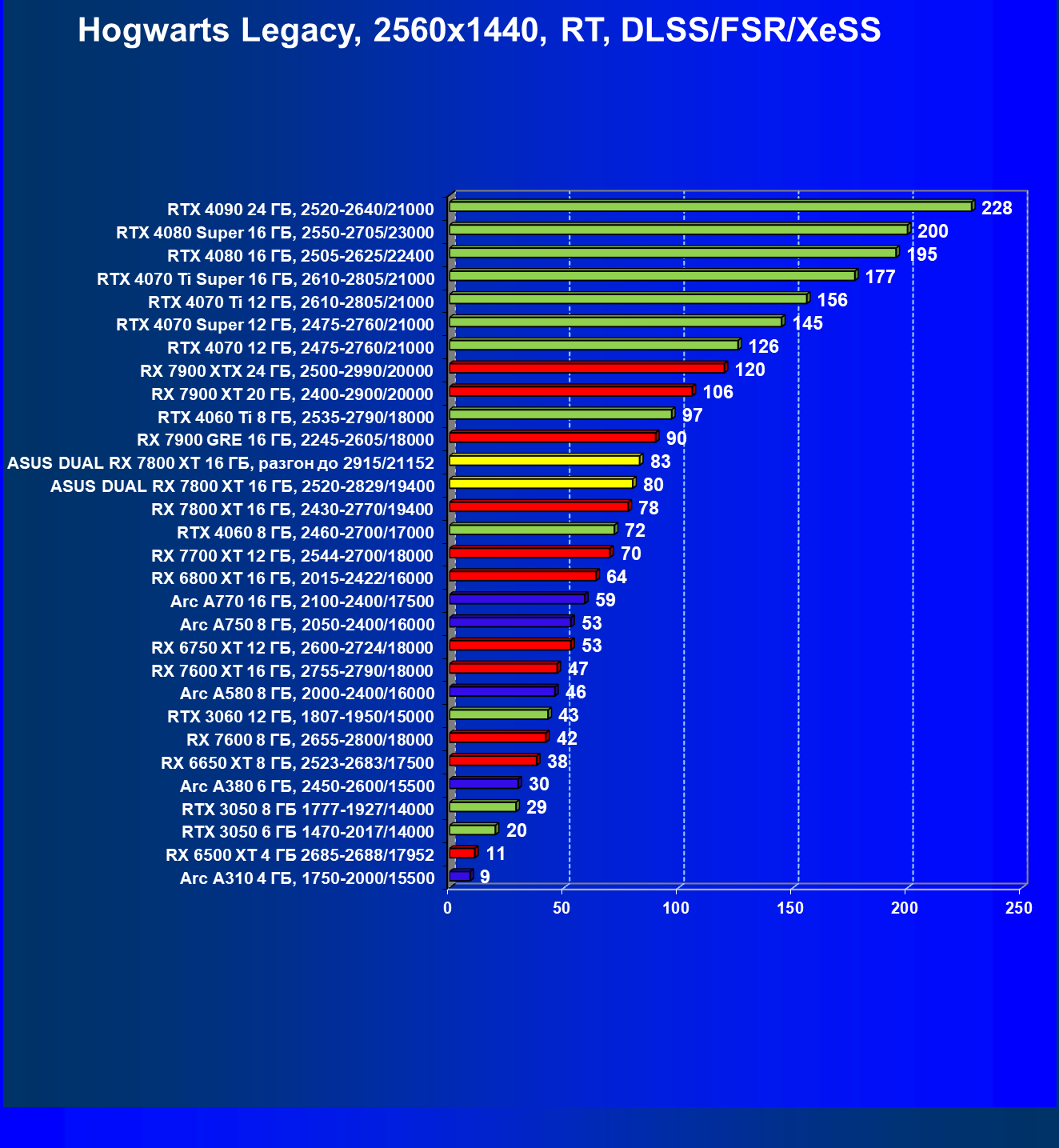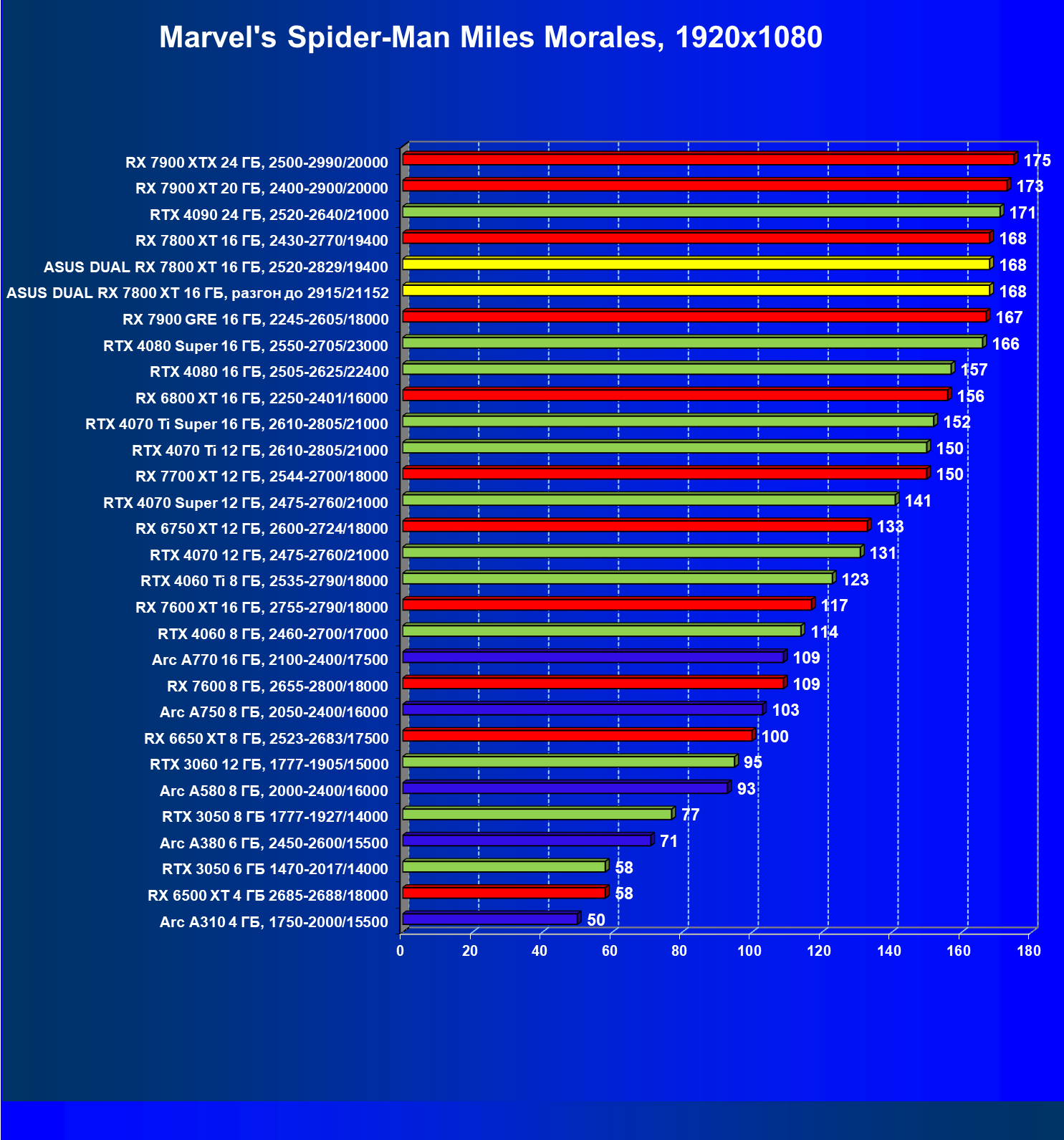 | 14 | RX 7800 XT 16 ГБ, 2430—2770/19400 | 1684 | 295 | 57 000 |
