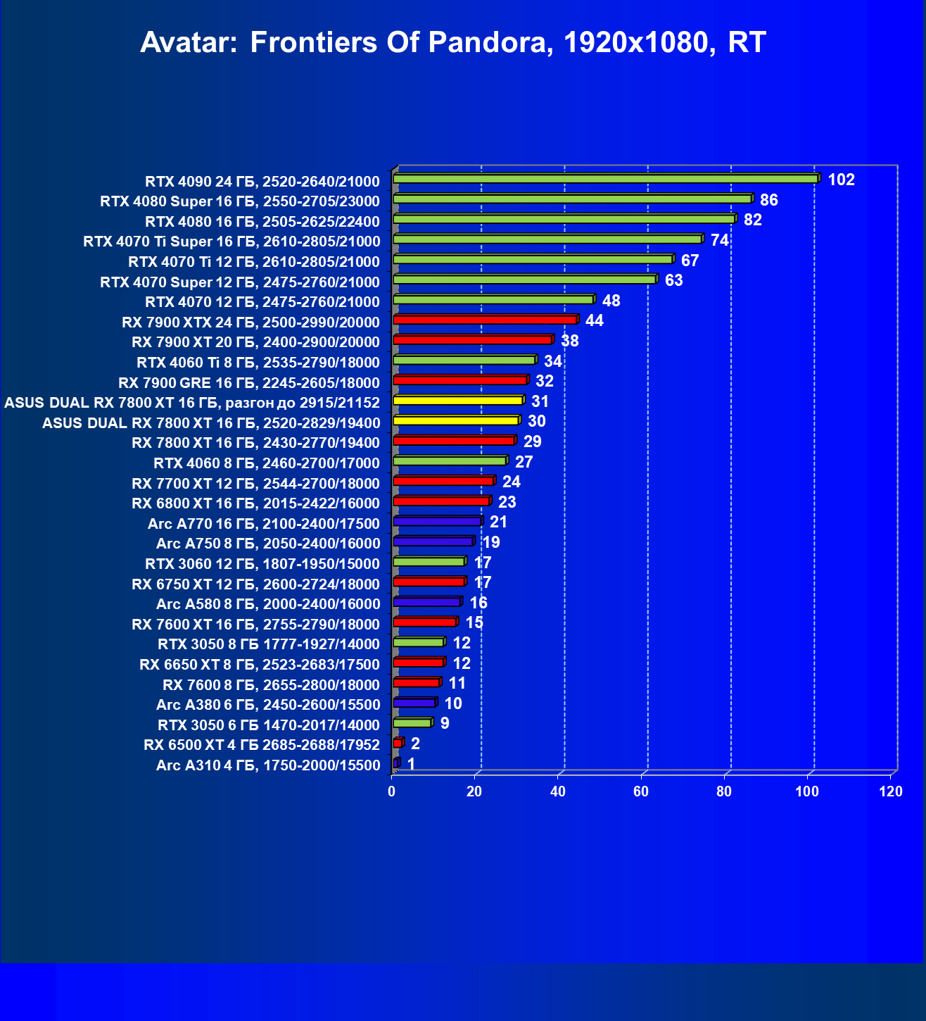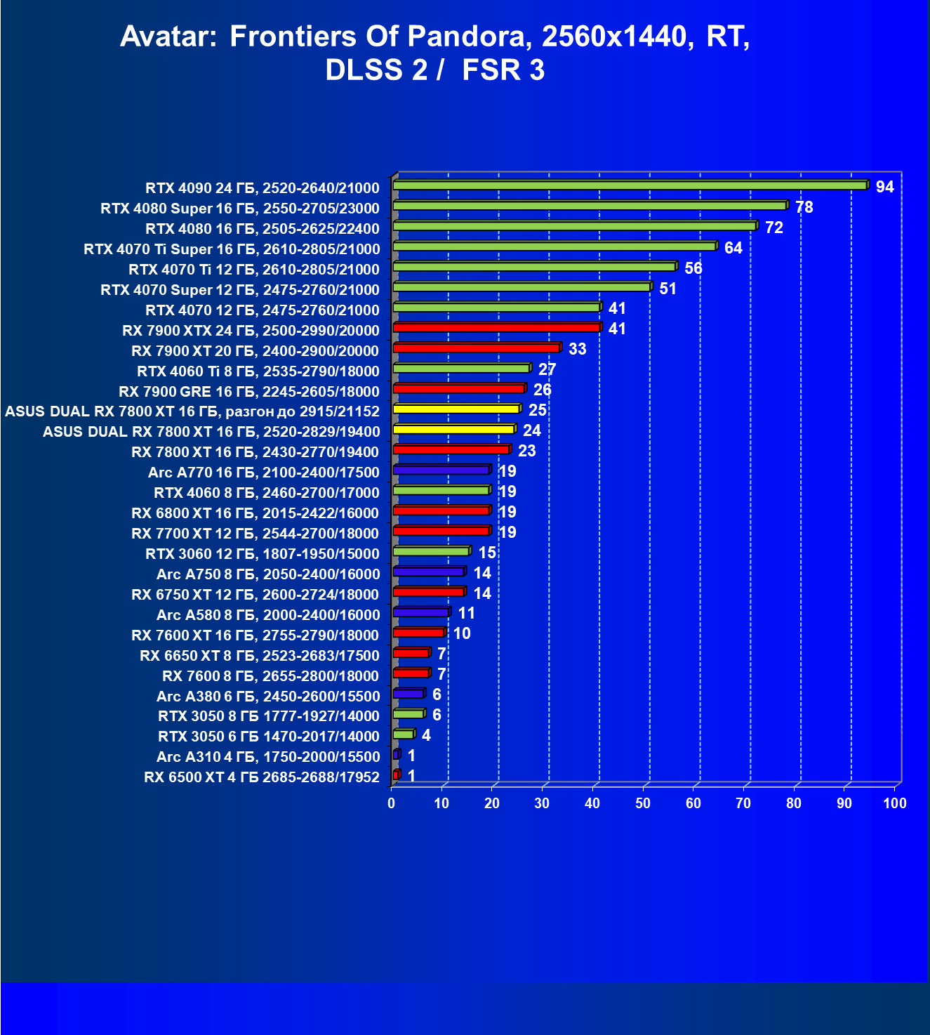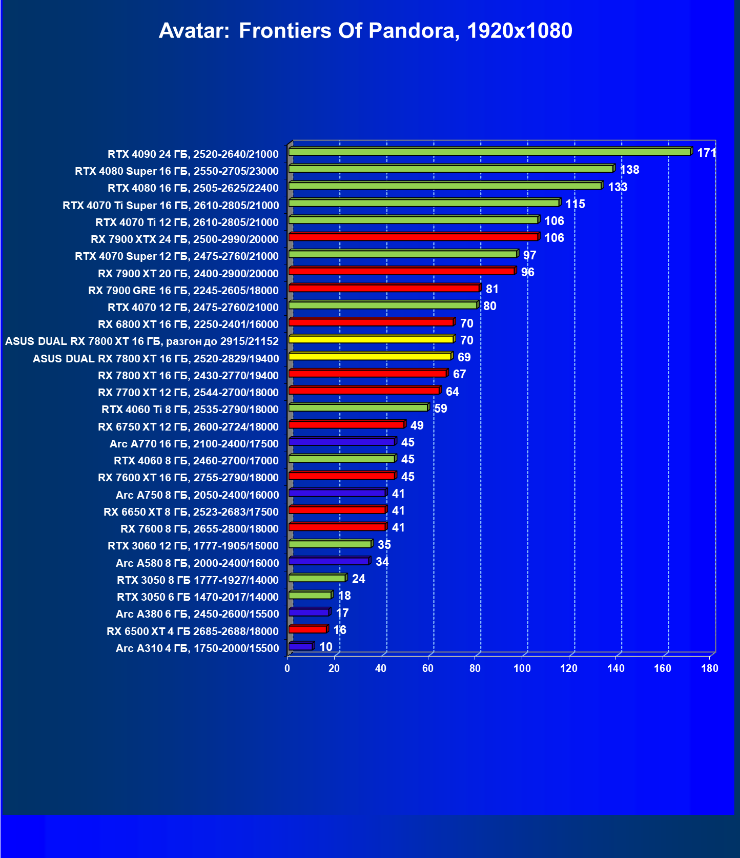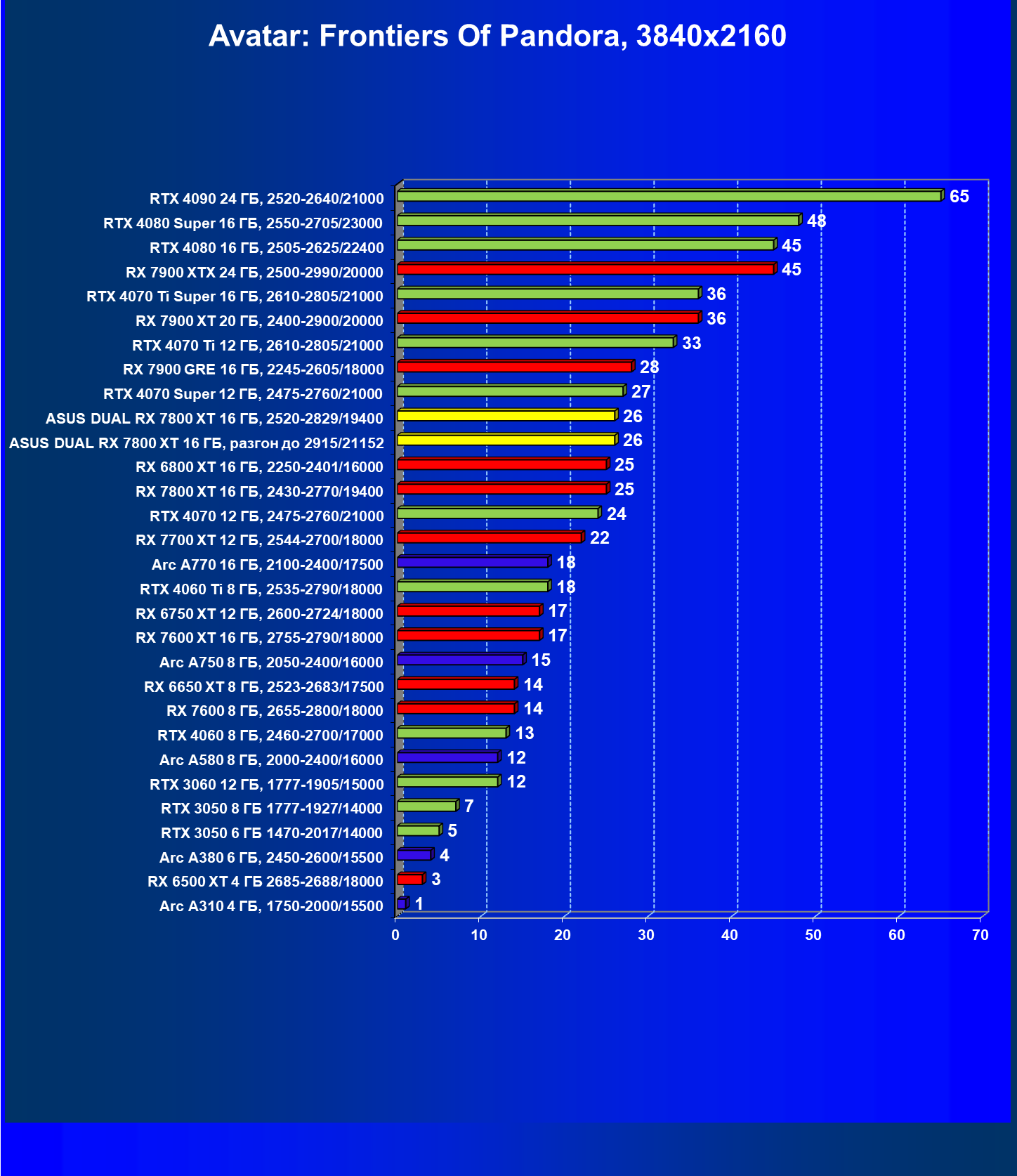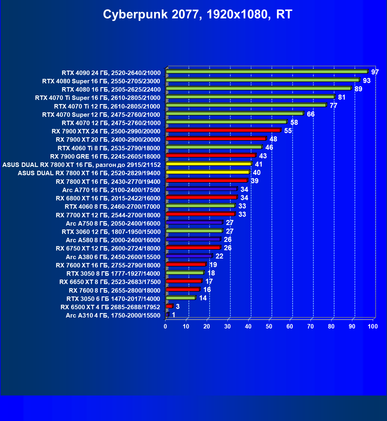 | 11 | Asus Dual RX 7800 XT 16 ГБ, разгон до 2915/21152 | 1769 | 310 | 57 000 |