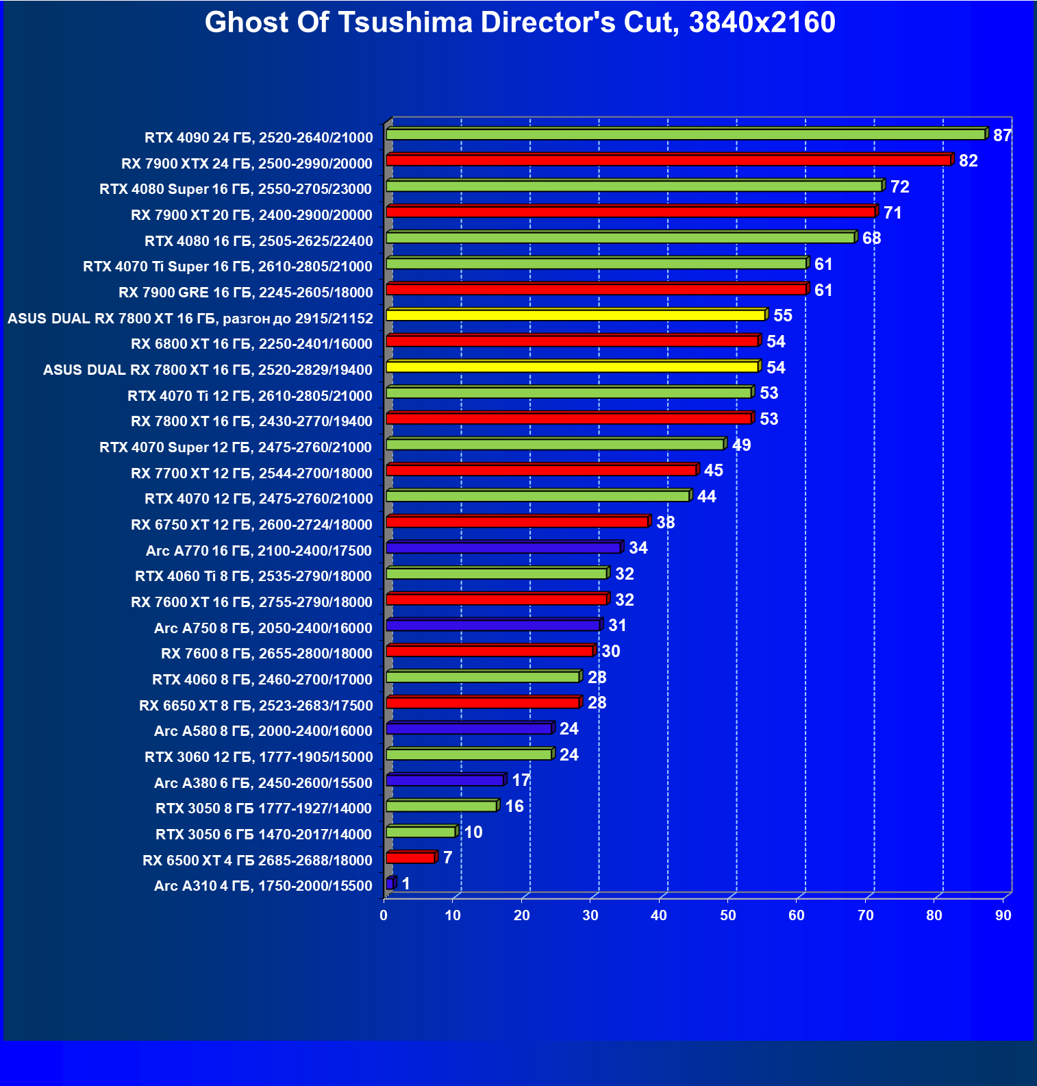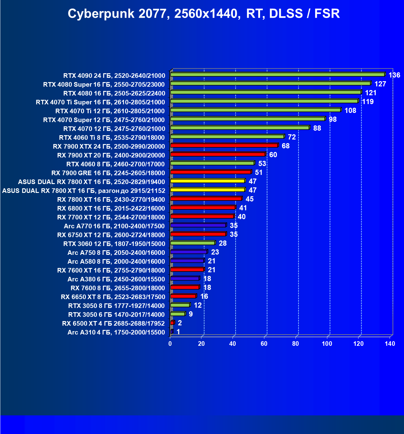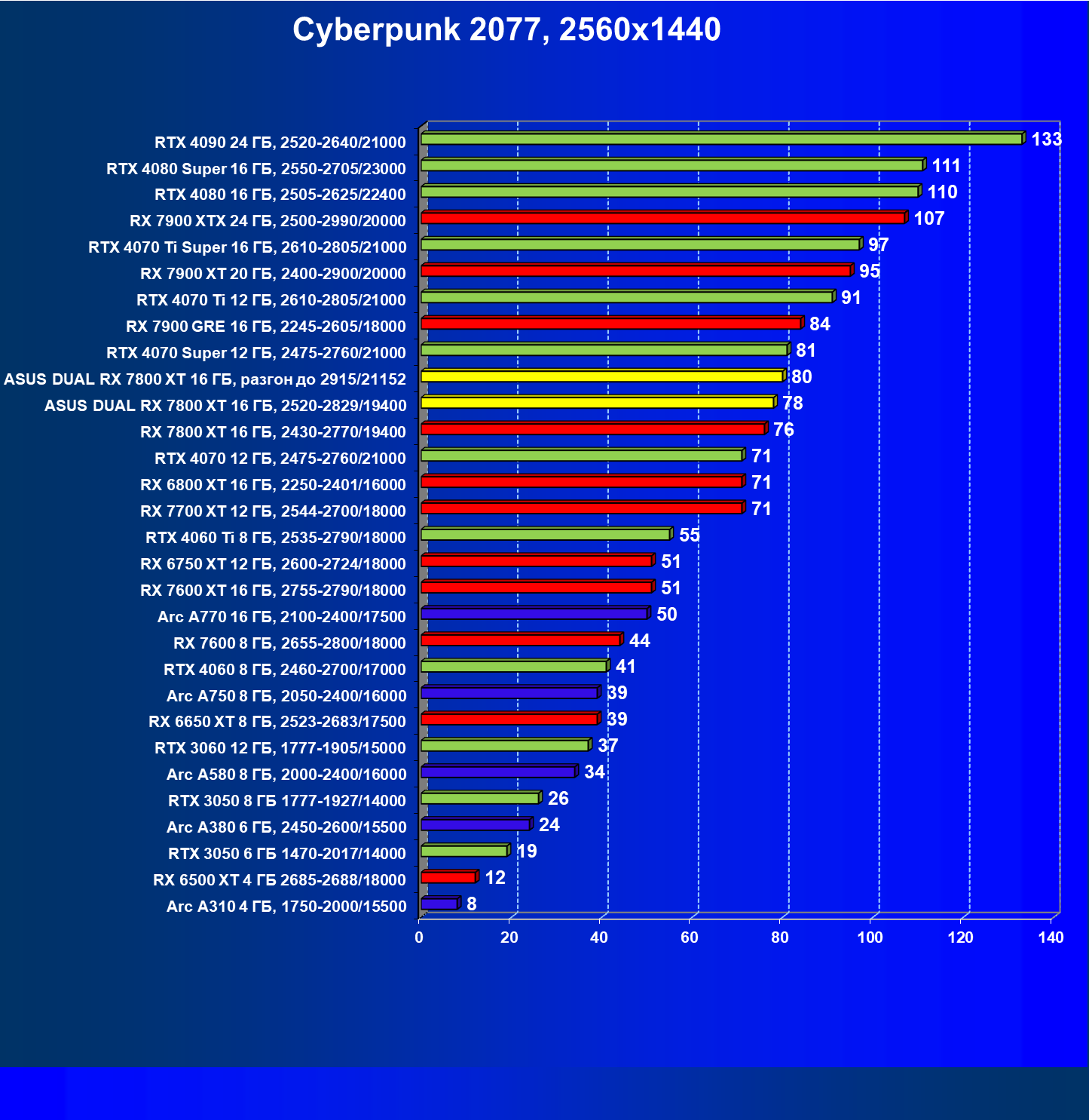 | 13 | Asus Dual RX 7800 XT 16 ГБ, 2520—2829/19400 | 1734 | 304 | 57 000 |