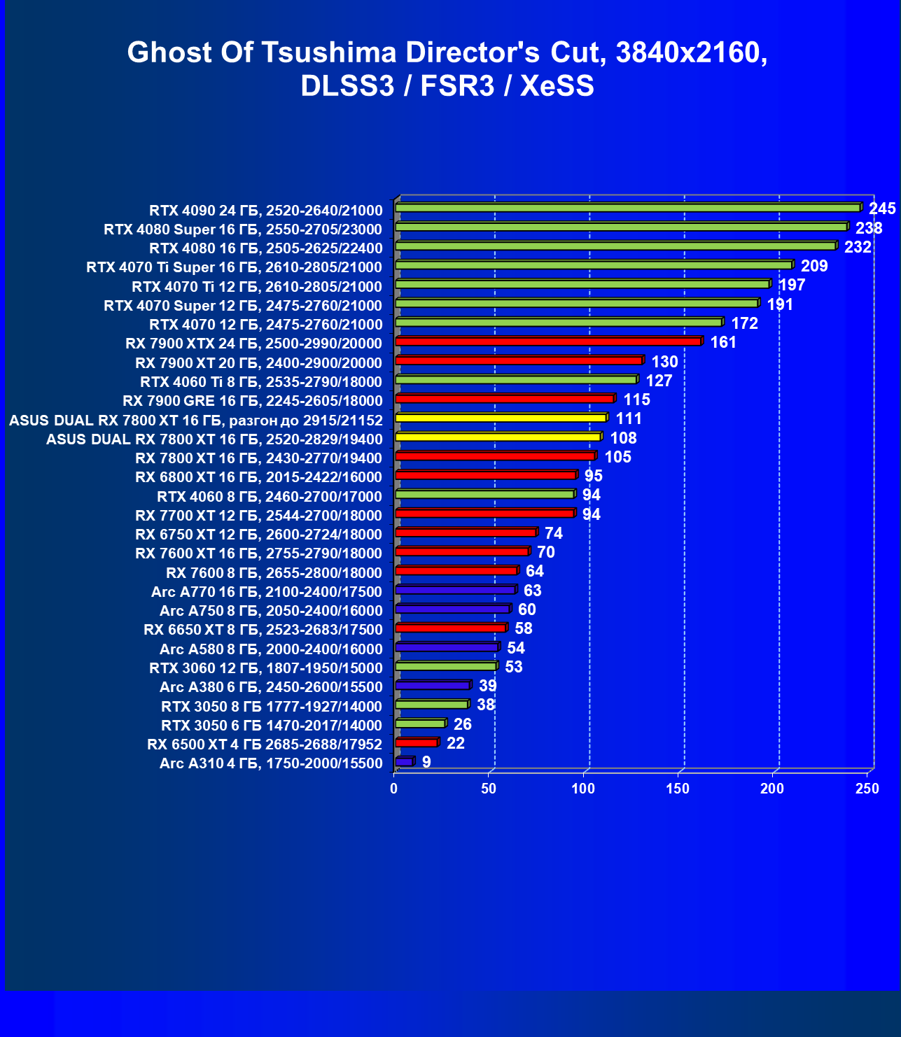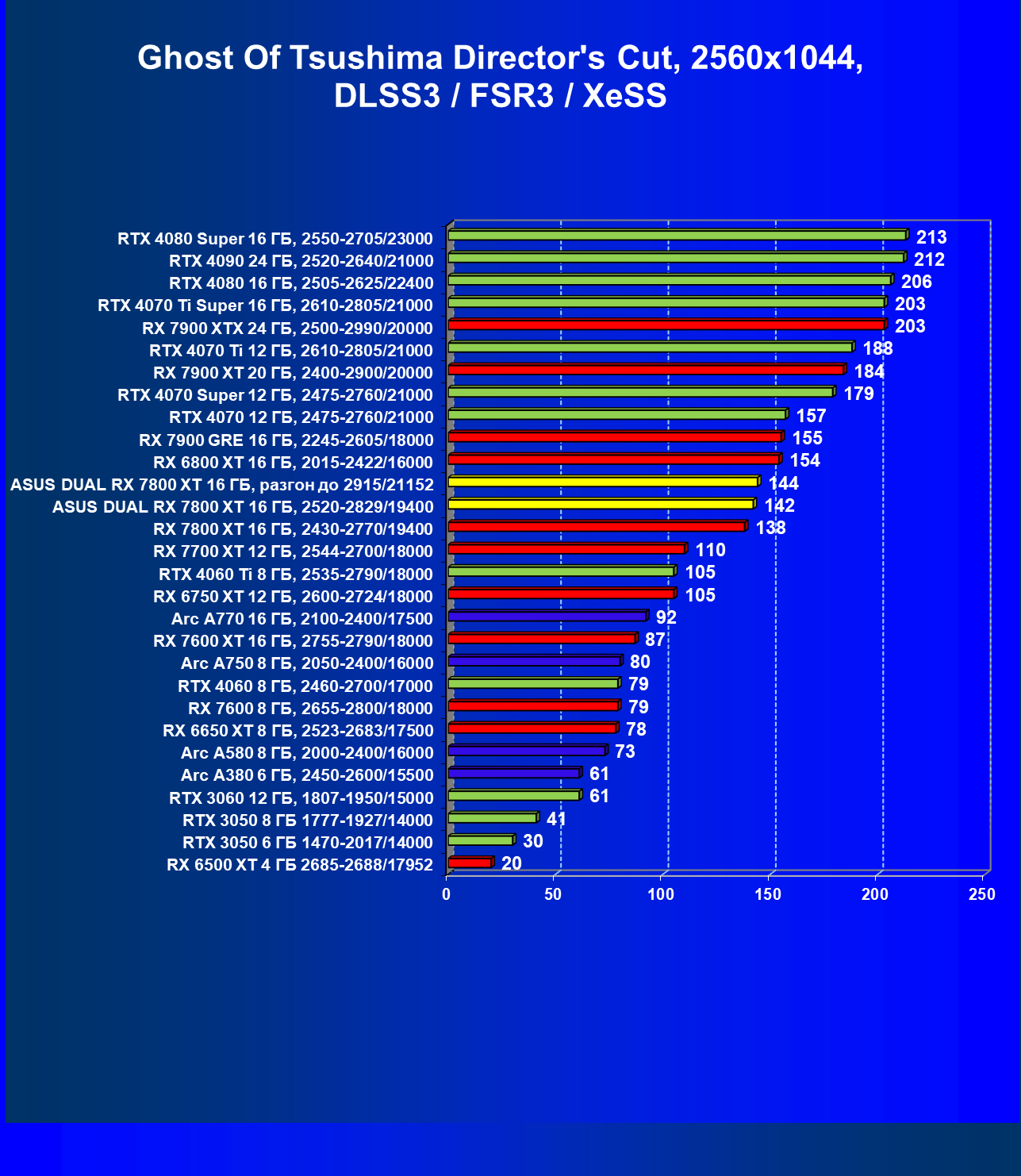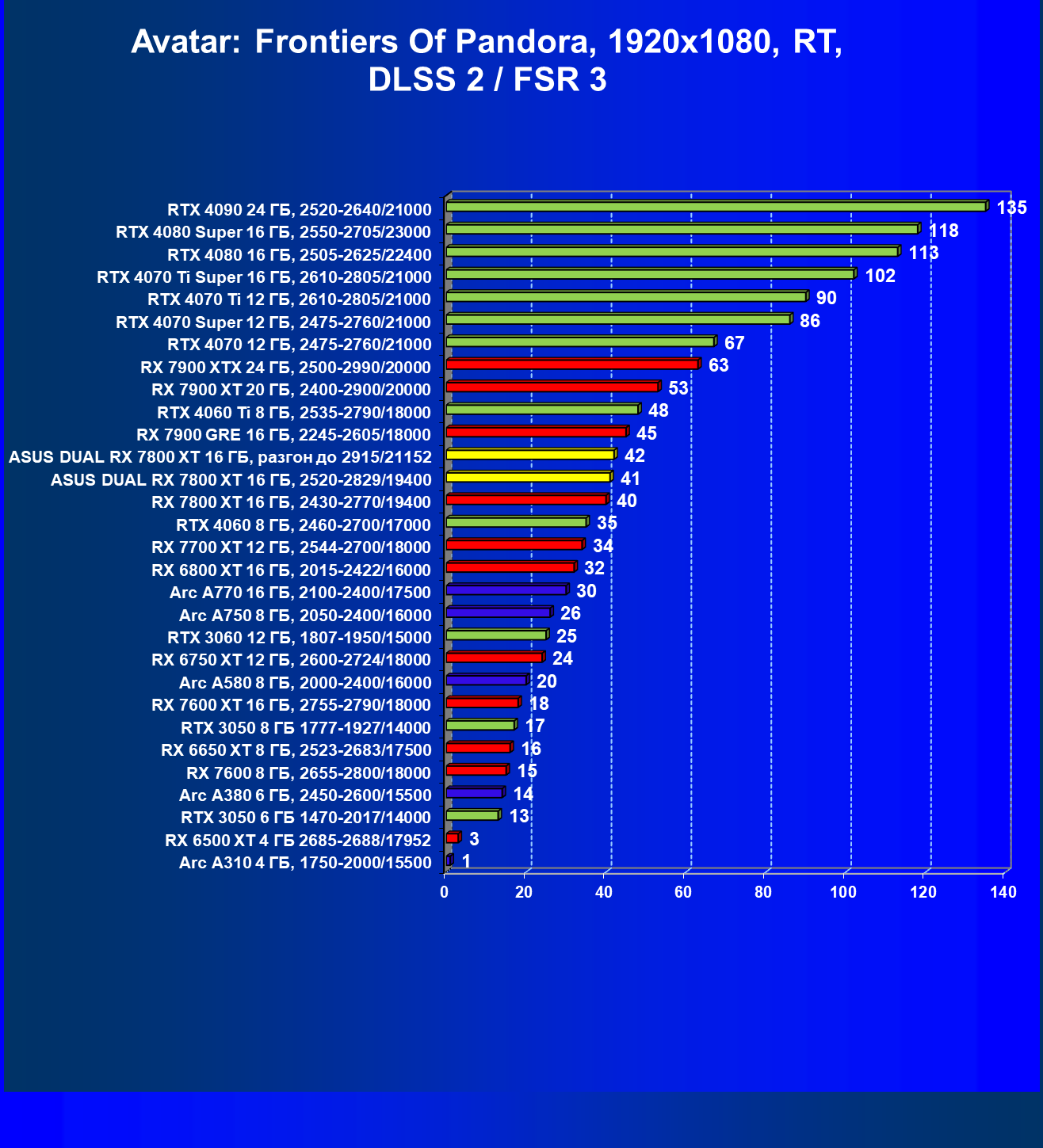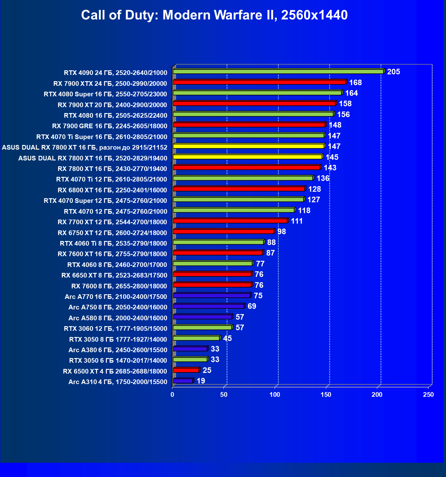 | 13 | Asus Dual RX 7800 XT 16 ГБ, 2520—2829/19400 | 1734 | 304 | 57 000 |