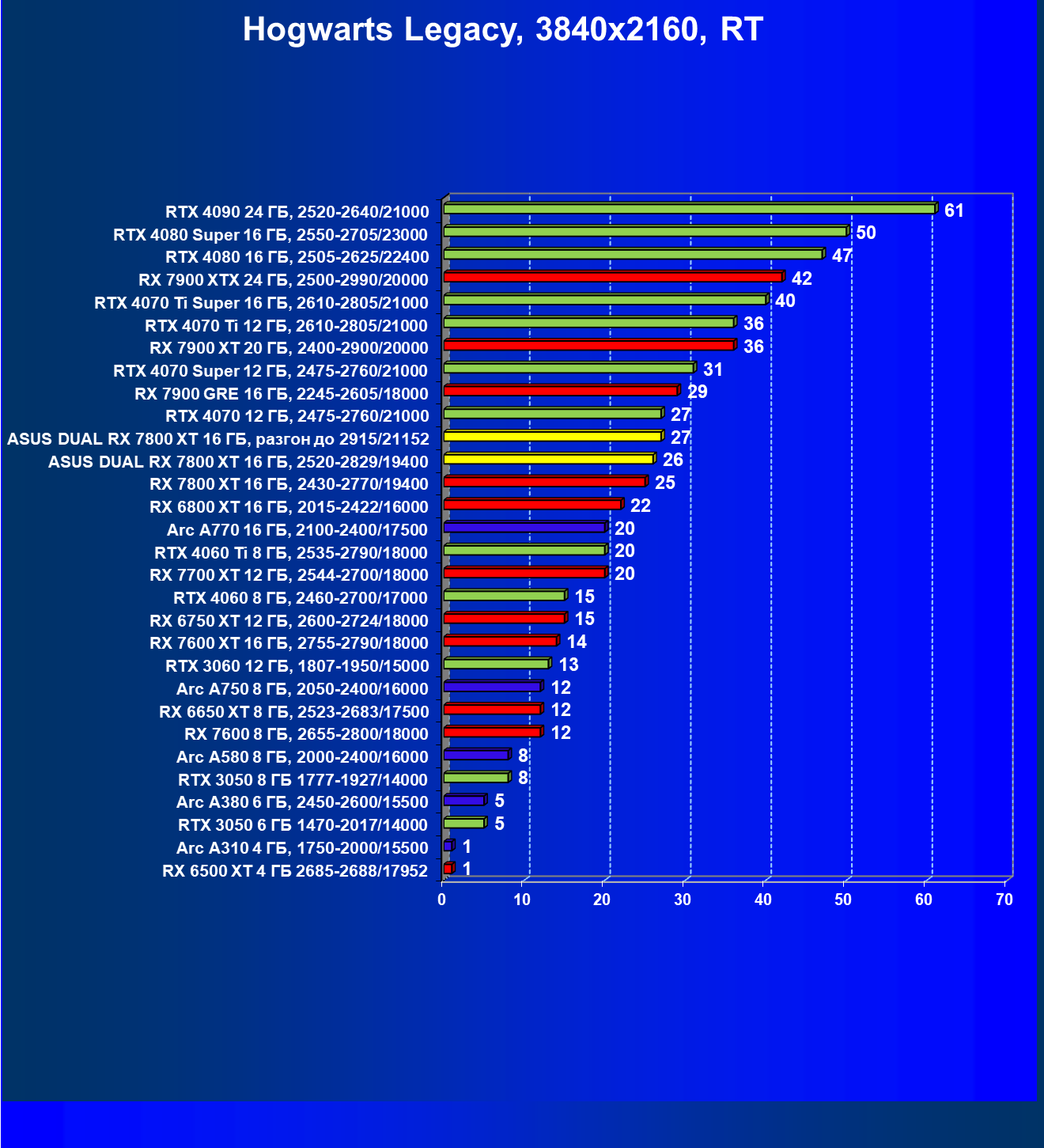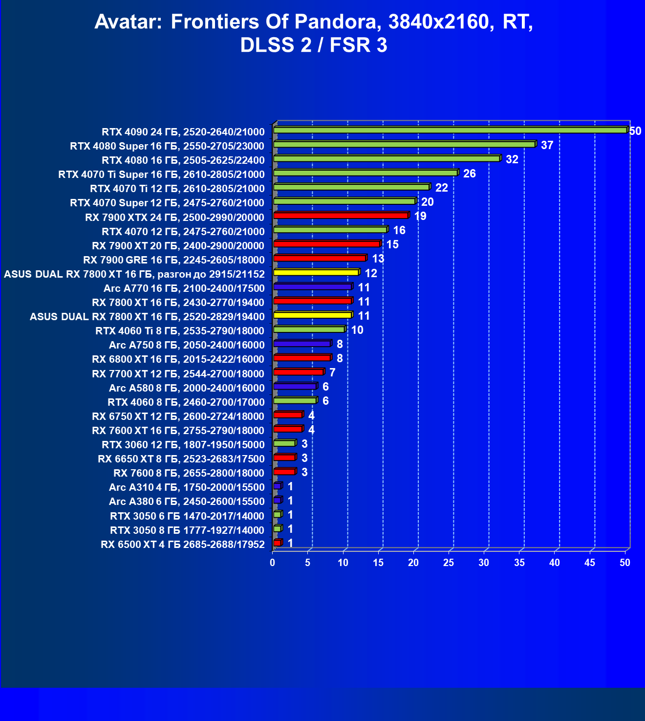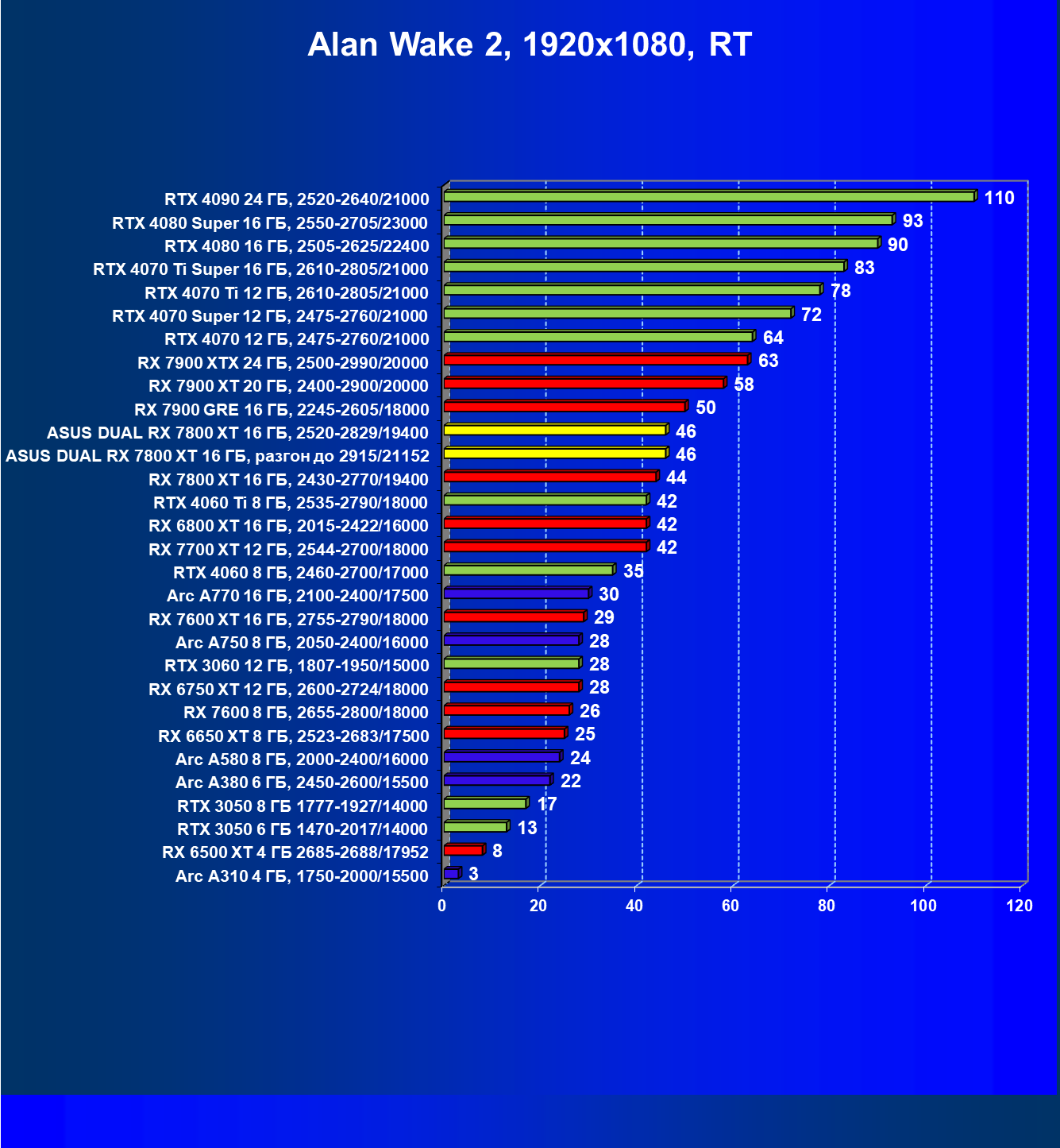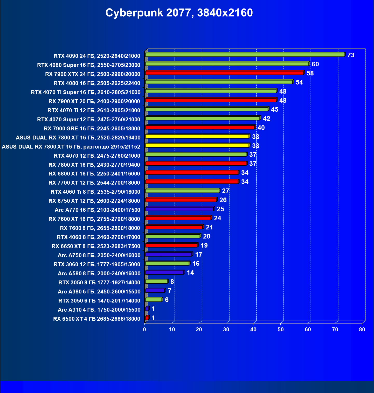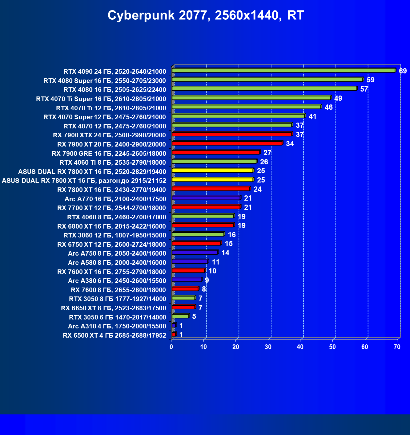 | 11 | Asus Dual RX 7800 XT 16 ГБ, разгон до 2915/21152 | 310 | 1769 | 57 000 |