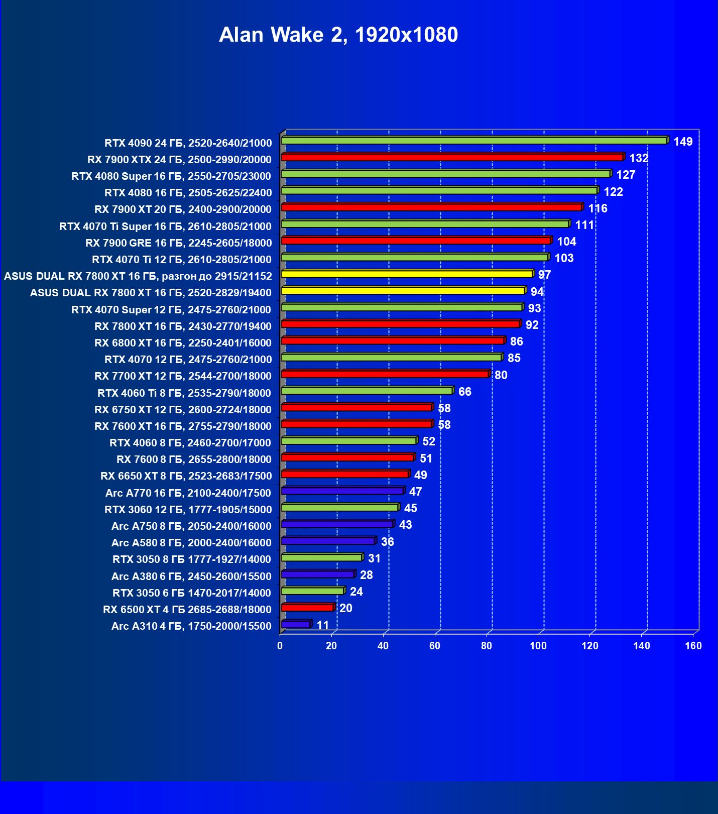 | 11 | Asus Dual RX 7800 XT 16 ГБ, 2520—2829/19400 | 1137 | 199 | 57 000 |
