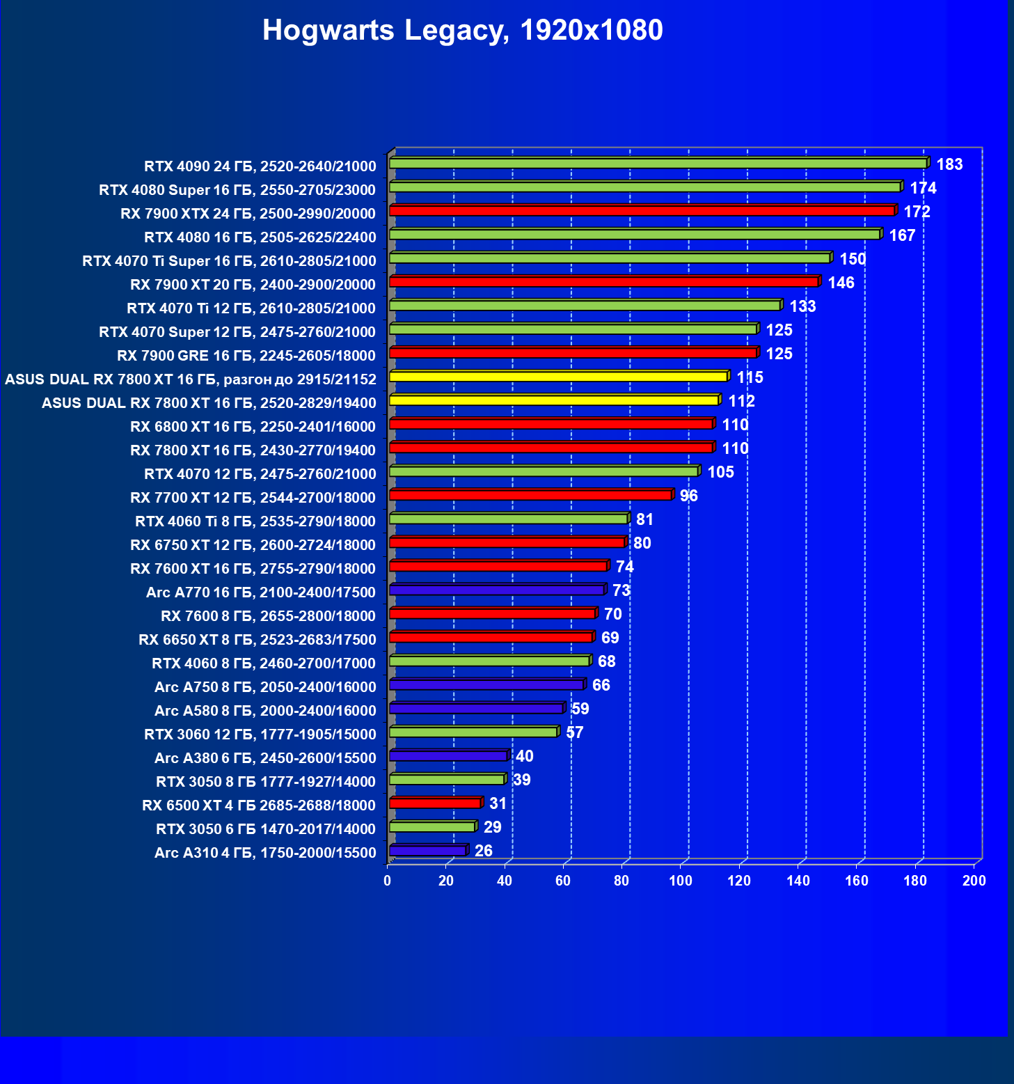 | 12 | RX 7800 XT 16 ГБ, 2430—2770/19400 | 1109 | 195 | 57 000 |
