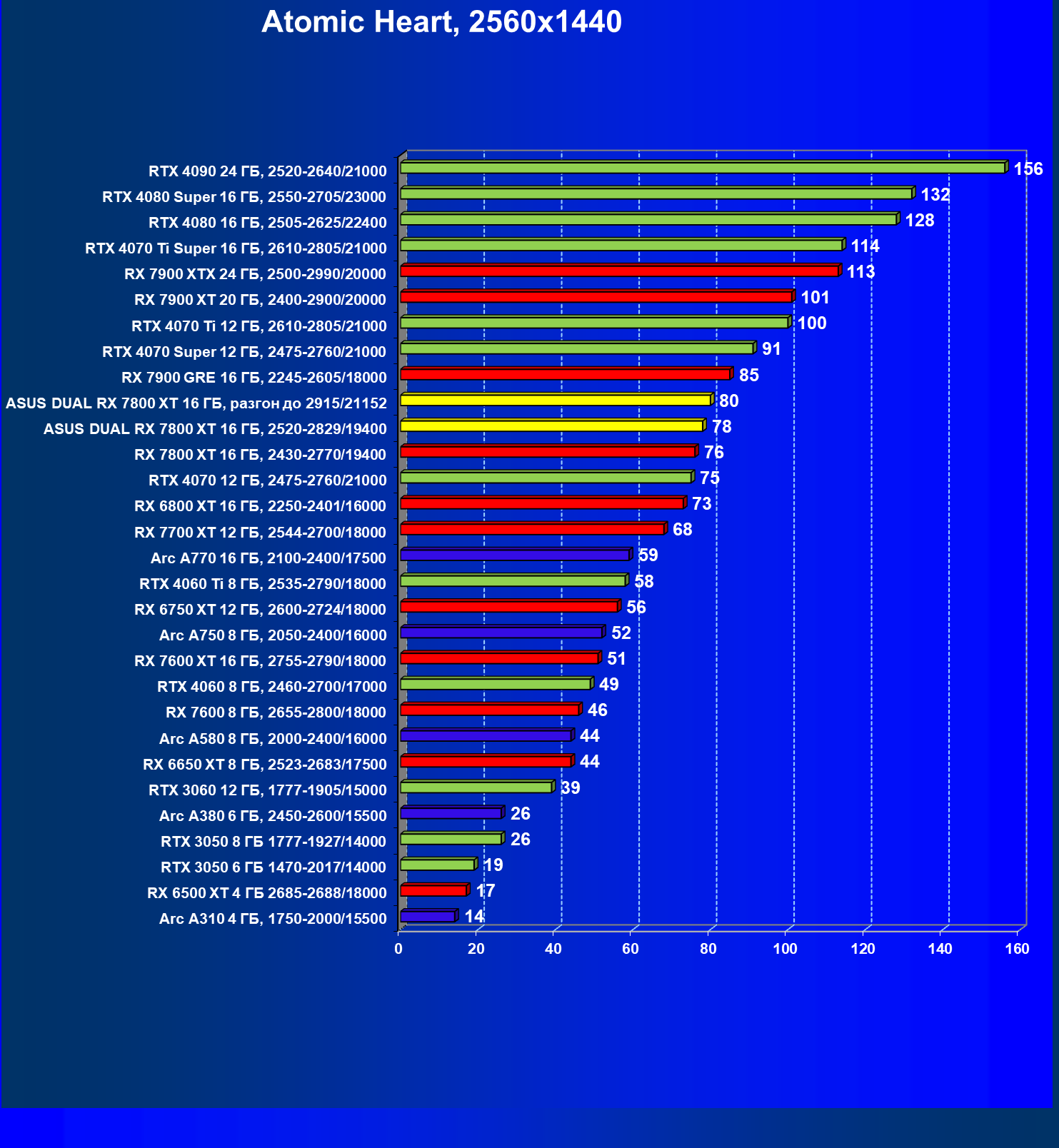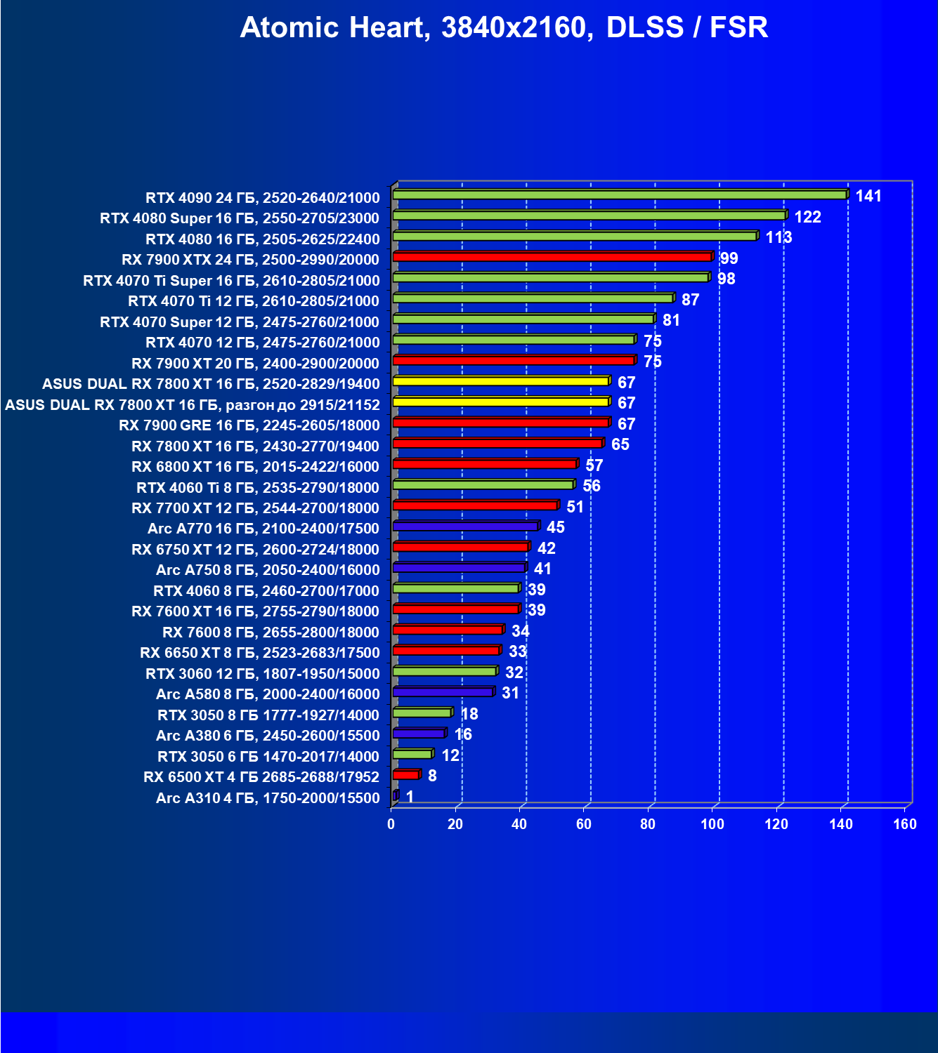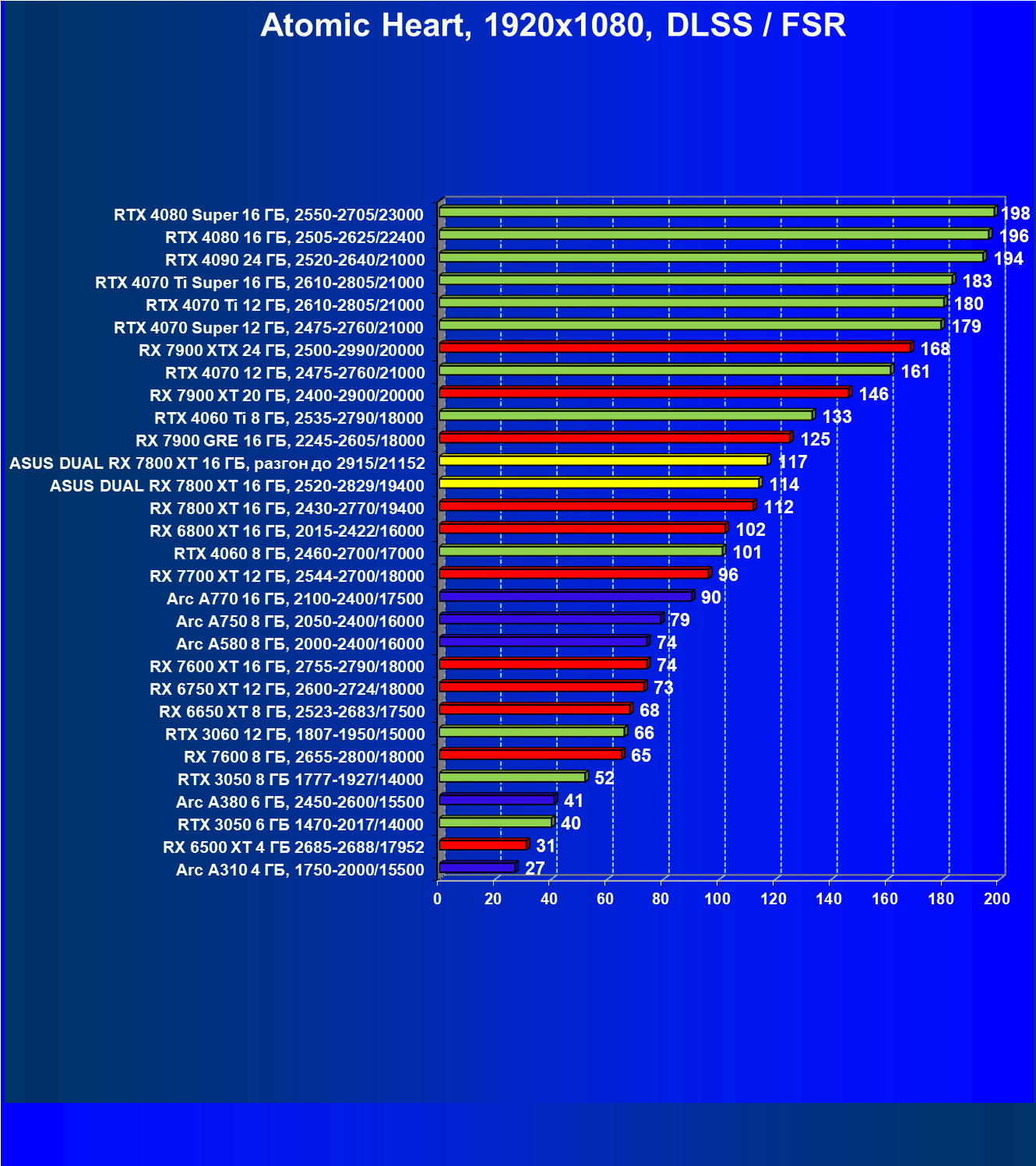 | 10 | Asus Dual RX 7800 XT 16 ГБ, разгон до 2915/21152 | 1156 | 203 | 57 000 |
