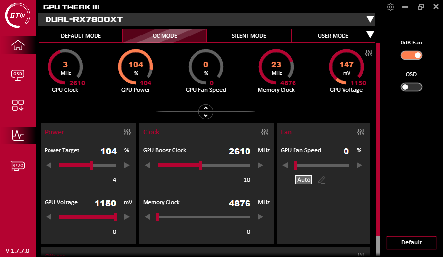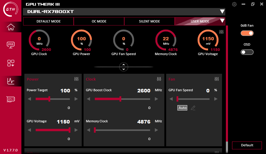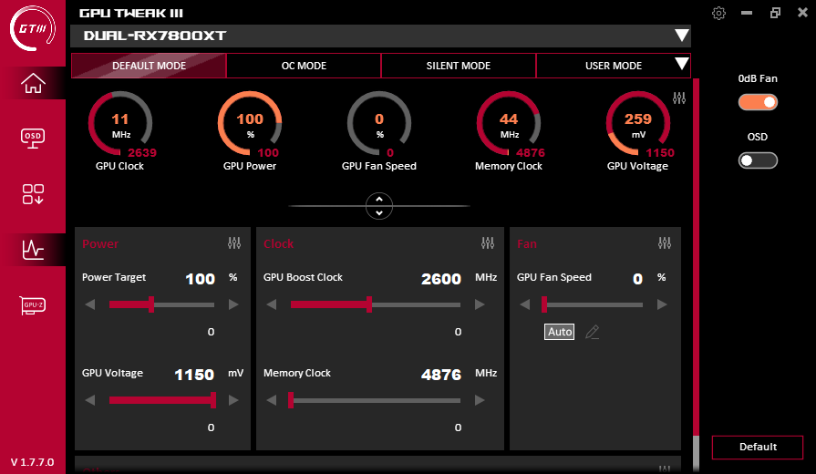 В простое режимы Performance Mode и Quiet Mode совершенно не отличались: в 2D температура была не выше 34 °C, вентиляторы не работали, уровень шума был равен фоновому — 18 дБА.