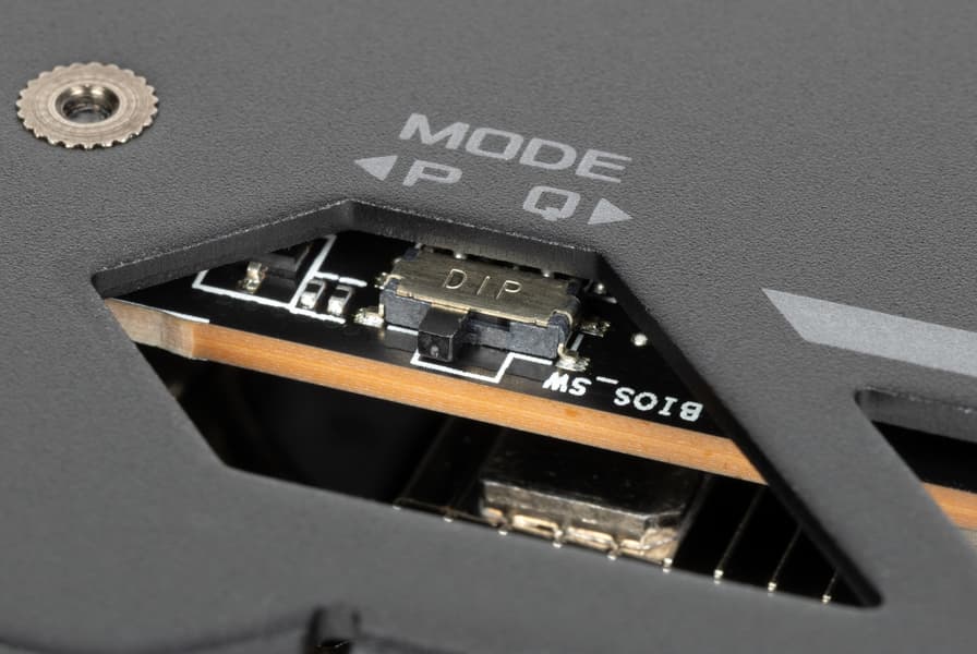 Удивительно было отметить, что карта имеет двойной BIOS, а эта особенность являлась традиционной только для топовых решений Asus. На торце карты есть переключатель версий BIOS (они названы Performance mode (PMode) и Quiet mode (QMode) — производительный и тихий режимы). Разница между режимами заключается, по сути, только в оборотах вентиляторов.