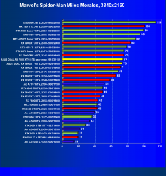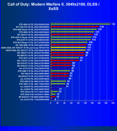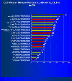 Рейтинг составлен по 9 тестам, в которых используется технология трассировки лучей и одновременно технология Nvidia DLSS, AMD FSR или Intel XeSS. Этот рейтинг нормирован по самому слабому ускорителю — Arc A310 (то есть сочетание скорости и функций Arc A310 приняты за 100%).