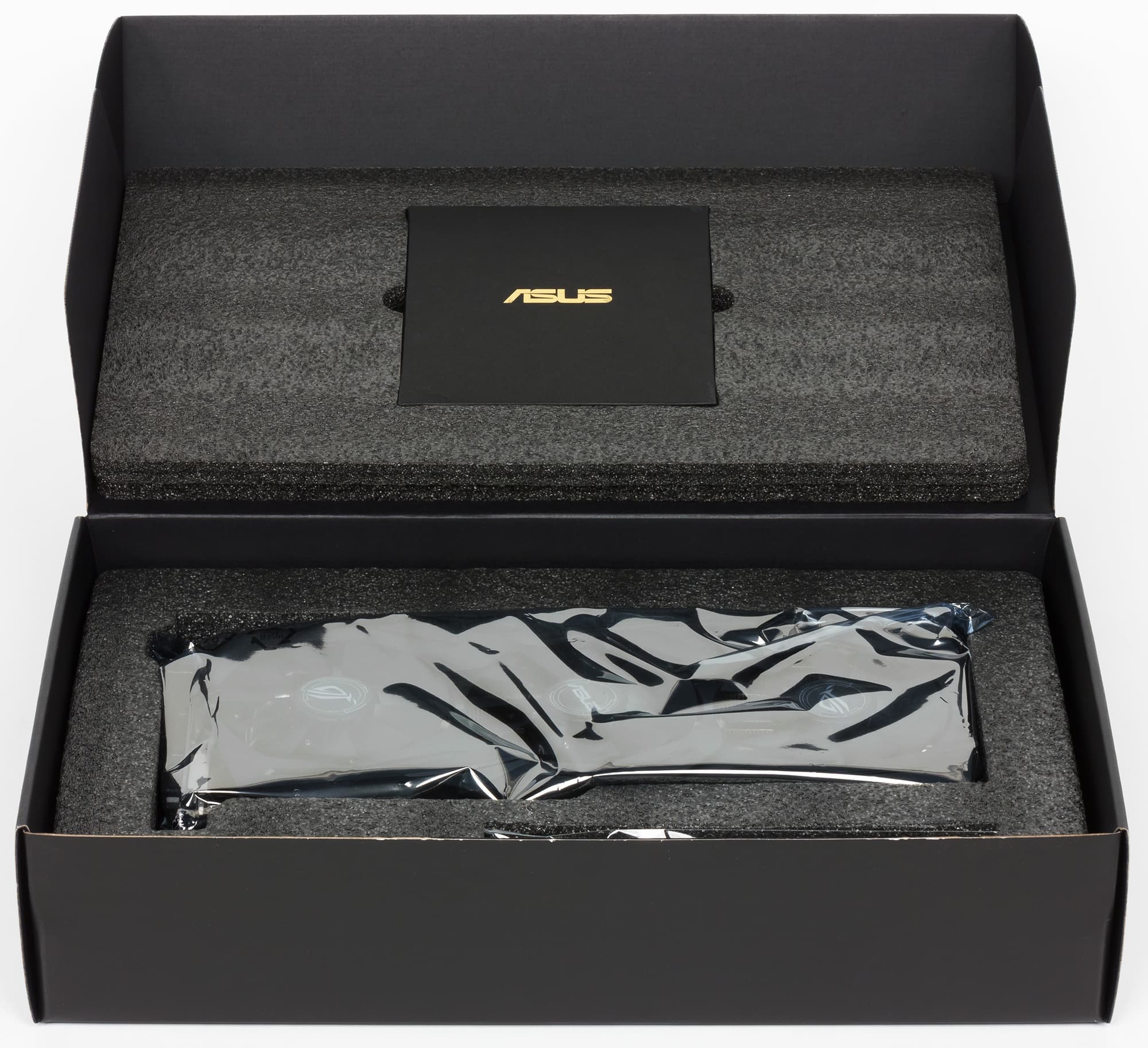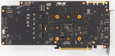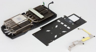 Главной частью кулера являются два пластинчатых никелированных радиатора, соединенные между собой тепловыми трубками, которые впрессованы в основание главного радиатора и обеспечивают равномерное распределение тепла по ребрам. Поверх радиаторов установлен кожух с тремя вентиляторами, работающими на одинаковой частоте вращения. Микросхемы памяти охлаждаются отдельной пластиной, прикрученной к печатной плате, а для охлаждения силовых транзисторов на втором радиаторе есть подошва с термоинтерфейсом. С оборотной стороны карта прикрывается специальной пластиной, которая не только обеспечивает жесткость печатной платы, но и имеет эффектную подсветку в виде логотипа ROG. Традиционно для карт этой серии кулер умеет останавливать вентиляторы при небольшом нагреве GPU (до 50-52 градусов), поэтому не стоит переживать, если при включении компьютера вентиляторы на кулере не вращаются. Они могут не запускаться и при длительной работе в режиме 2D.