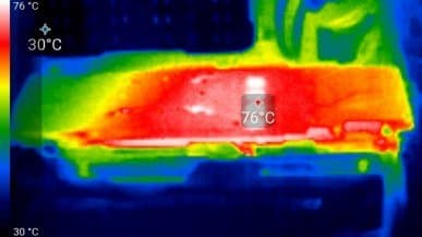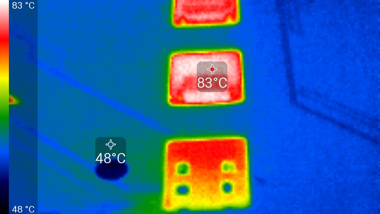 Максимальный нагрев — с обратной стороны печатной платы, над силовыми транзисторами.
