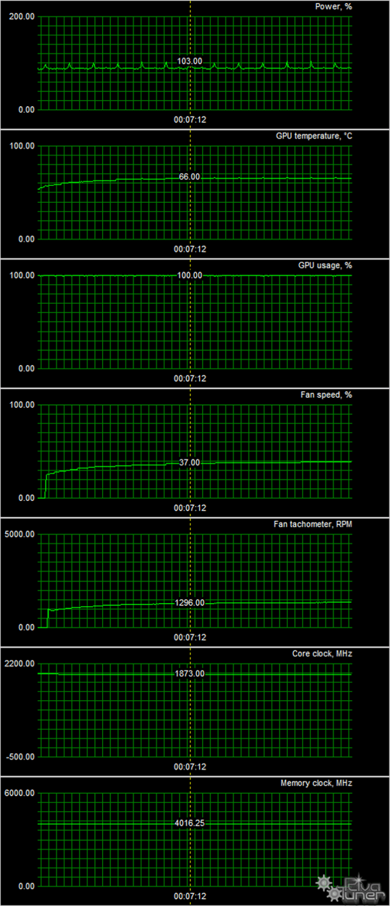 После 6-часового прогона под нагрузкой максимальная температура ядра не превысила 66 градусов, что является очень хорошим результатом для видеокарты такого уровня.