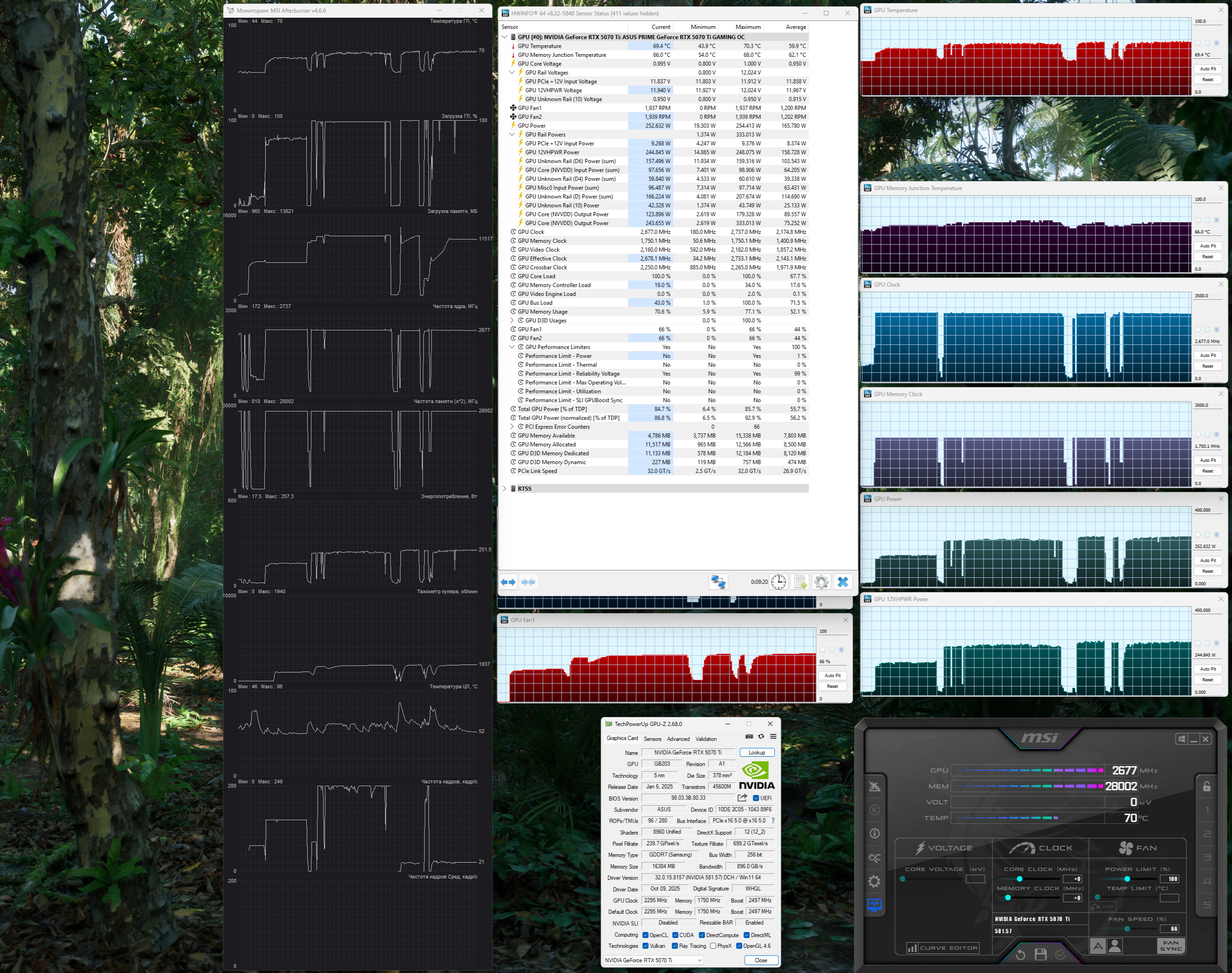| 02 | RTX 5070 Ti 16 ГБ, 2450—2790 МГц/28 ГТ/с | 1353 | 11497 | 85 000 |