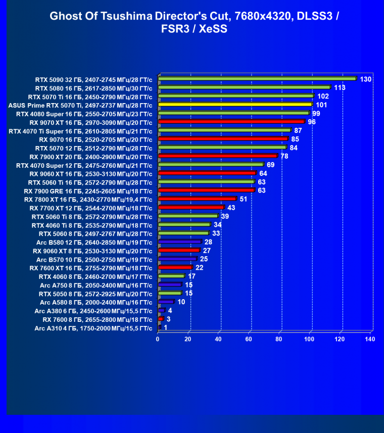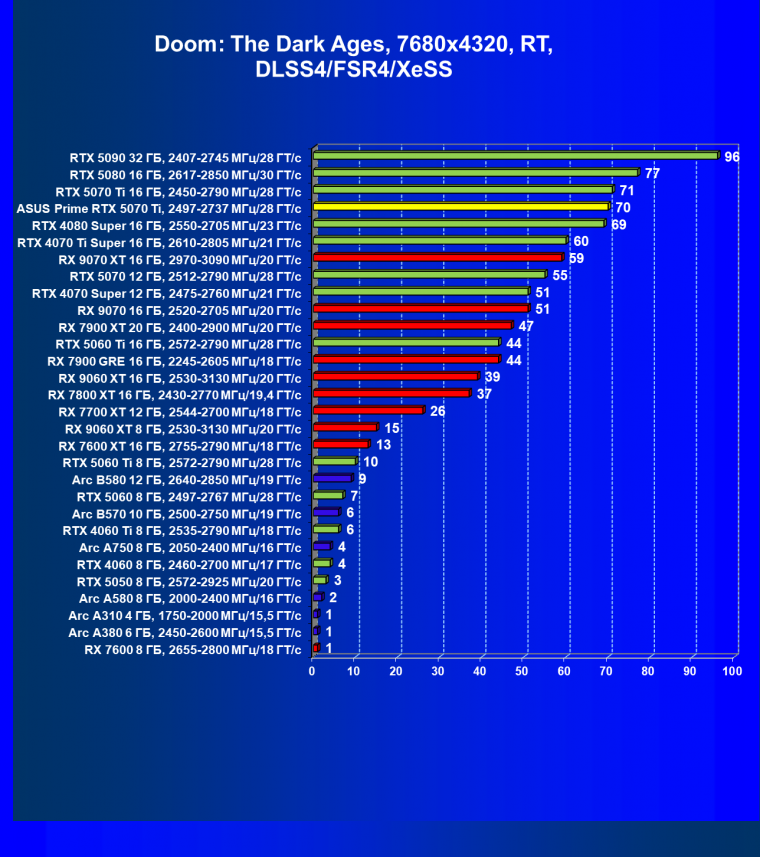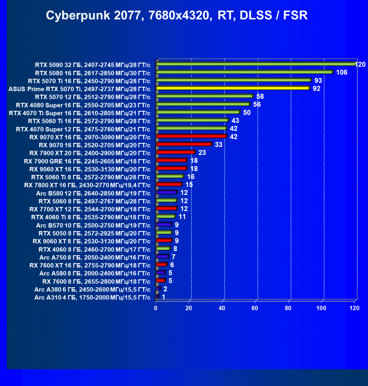| 04 | Asus Prime RTX 5070 Ti, 2497—2737 МГц/28 ГТ/с | 11468 | 1247 | 92 000 |