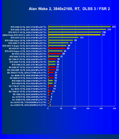 В играх с активным рейтрейсингом (и DLSS/FSR/XeSS) также можно играть с высокими настройками графики также во всех разрешениях, включая 4K, а в ряде игр использование динамического масштабирования (апскейлинга) не является необходимым для получения приятного комфорта. Использование же DLSS 3, не говоря уже о DLSS 4, обеспечит очень неплохую прибавку FPS (особенно в разрешении 8K, правда, наличие всего лишь 16 ГБ локальной видеопамяти уже может там стать ограничителем).