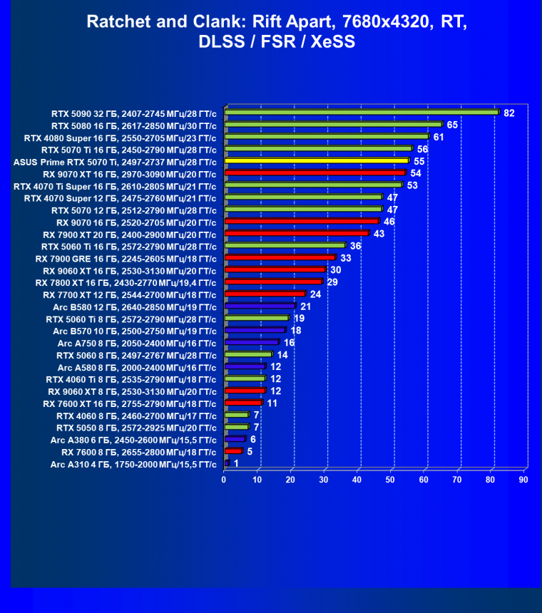 | 07 | RX 9070 XT 16 ГБ, 2970—3090 МГц/20 ГТ/с | 7729 | 1074 | 72 000 |
