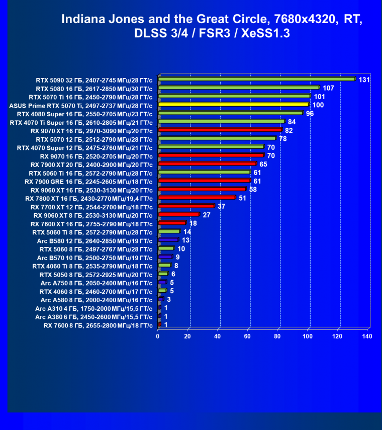 В среднем в разрешении 4K GeForce RTX 5070 Ti очень существенно опережает своего прямого предшественника RTX 4070 Ti Super, а также конкурента Radeon RX 7900 XT, немного отставая от RTX 4080 Super и RX 9070 XT. Карта Asus продемонстрировала почти равные с референсными аналогами результаты. Подчеркну, что в данном рейтинге учитываются только результаты в играх без включения RT.