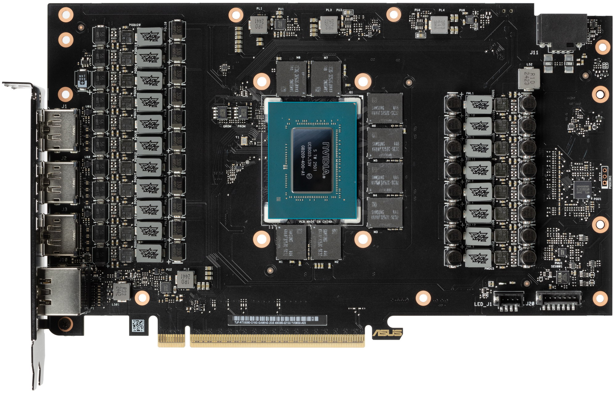 Мы сравниваем видеокарту Asus с аналогичным продуктом более высокого уровня, ибо по сути RTX 5070 Ti получается из RTX 5080 путем урезания ряда блоков в GPU. Беглый осмотр печатных плат говорит о том, что они весьма схожи. Отличия лишь в наборе некоторых компонентов и в количестве фаз питания.