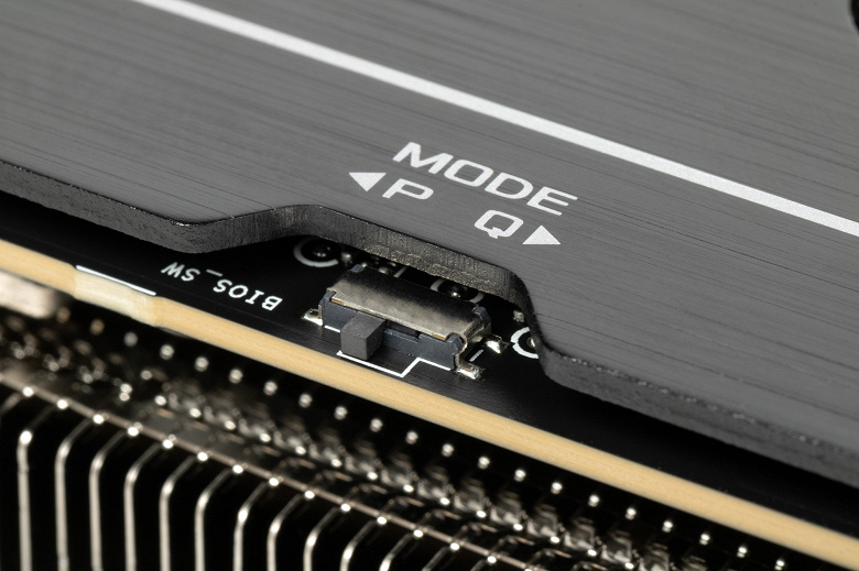 Карта имеет два режима работы, они заложены в двух вариантах BIOS, которые переключаются с помощью переключателя на переднем торце карты: P (Performance / производительный) и Q (Quiet / тихий). Разница между режимами заключается, по сути, только в оборотах вентиляторов, да и та не сильно велика.