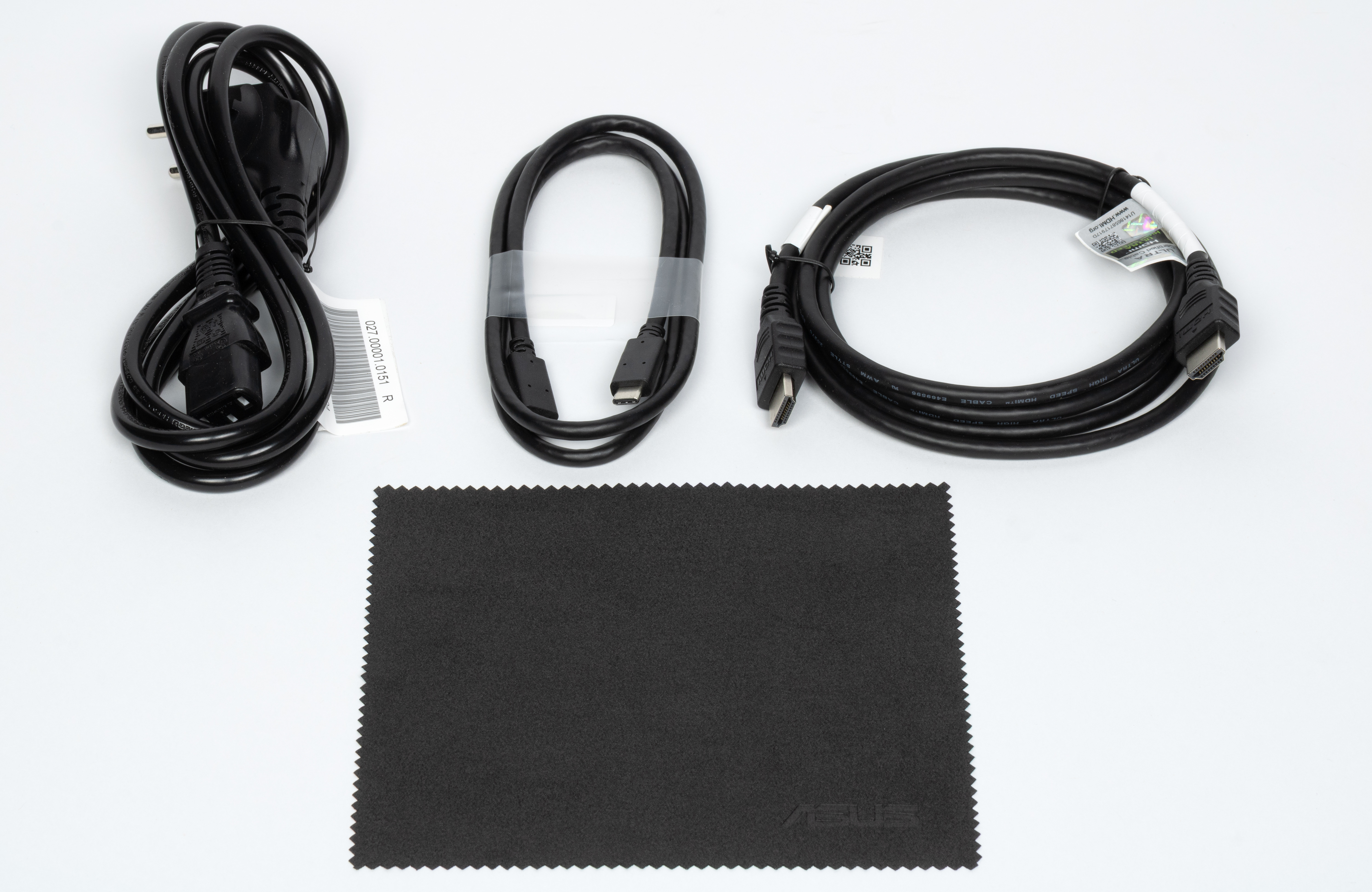 К монитору прилагается комплект кабелей черного цвета и салфетка из микрофибры.