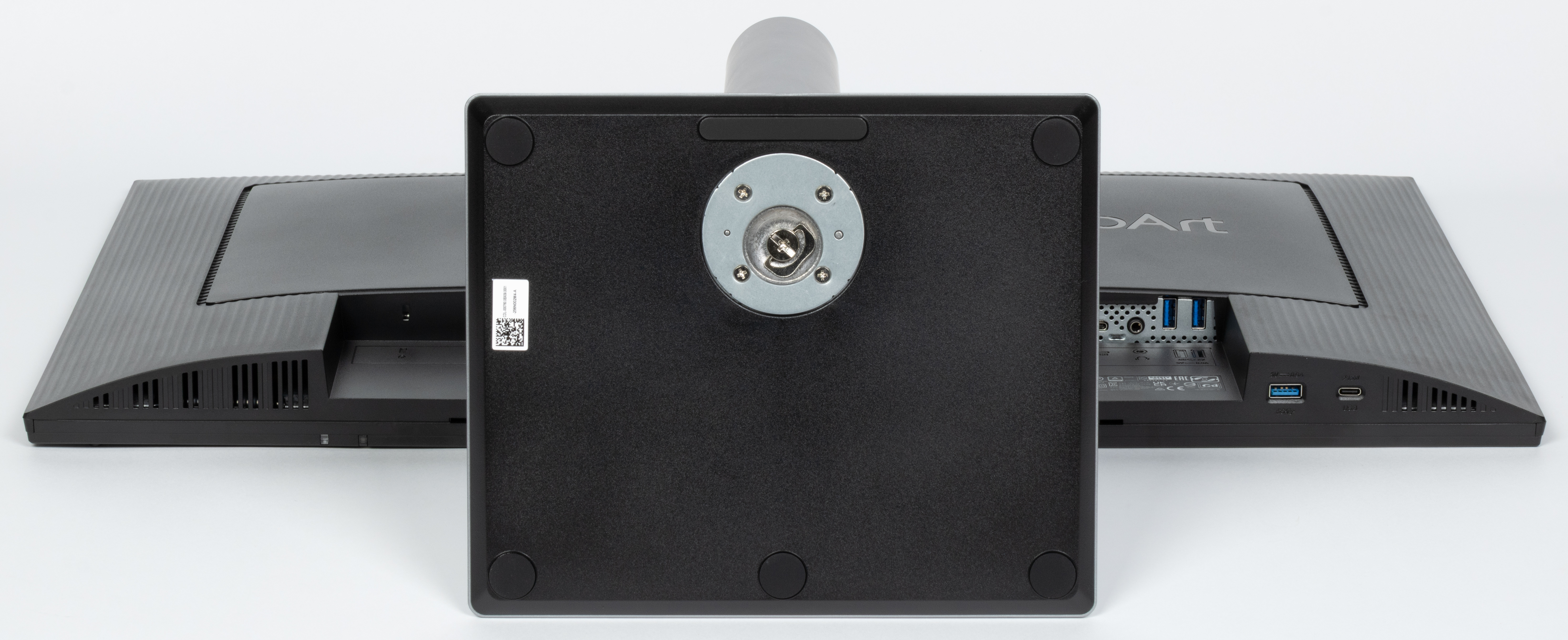 Многочисленные вентиляционные решетки сзади и на торце ниши с разъемами способствуют охлаждению внутренностей монитора. Где-то за задней панелью находятся два встроенных громкоговорителя.